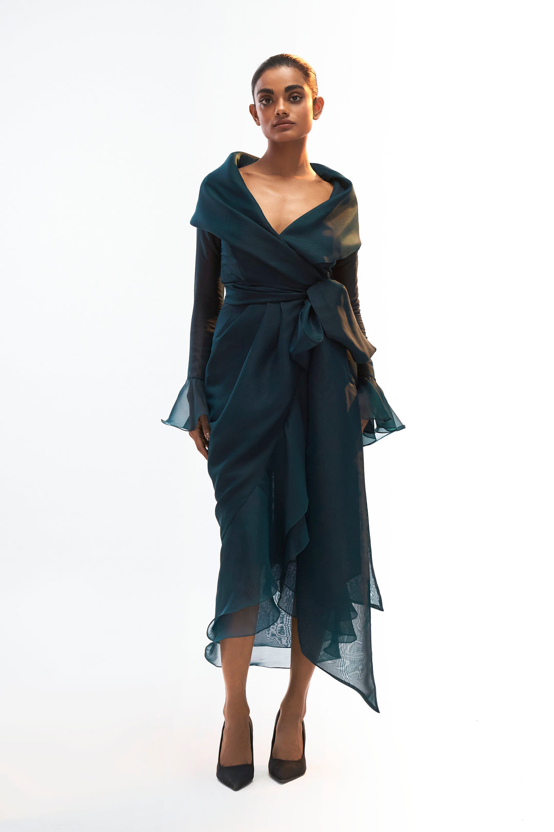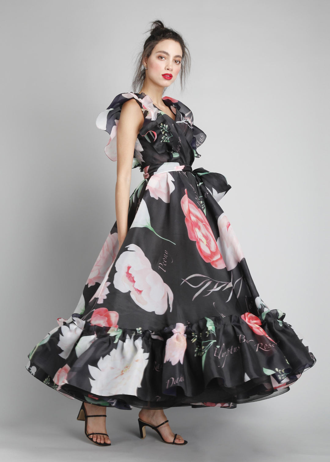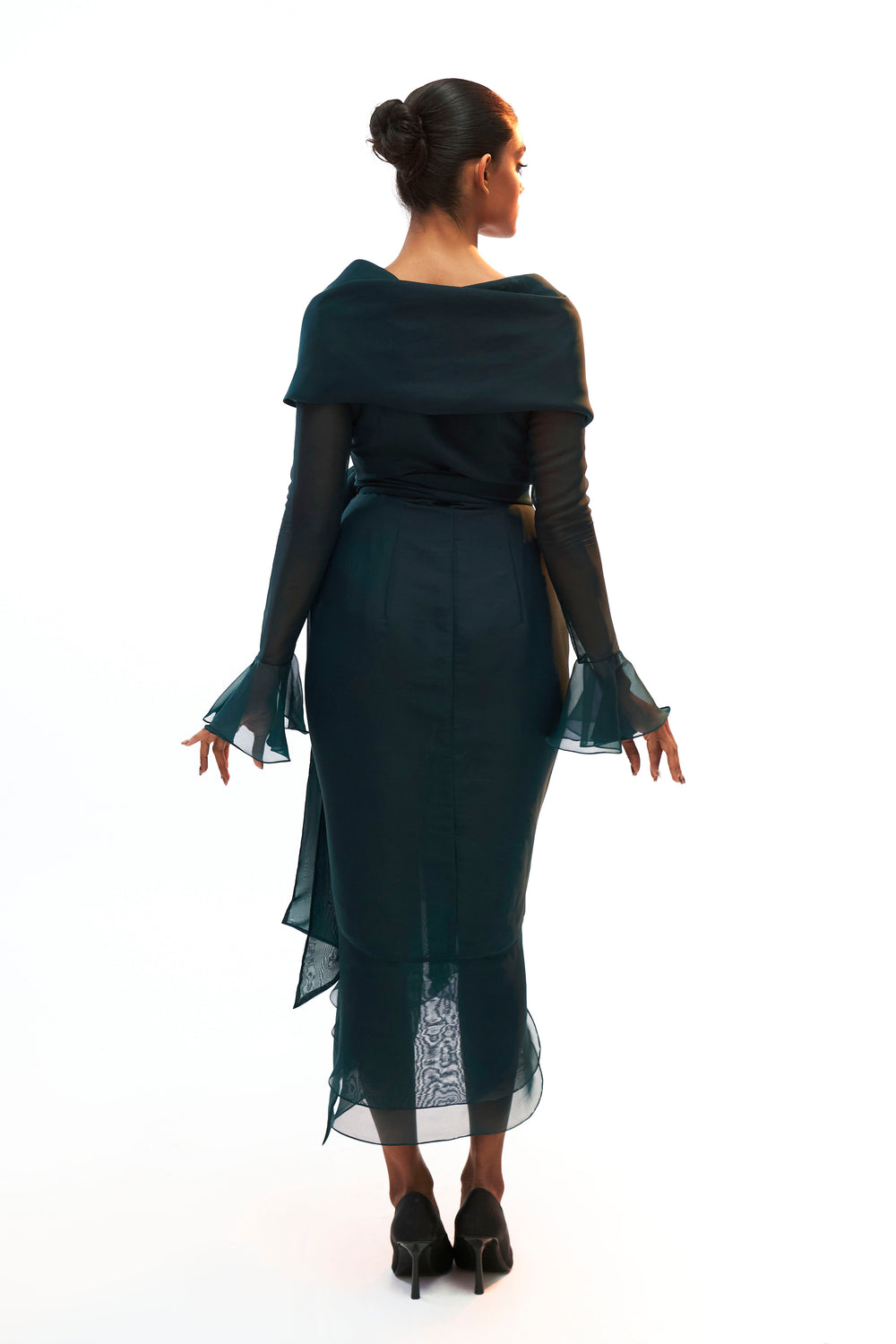 Strapless Draped Midi with Ruffle Detailing on Bust and Hem
