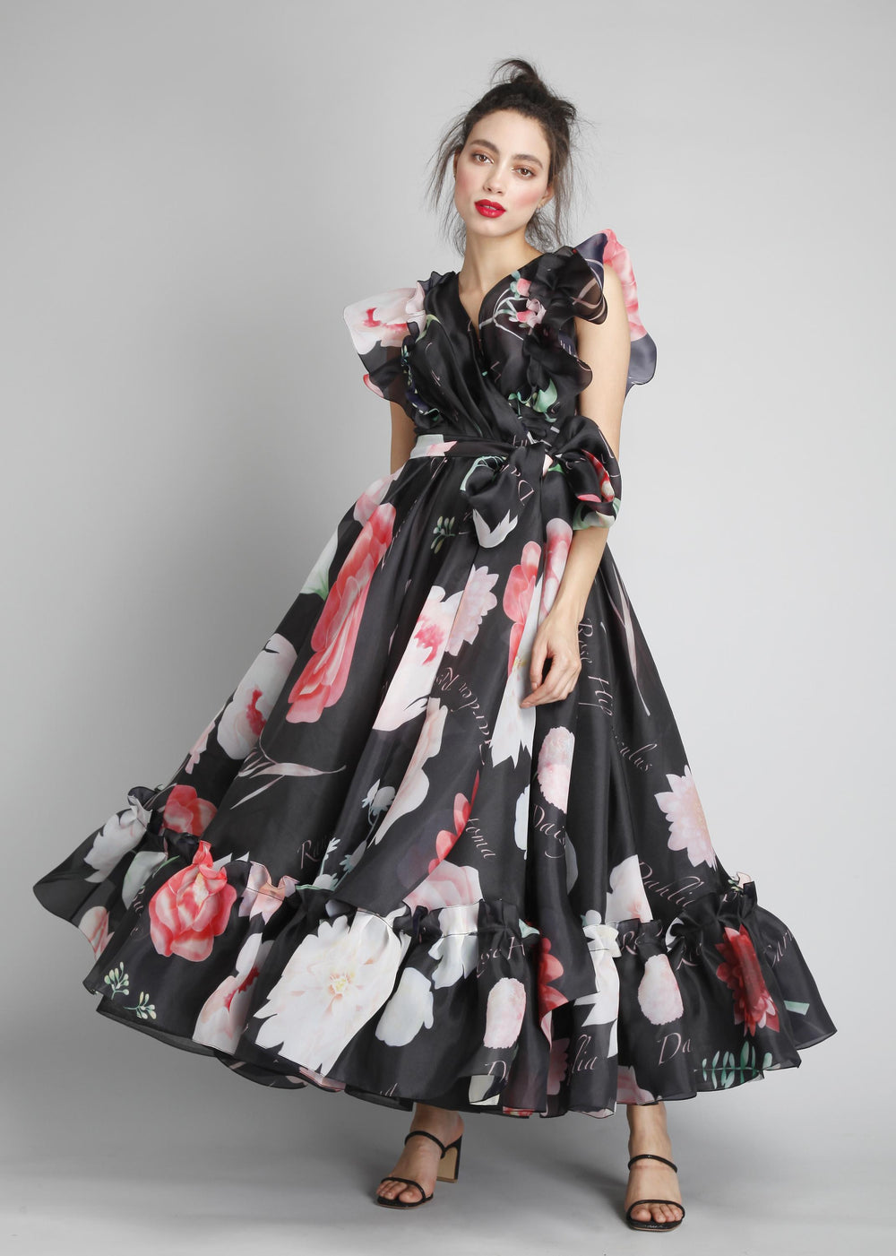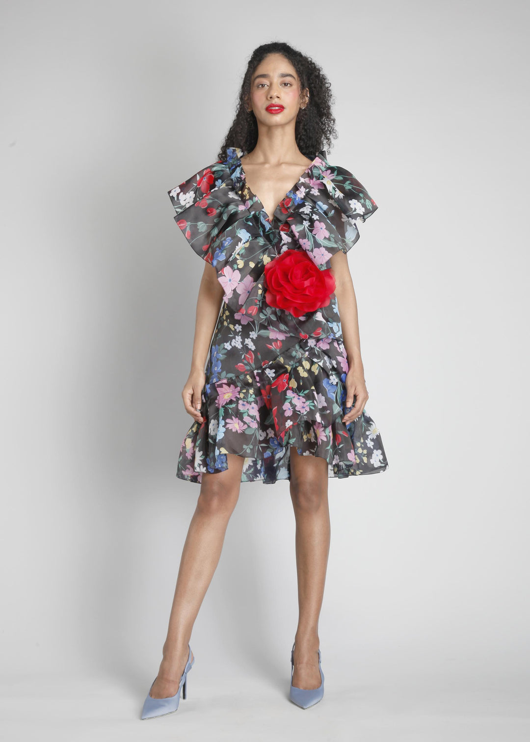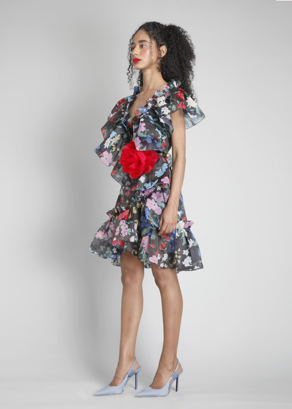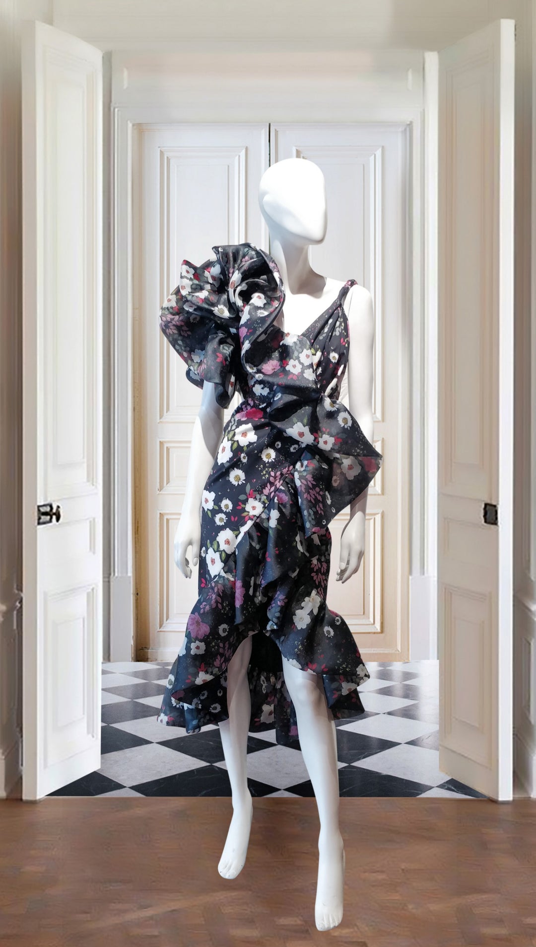 Strapless Draped Midi with Ruffle Detailing on Bust and Hem