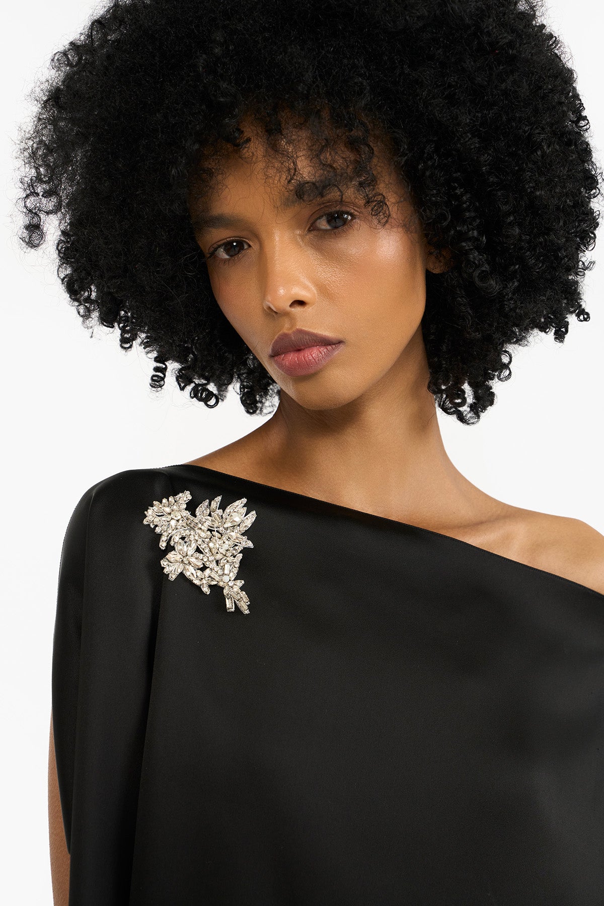 Boat neck top with droped waisted tie up shash paired with staright leg pants and crystal embellishment