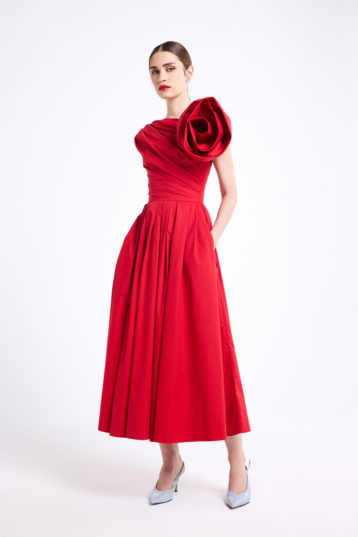 ASYMMETRICAL NECK DRAPED MIDI WITH SCULPTED FLOWER ON SHOULDER