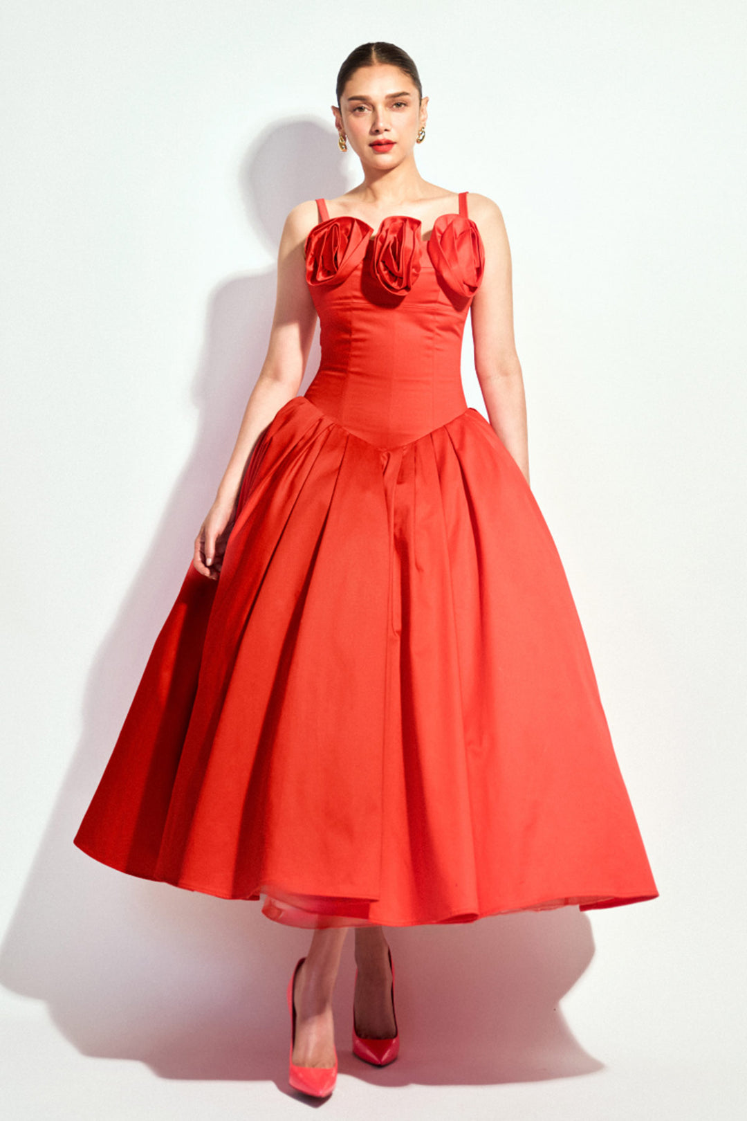 Midi Dress With Pointed Corset And Roses On Bust In A Scarlet Red