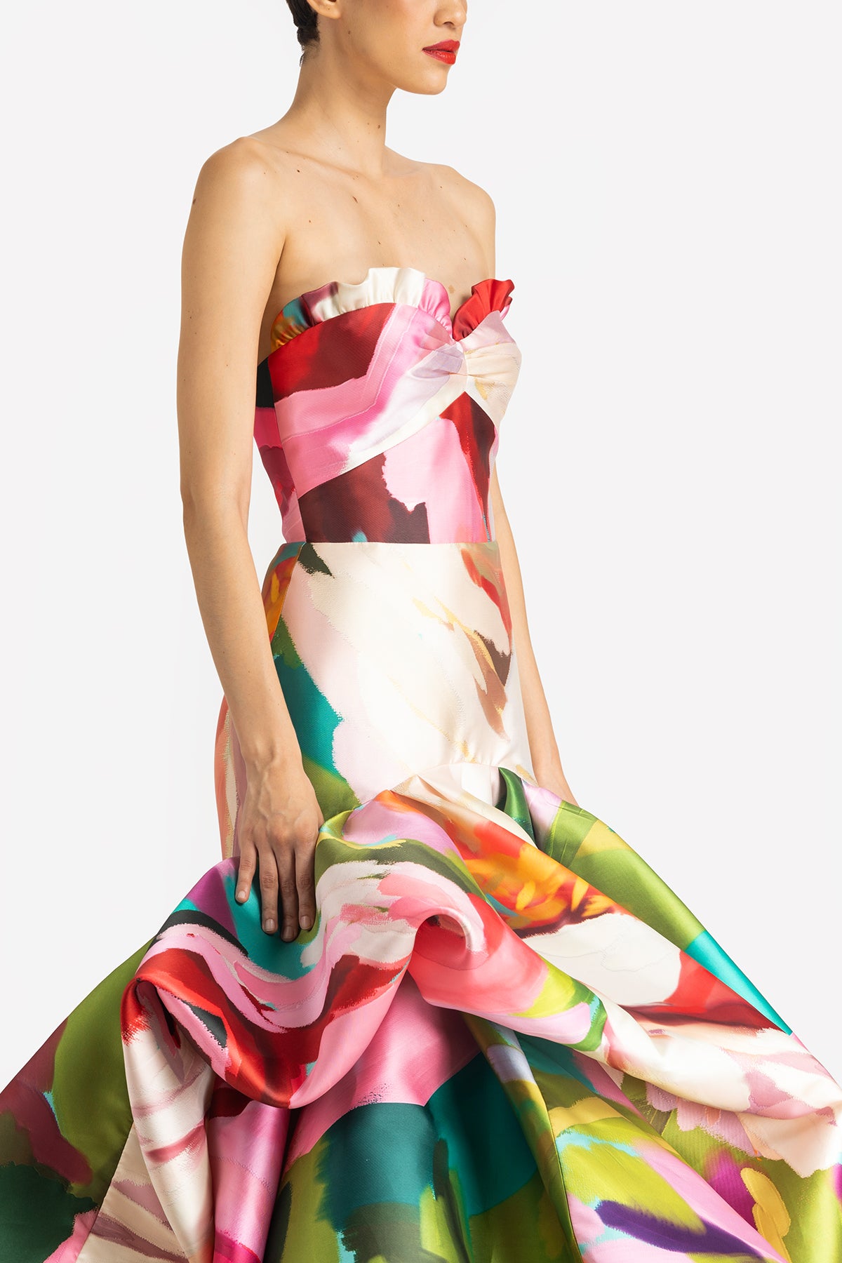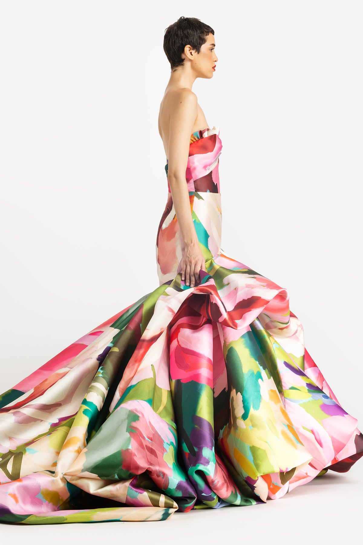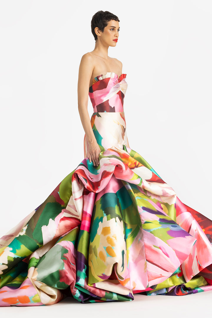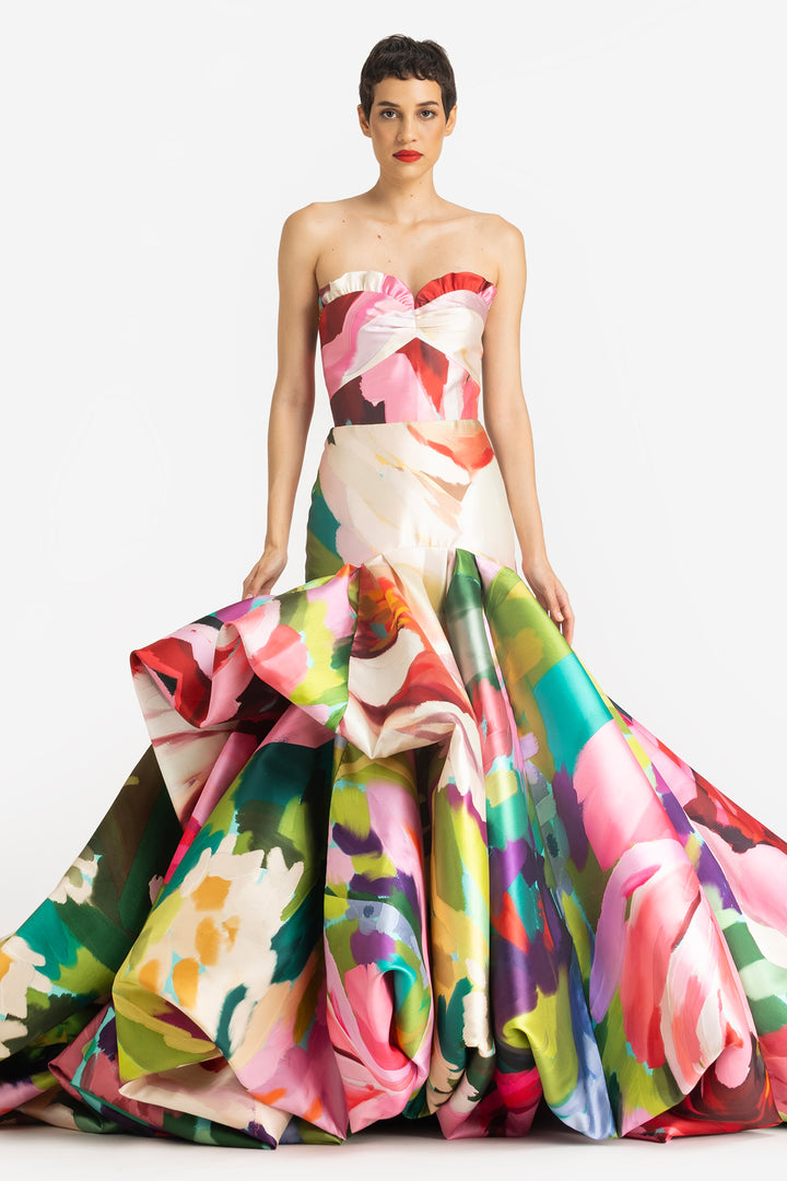 Strapless Balloon Hem Gown in A Wild Rose Print.