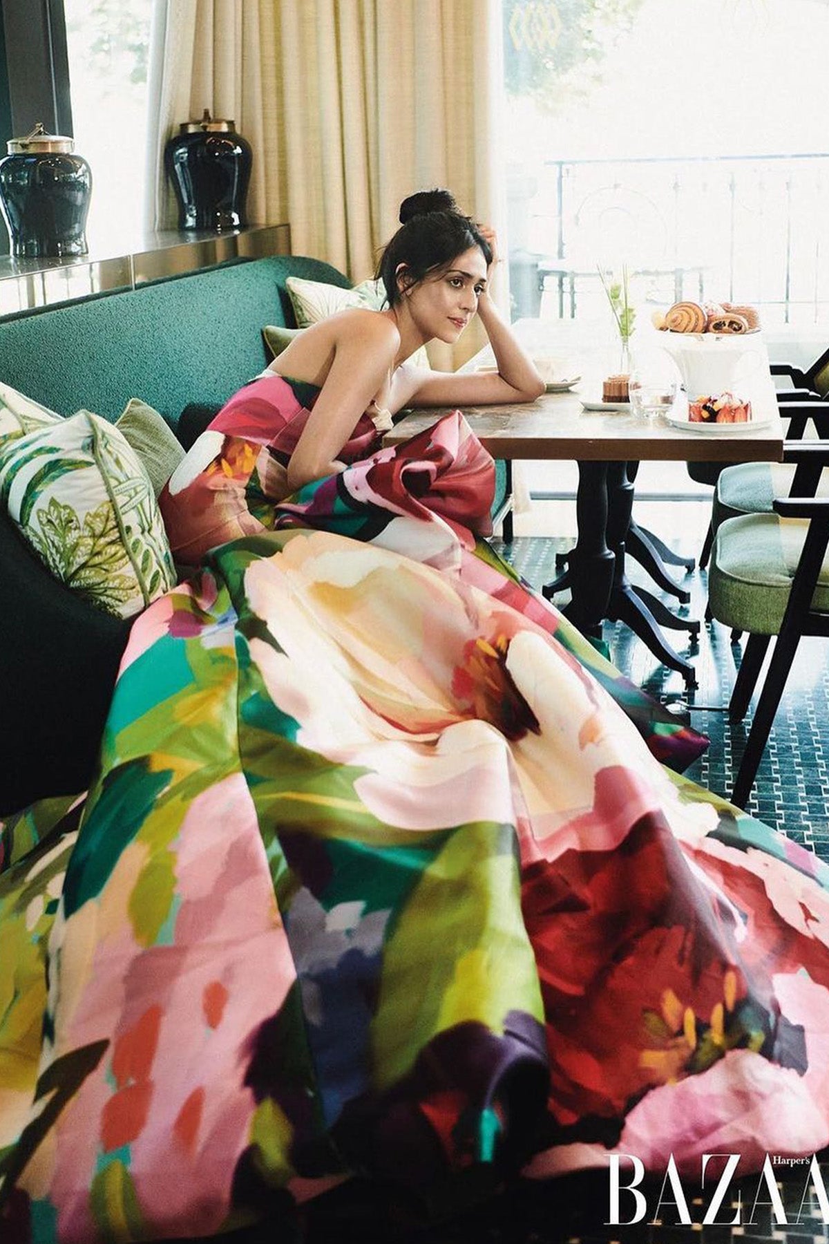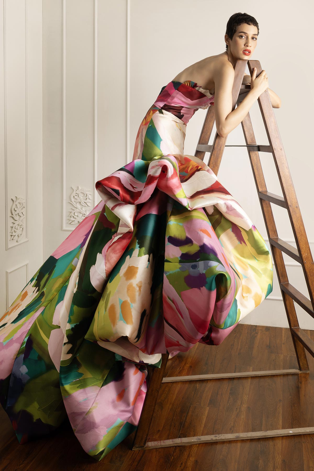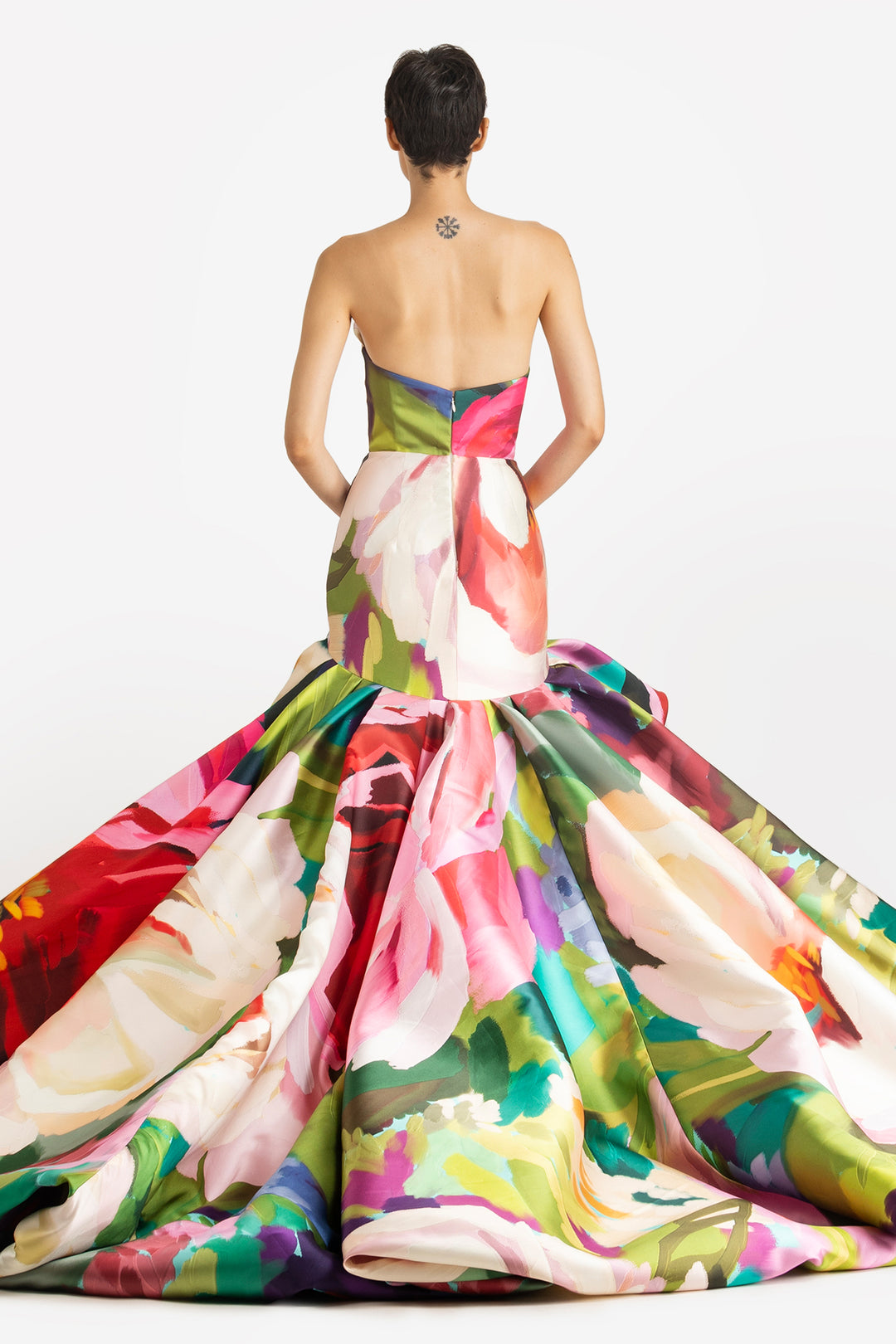Strapless Balloon Hem Gown in A Wild Rose Print.