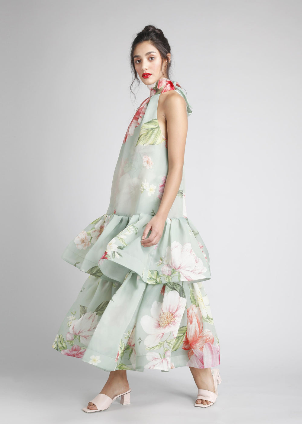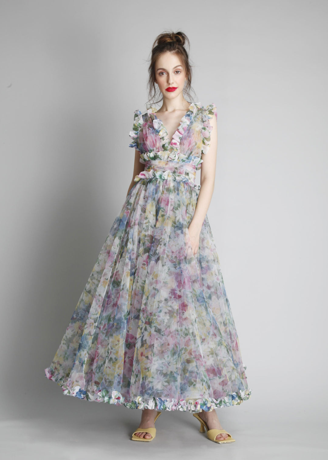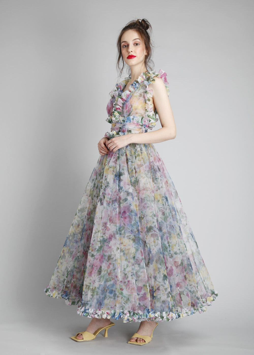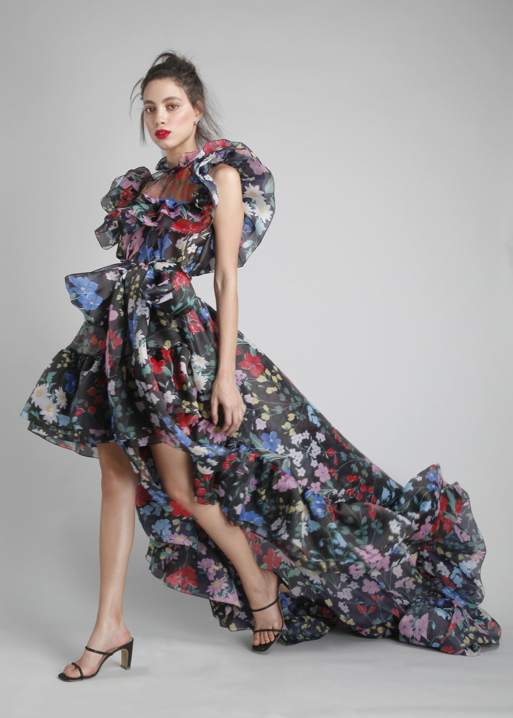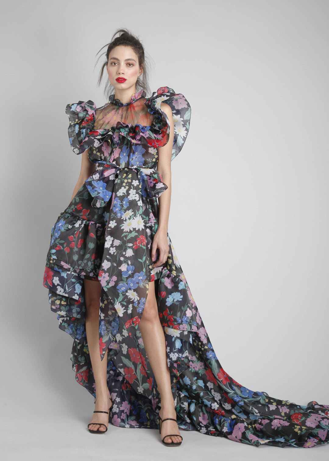 Sheer square neck ruffled high low Anjali dress in plumetis organza