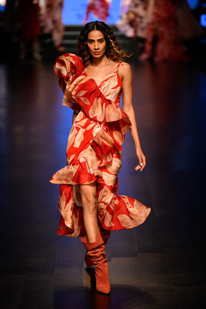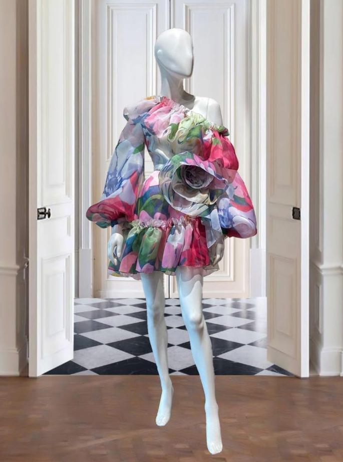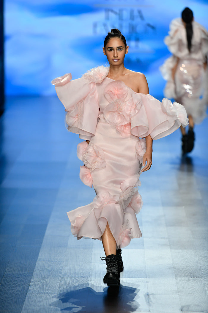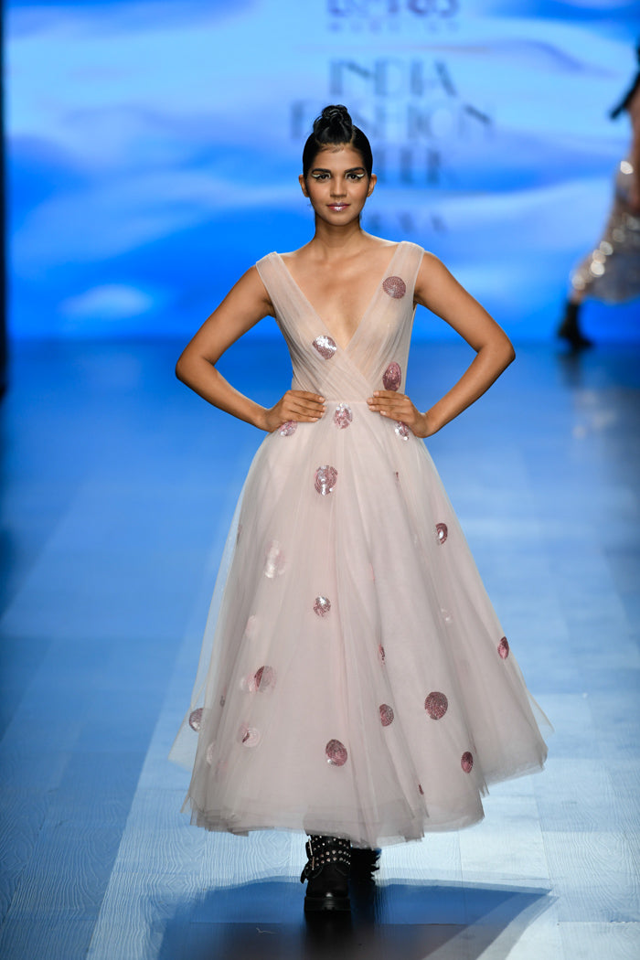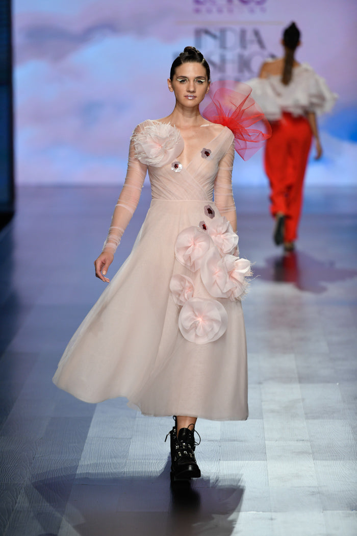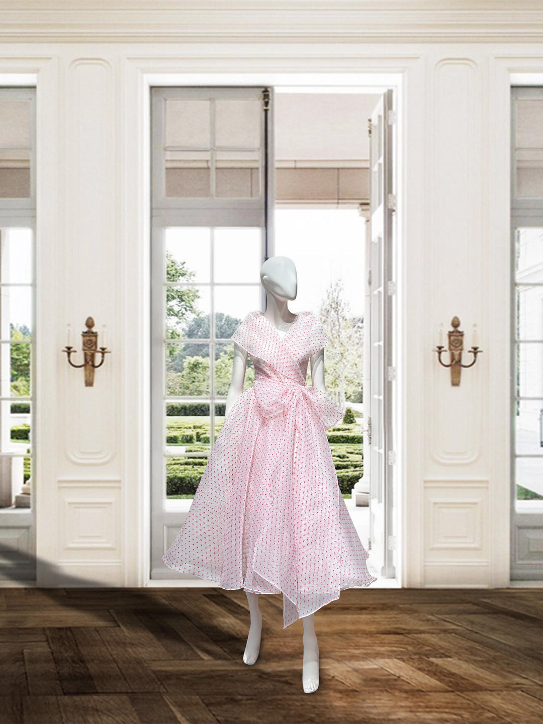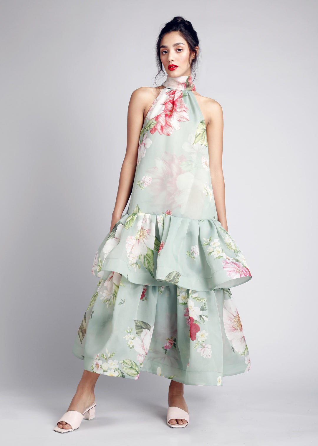 Sheer square neck ruffled high low Anjali dress in plumetis organza
