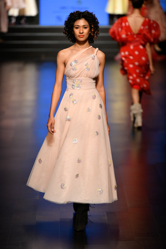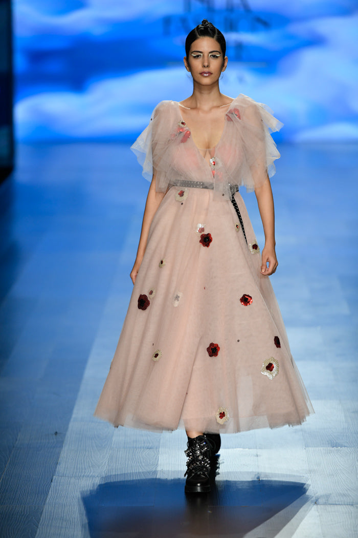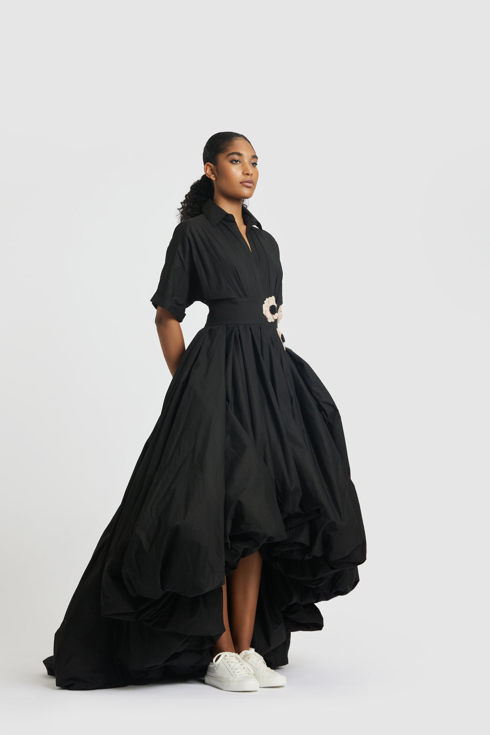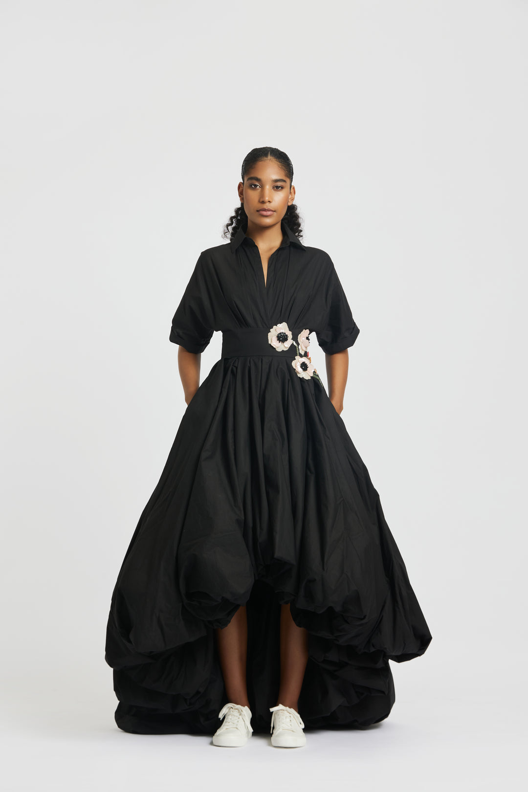 Moon embroidery - corsetted puff sleeves fit and flare dress