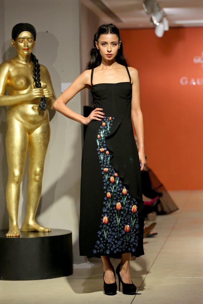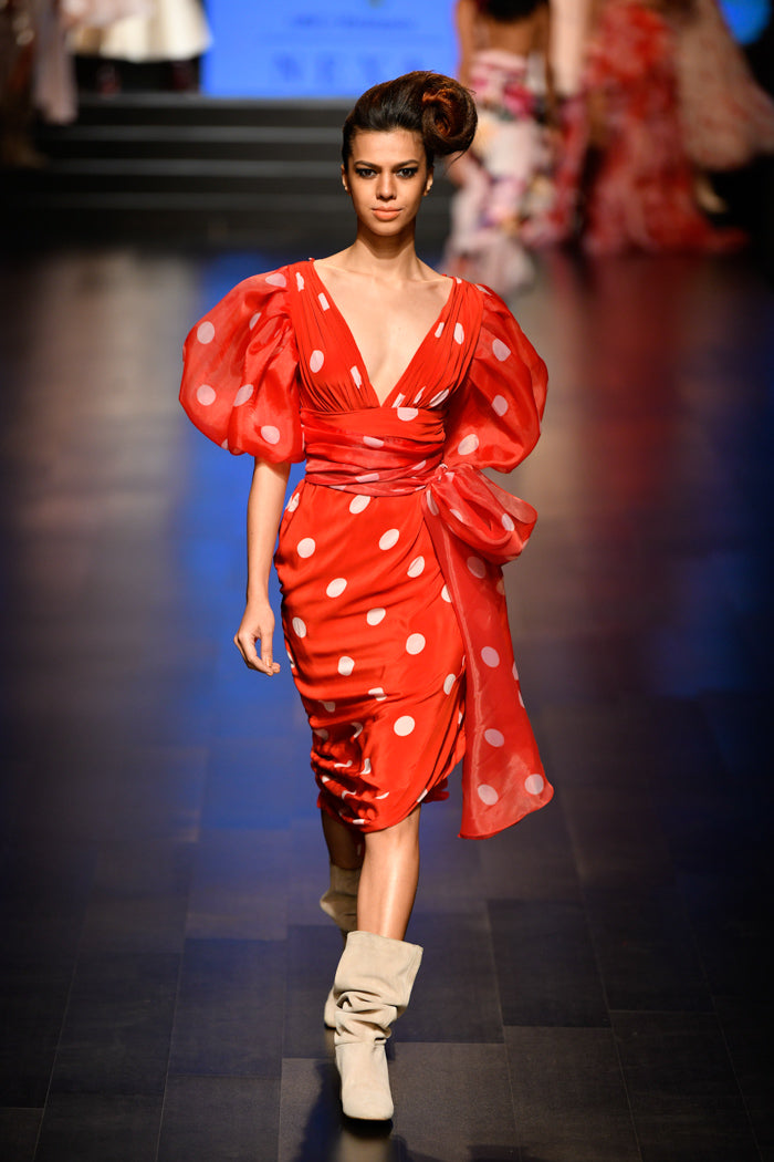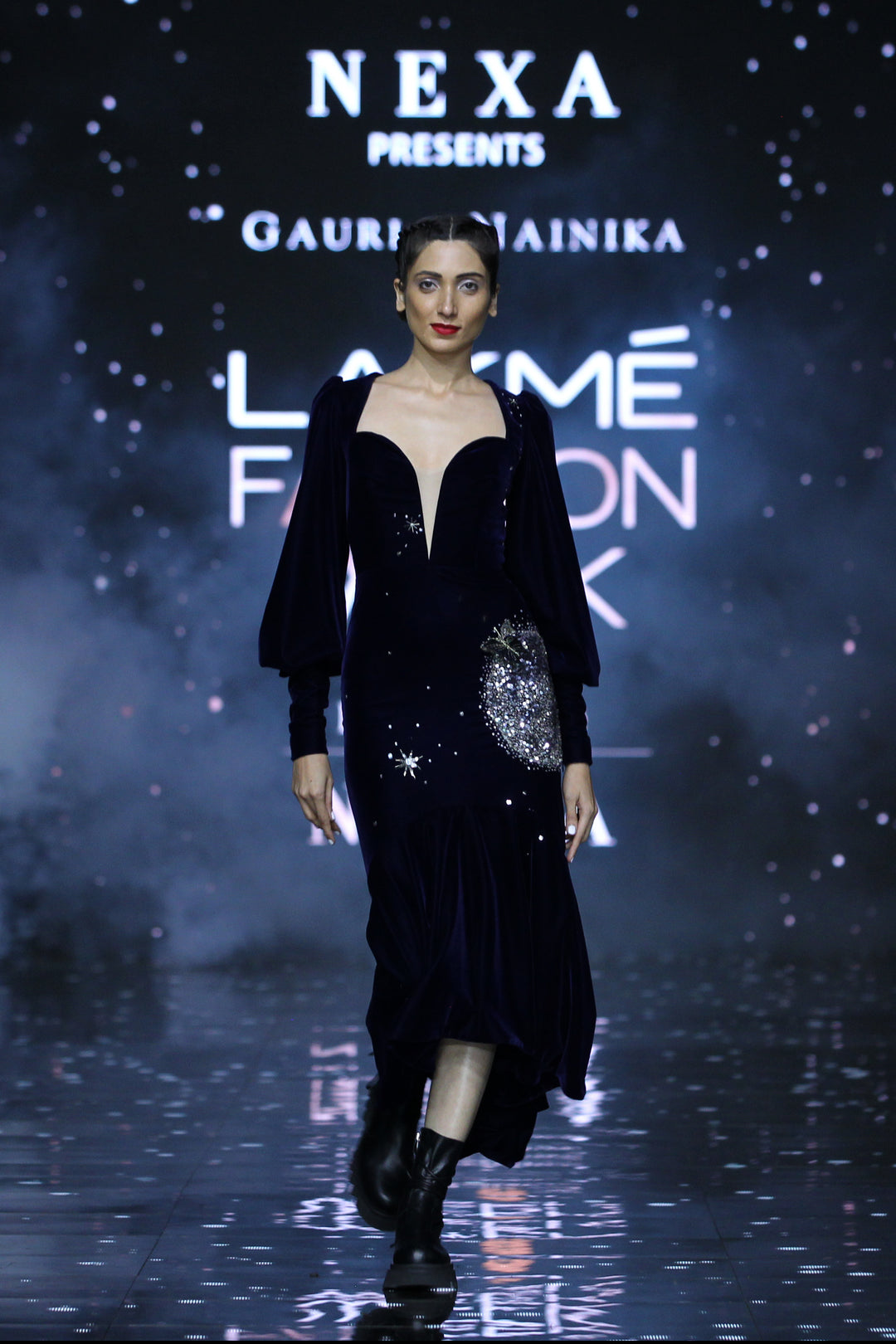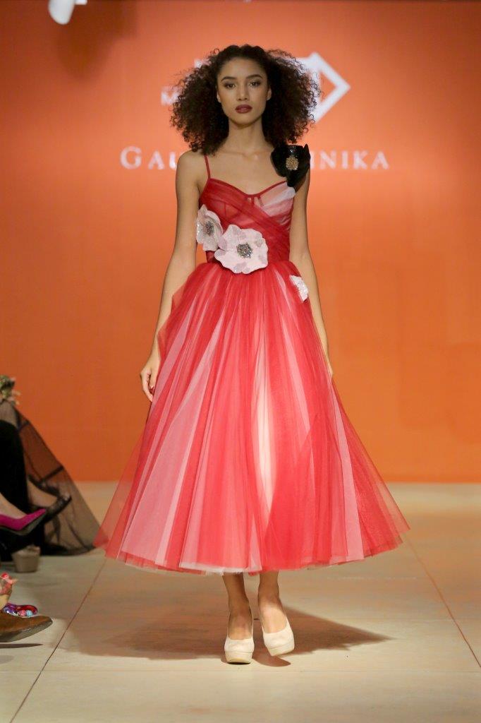 Moon embroidery - corsetted puff sleeves fit and flare dress