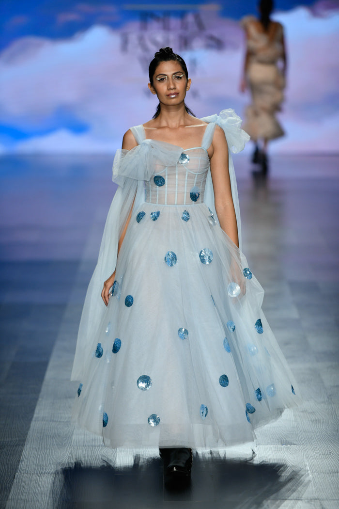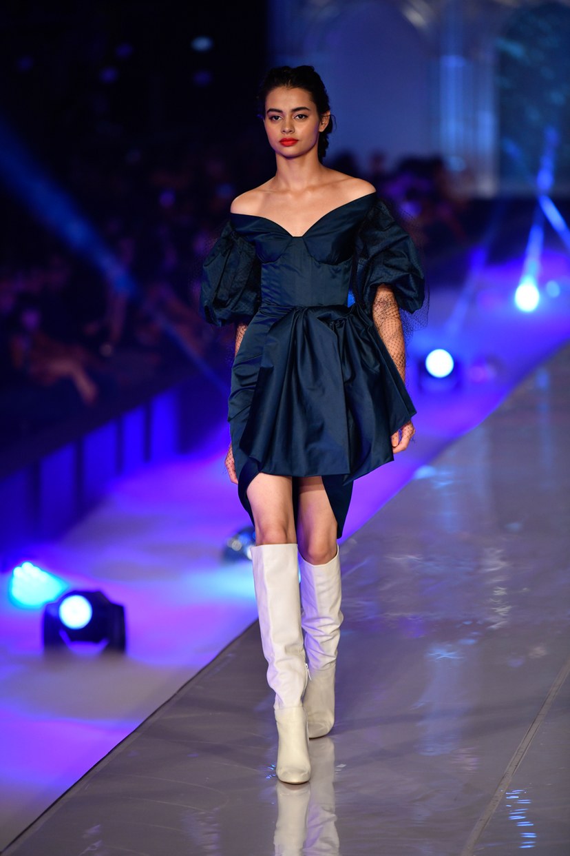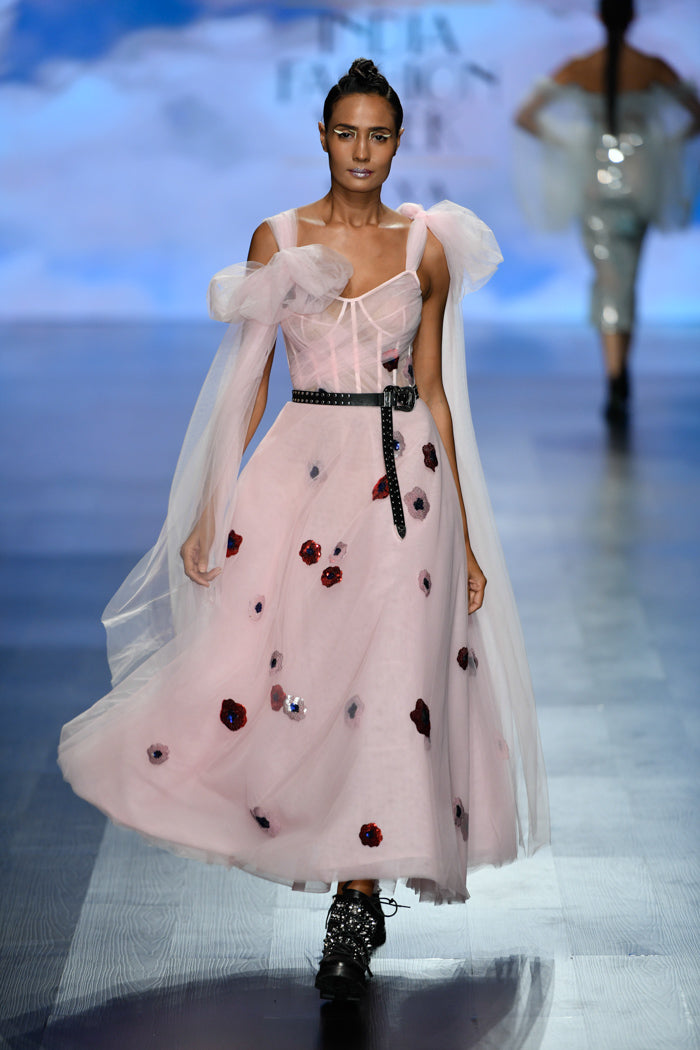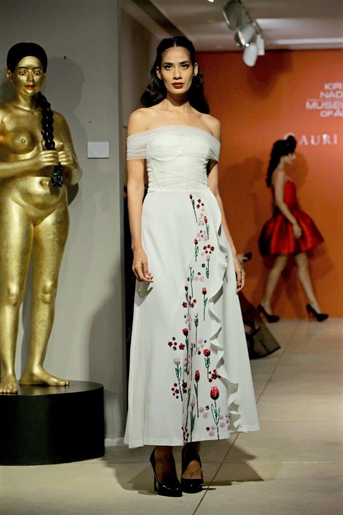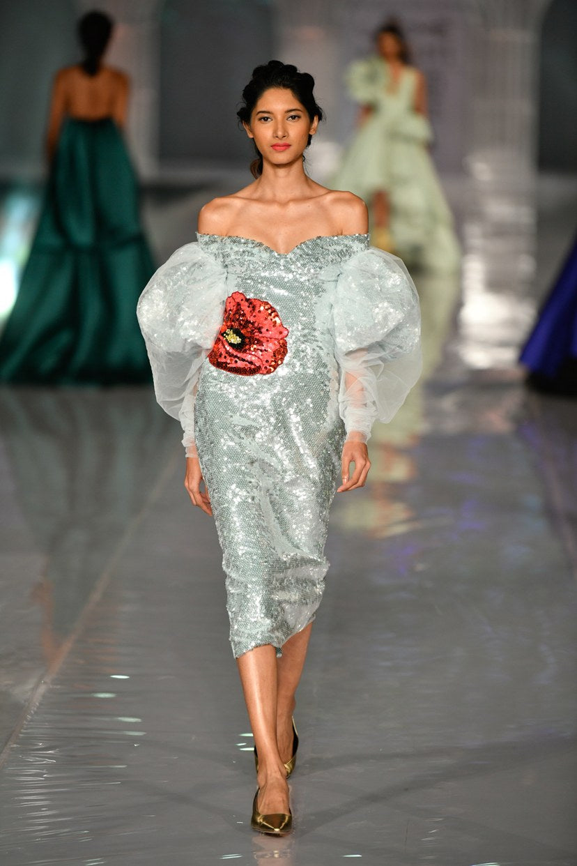 Off shoulder corsetted pouff sleeves dress with ruched net sleeves and emb.