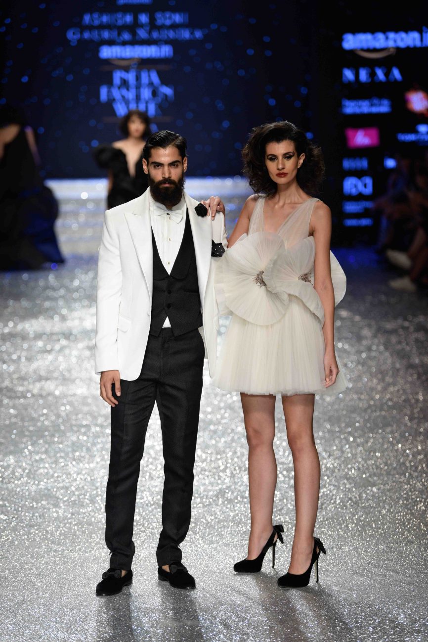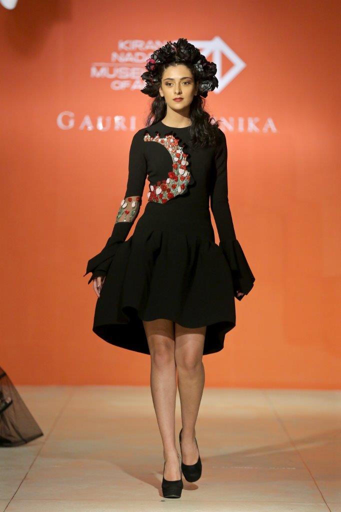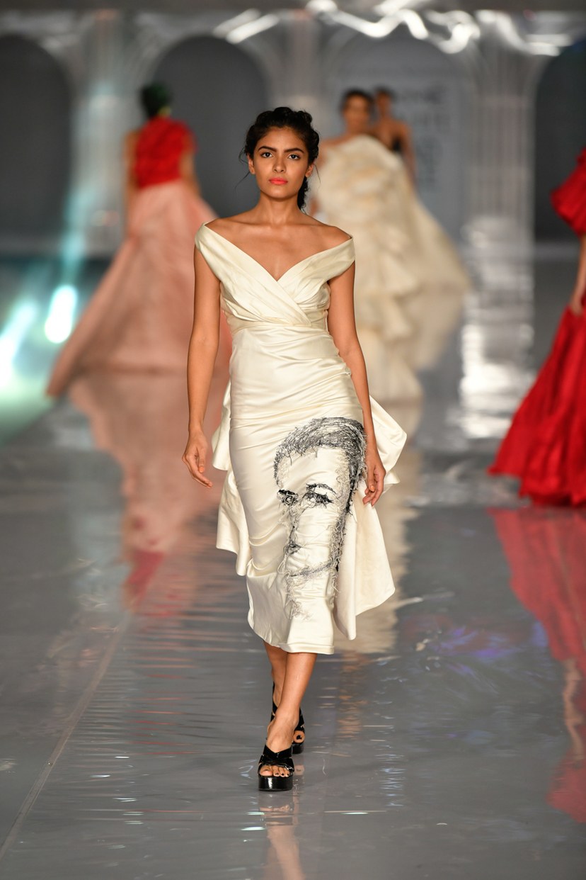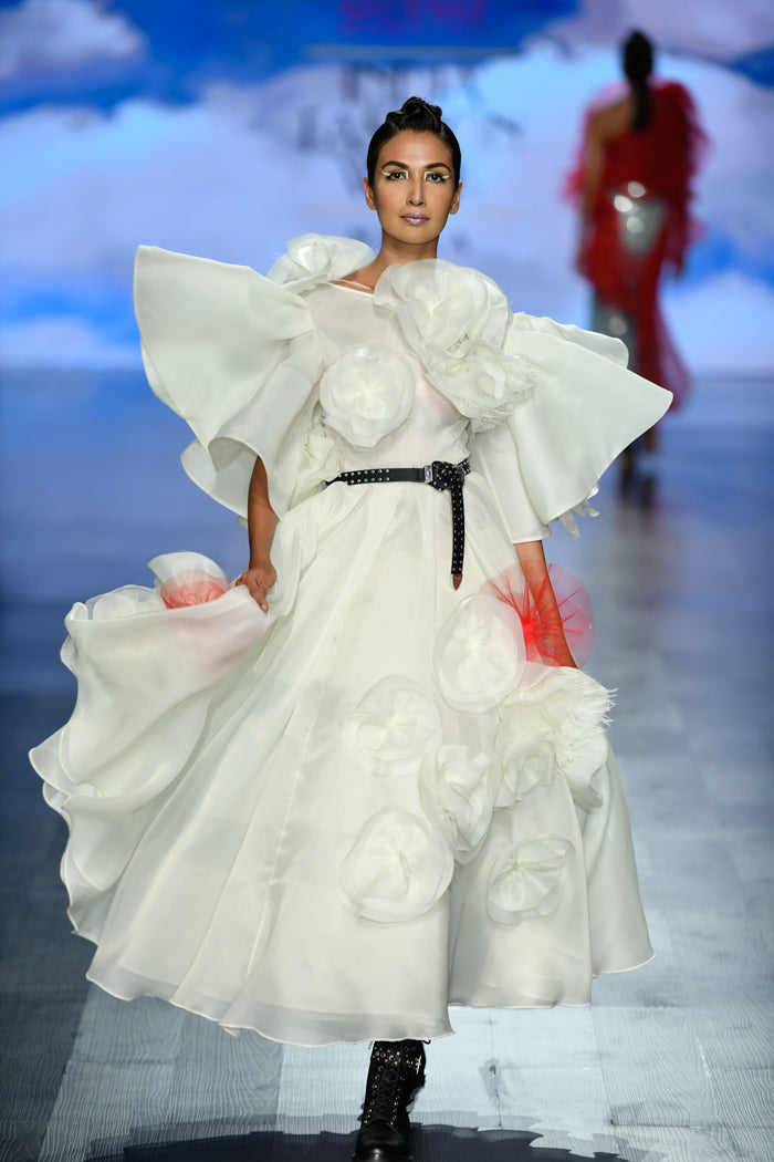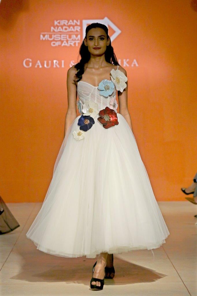 Off shoulder corsetted pouff sleeves dress with ruched net sleeves and emb.
