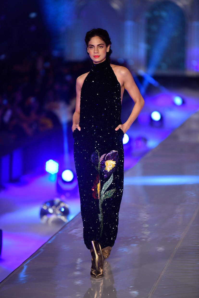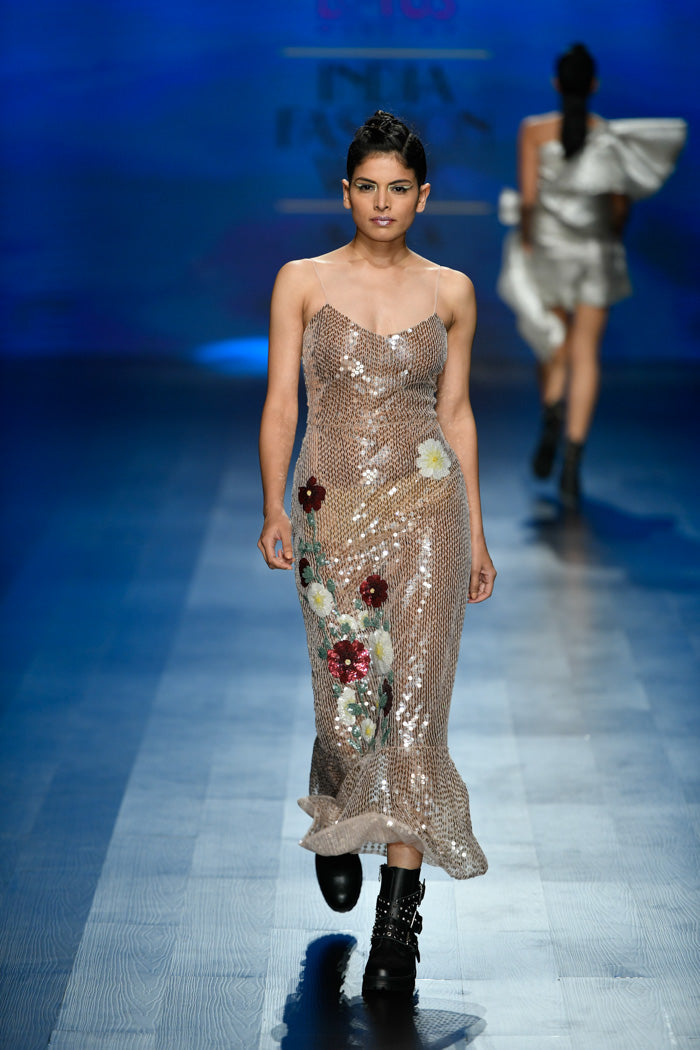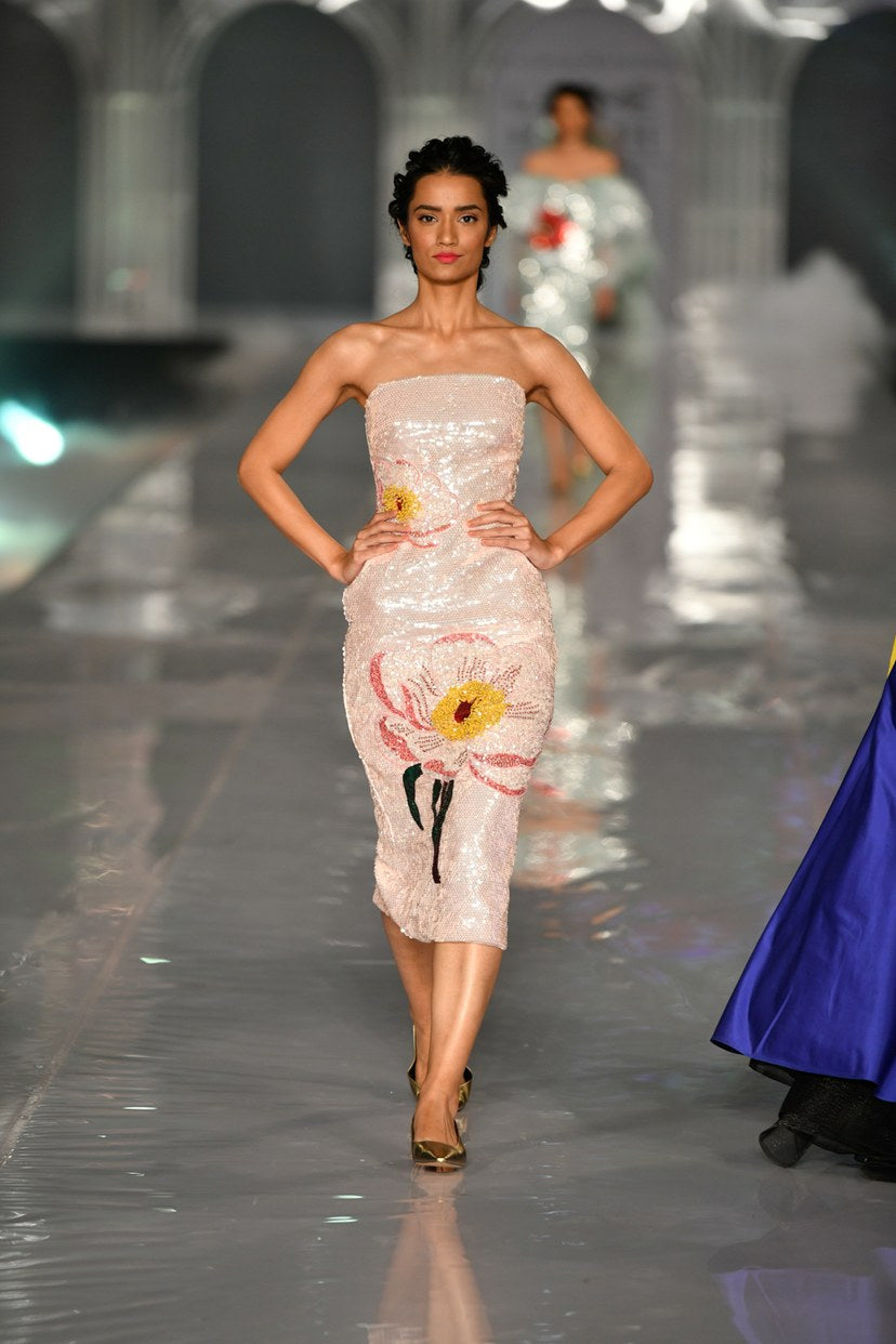 One shoulder twisted strap sequin petals tea length dress with draped upperbody