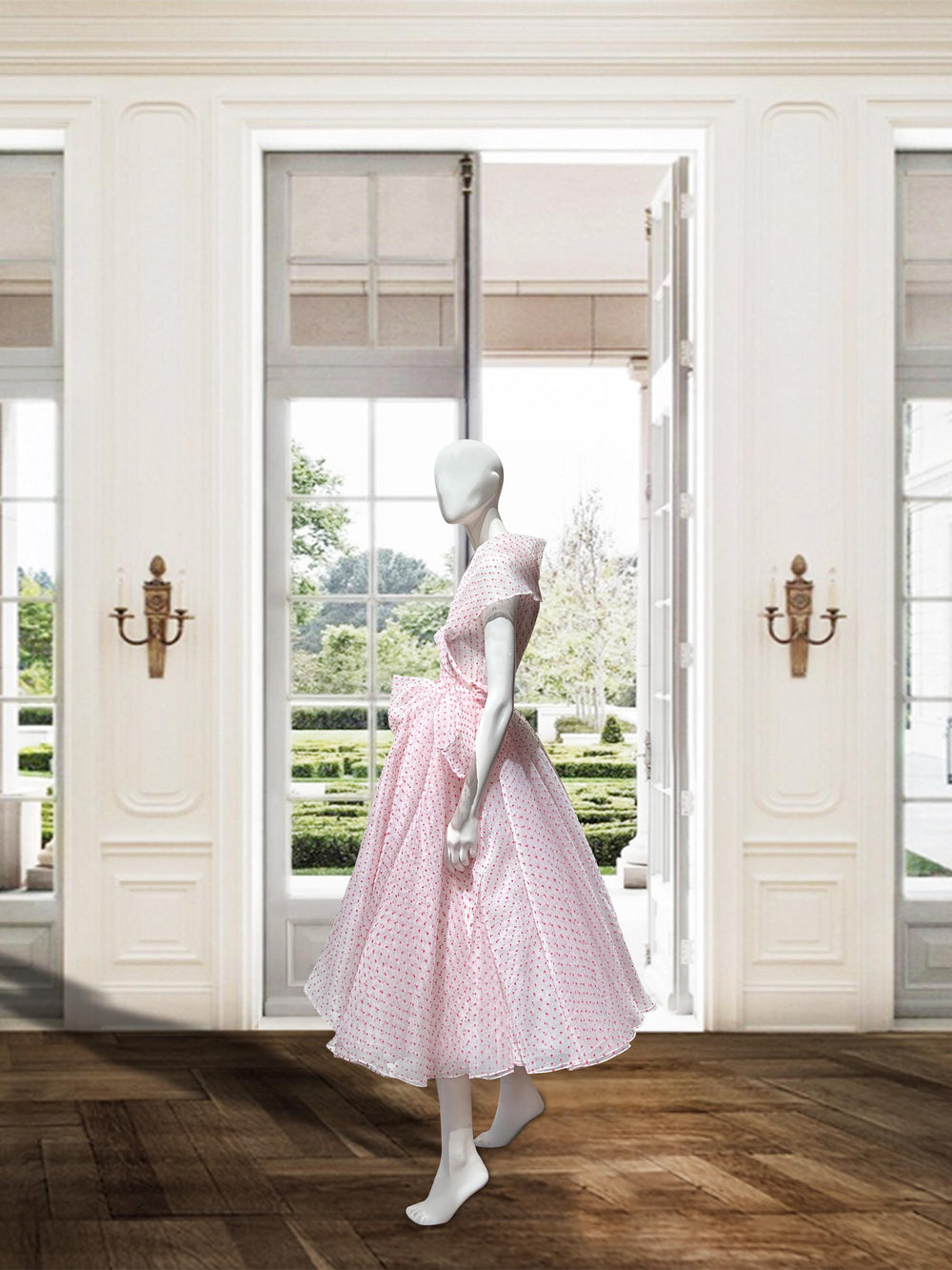 Strapless corsetted mid waist fitted dress with velevt flower and tacked bow