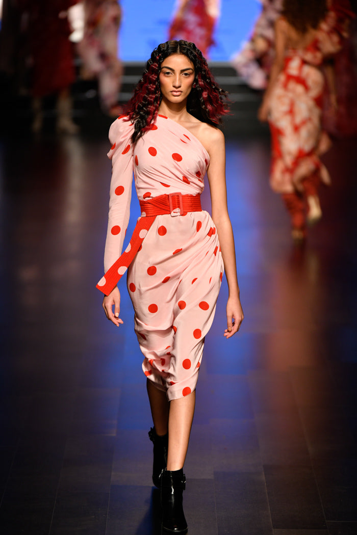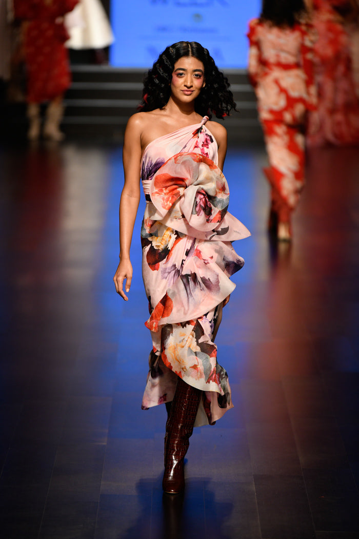 One shoulder bubble ruffle pencil skirt with side ruching and high low panel