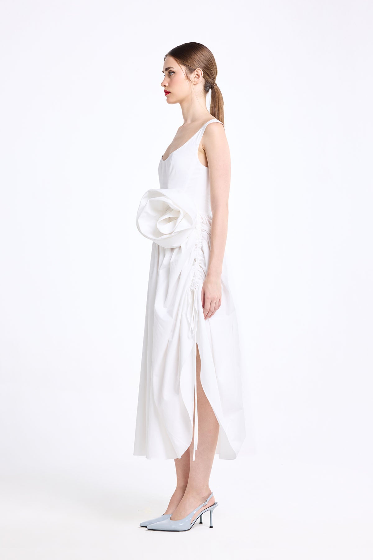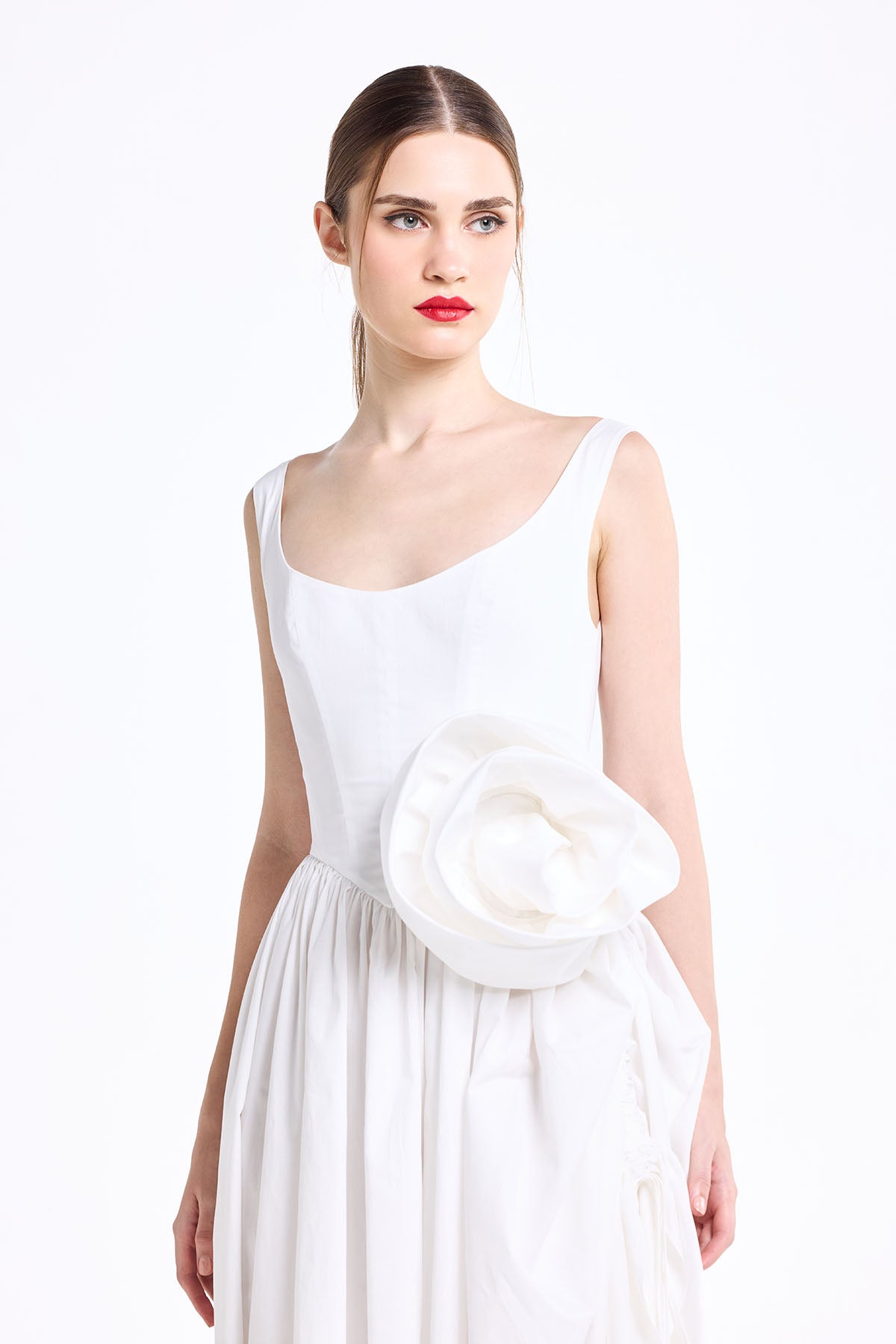 OFF-SHOULDER U-NECK MIDI DRESS FEATURING A POINTED BONED CORSET, ASYMMETRIC HEM WITH SIDE DRAWSTRING, AND OVERSIZED SCULPTED FLOWER DETAIL AT THE WAIST.