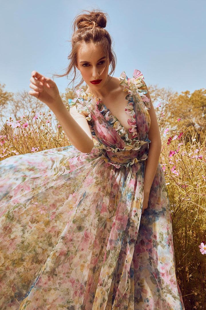 Deep neck midi with organza frill detailing