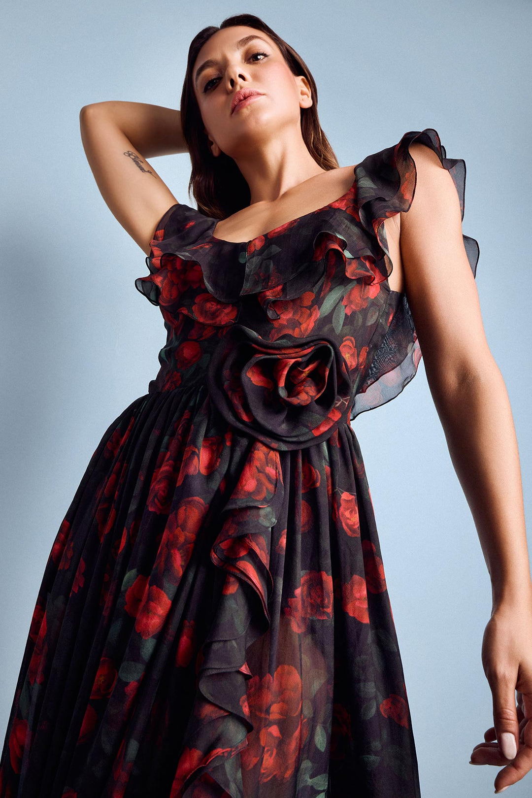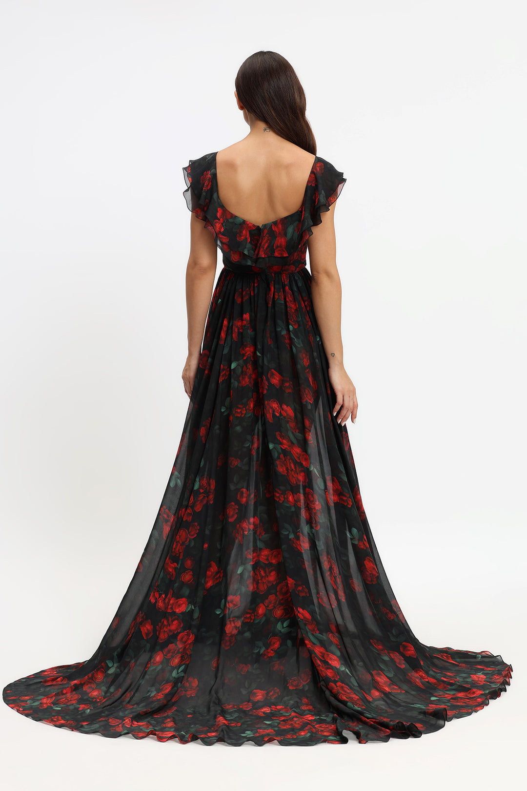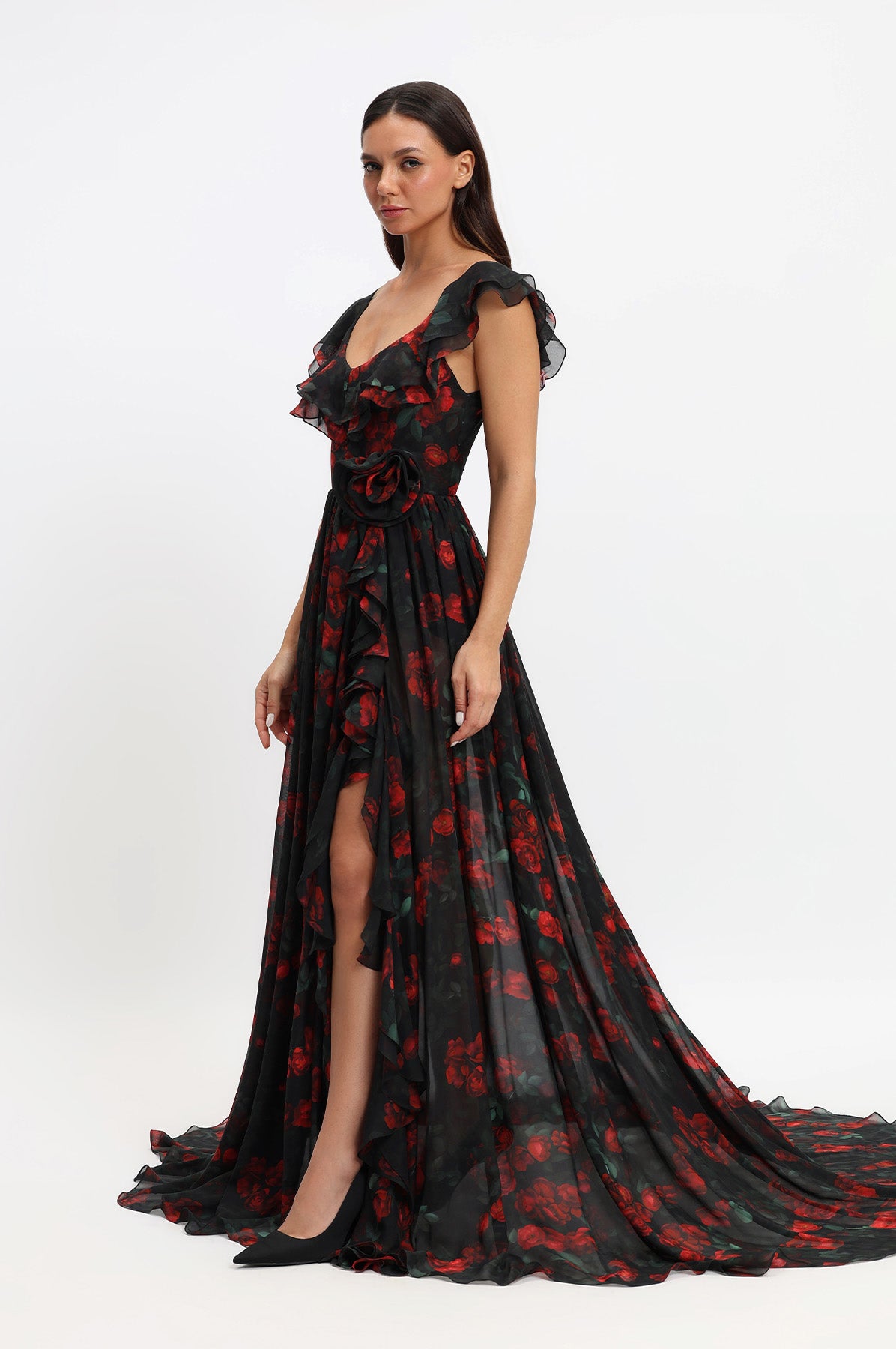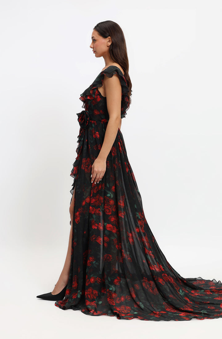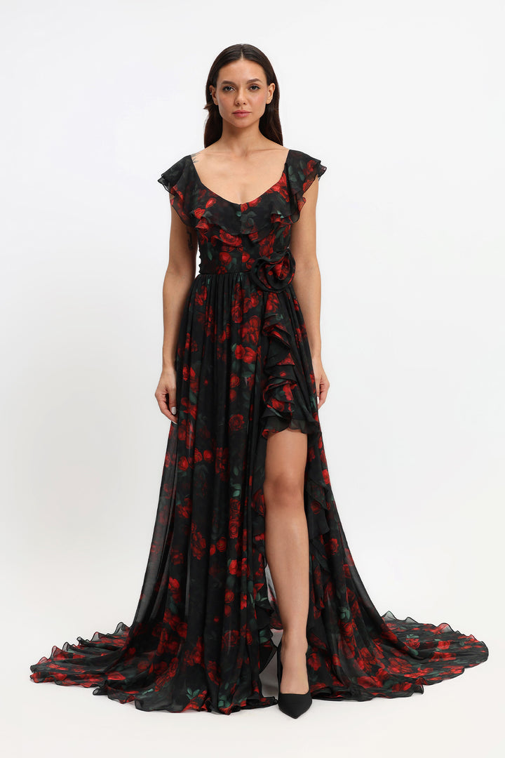 Chiffon Gown with Ruffle Detailing and High Slit and Flower on The Waist