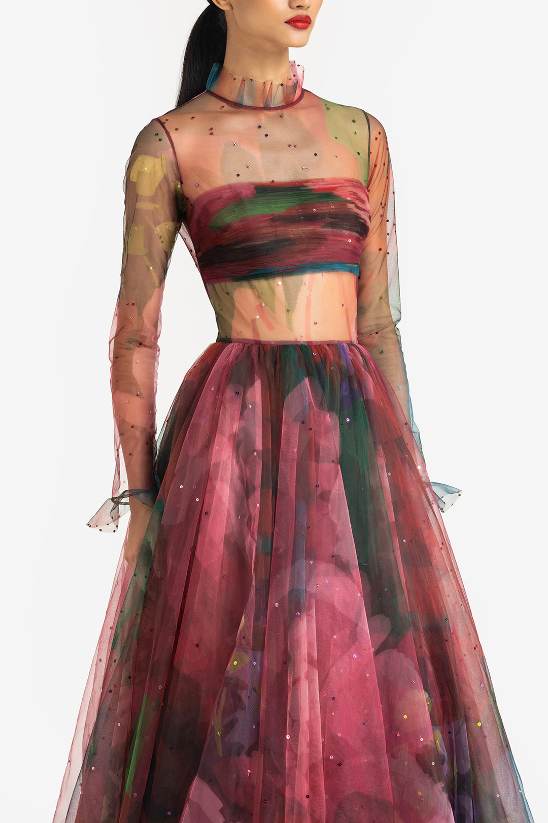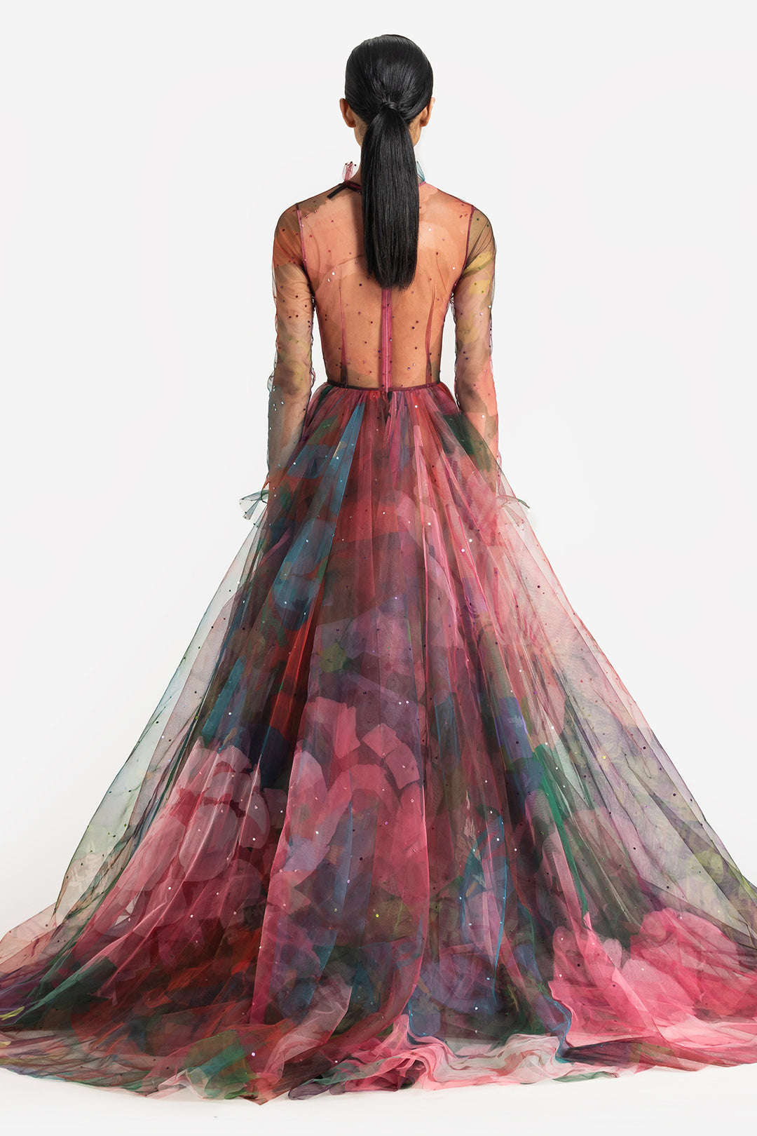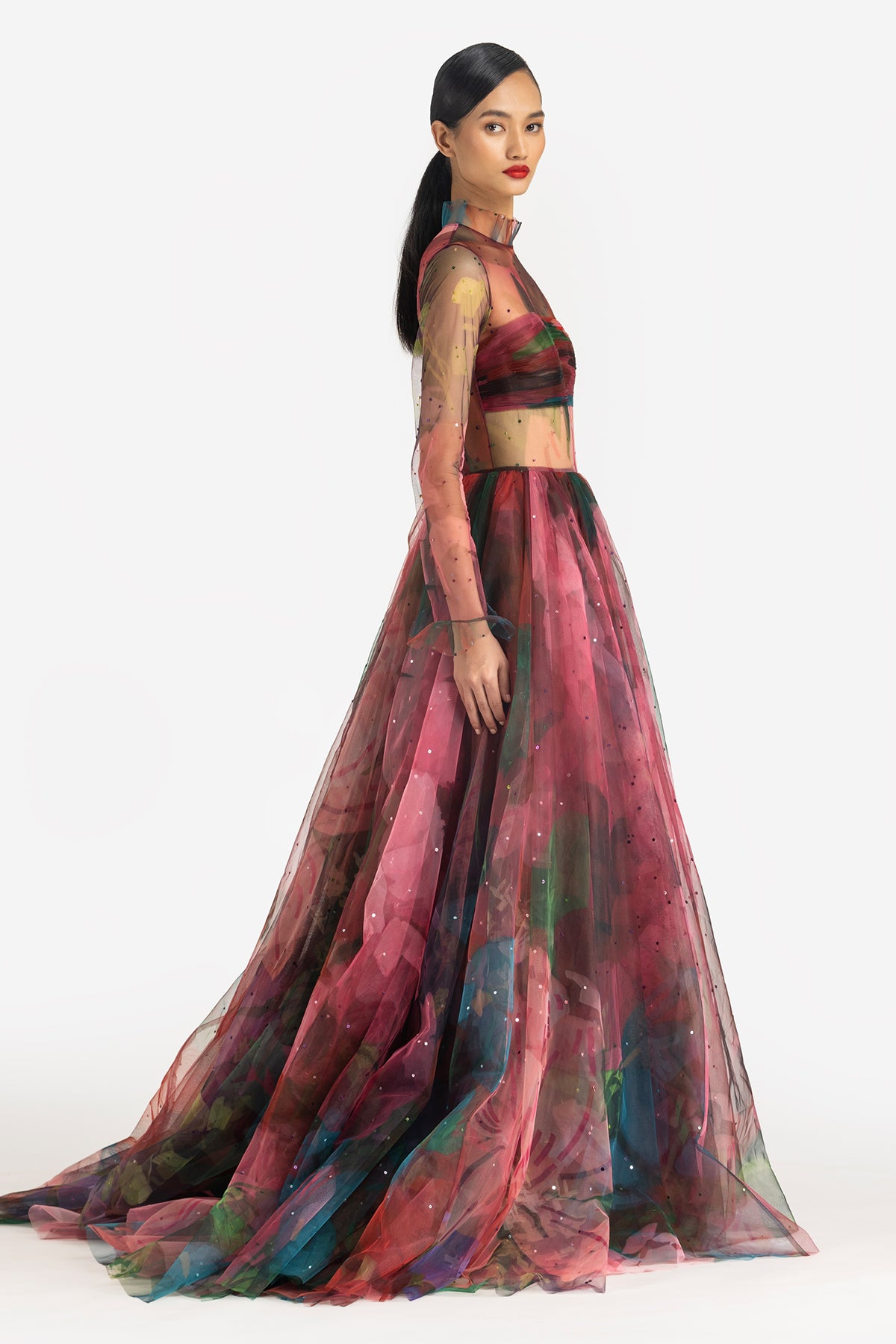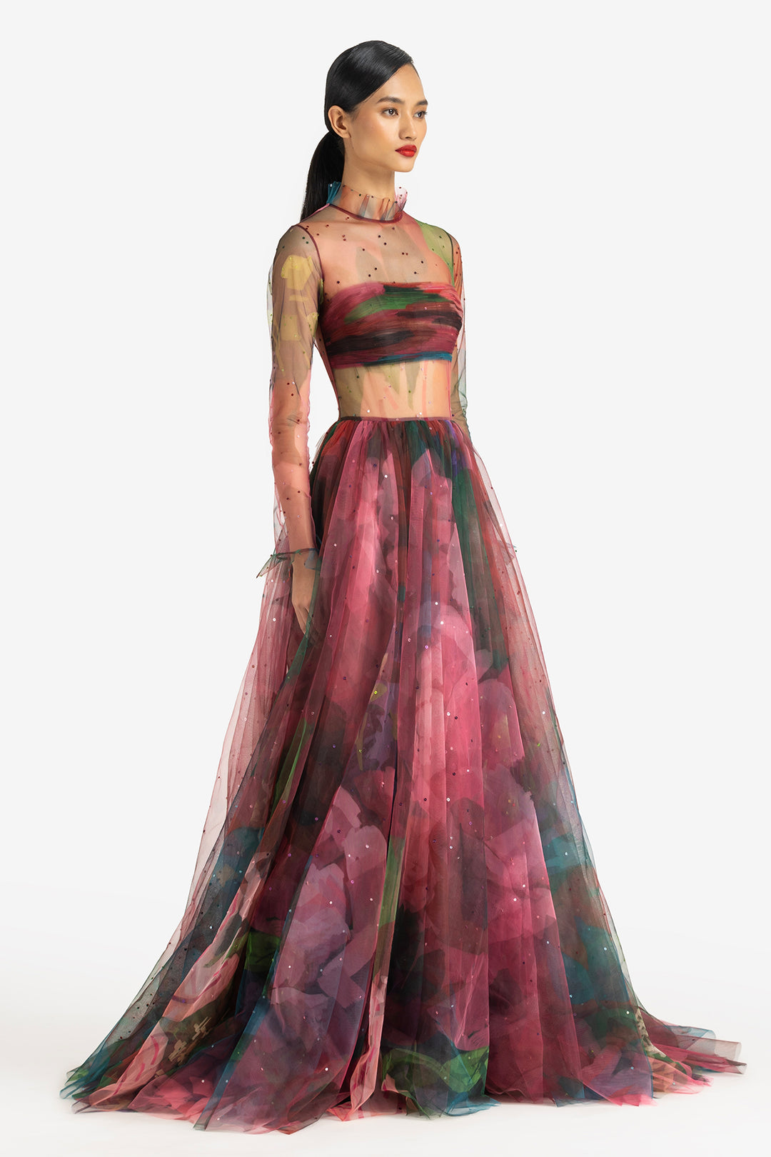 Round Neck Tulle Gown with Drape Detail at The Bust