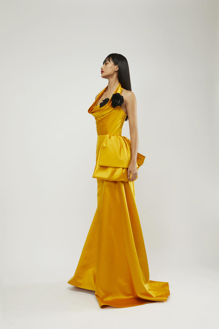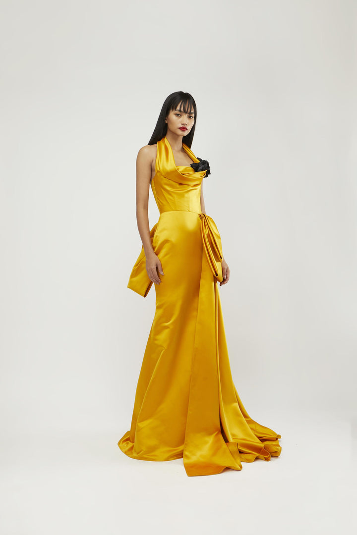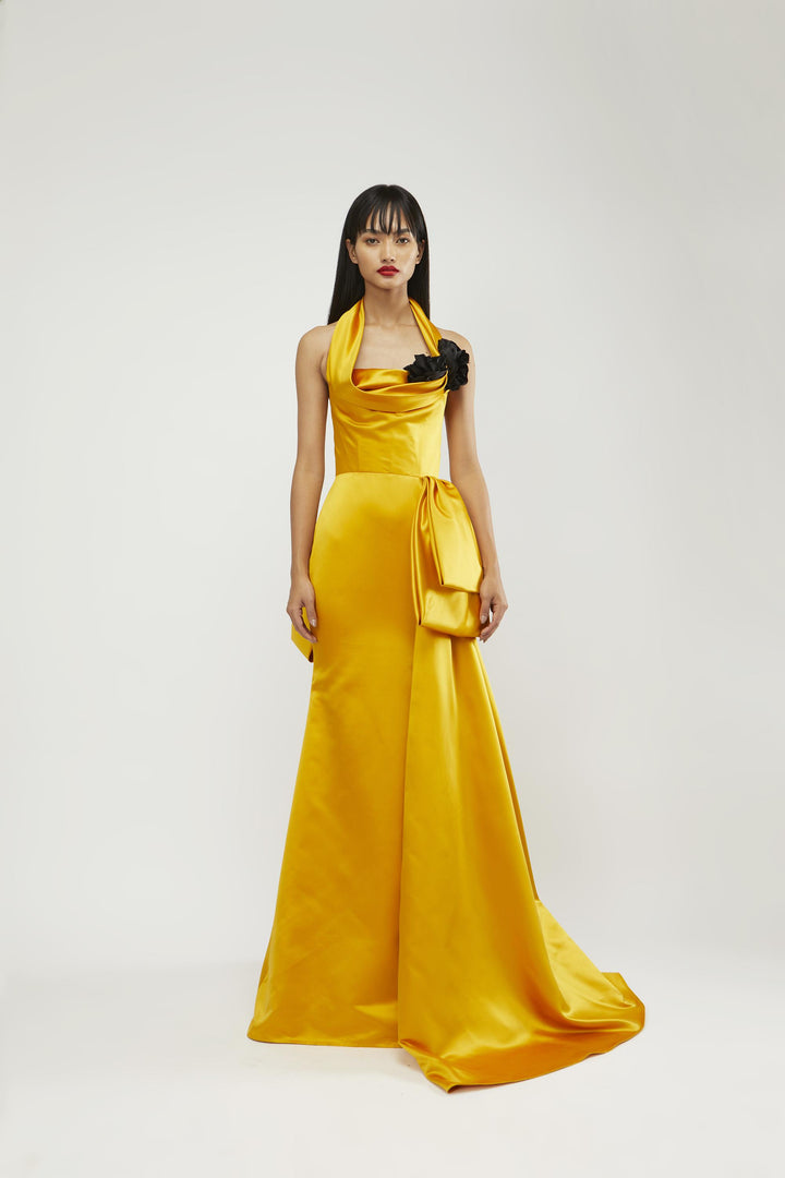 Internally draped halter neck corsetted mermaid gown with bow detailing in duchness satin