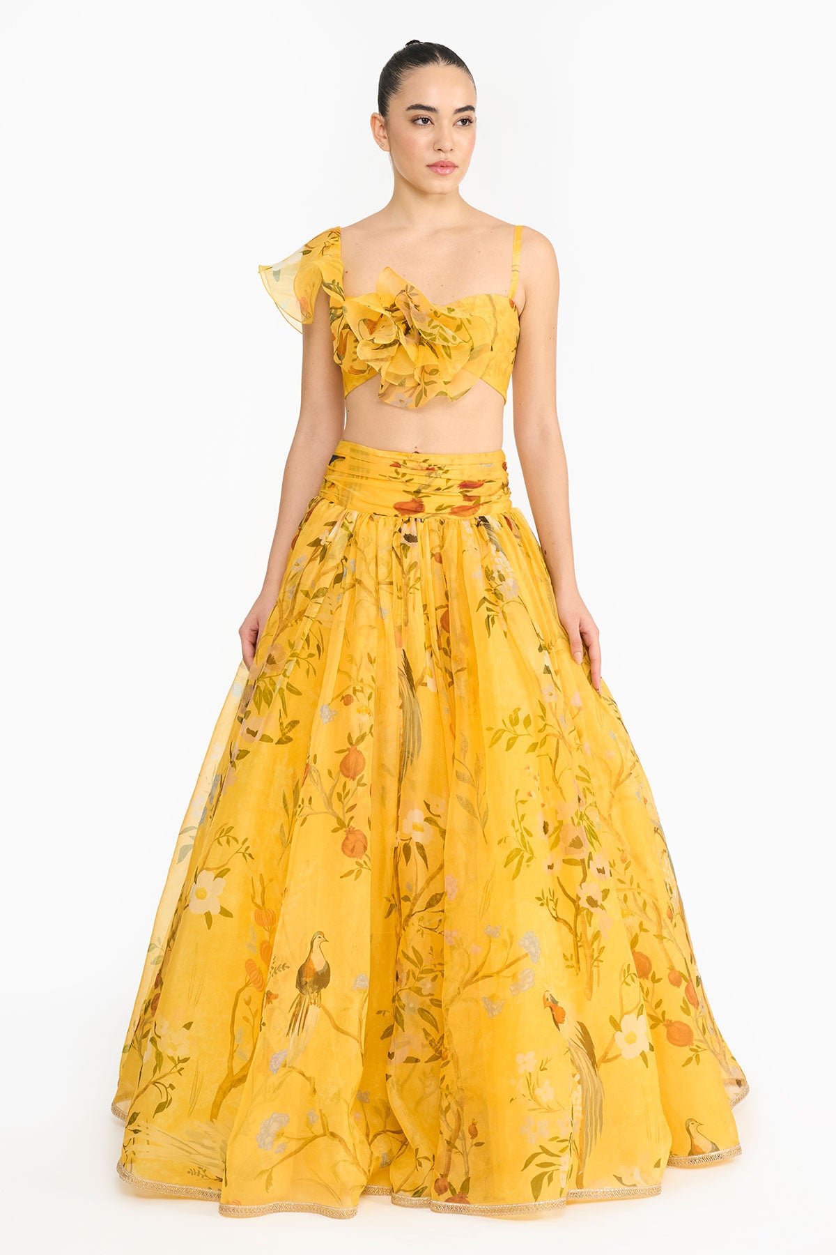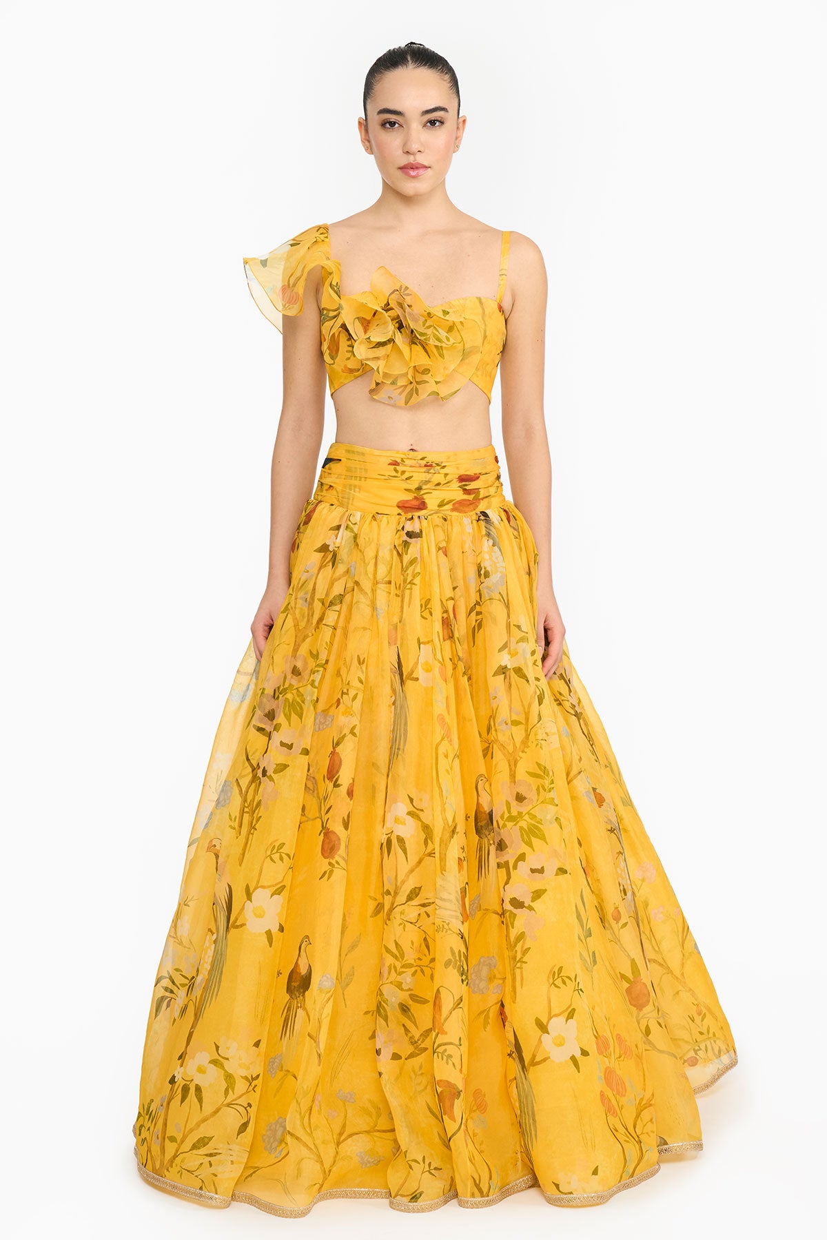 Yellow Chinoiserie Lehenga Paired With Ruffled Blouse With Flower