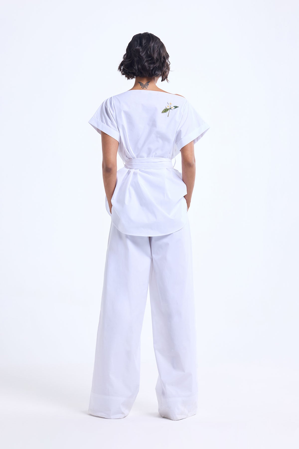 BOAT NECK TOP WITH BOTANICAL THREAD EMBORIDERY AND BELT PAIRED WITH STRAIGHT FIT PANT