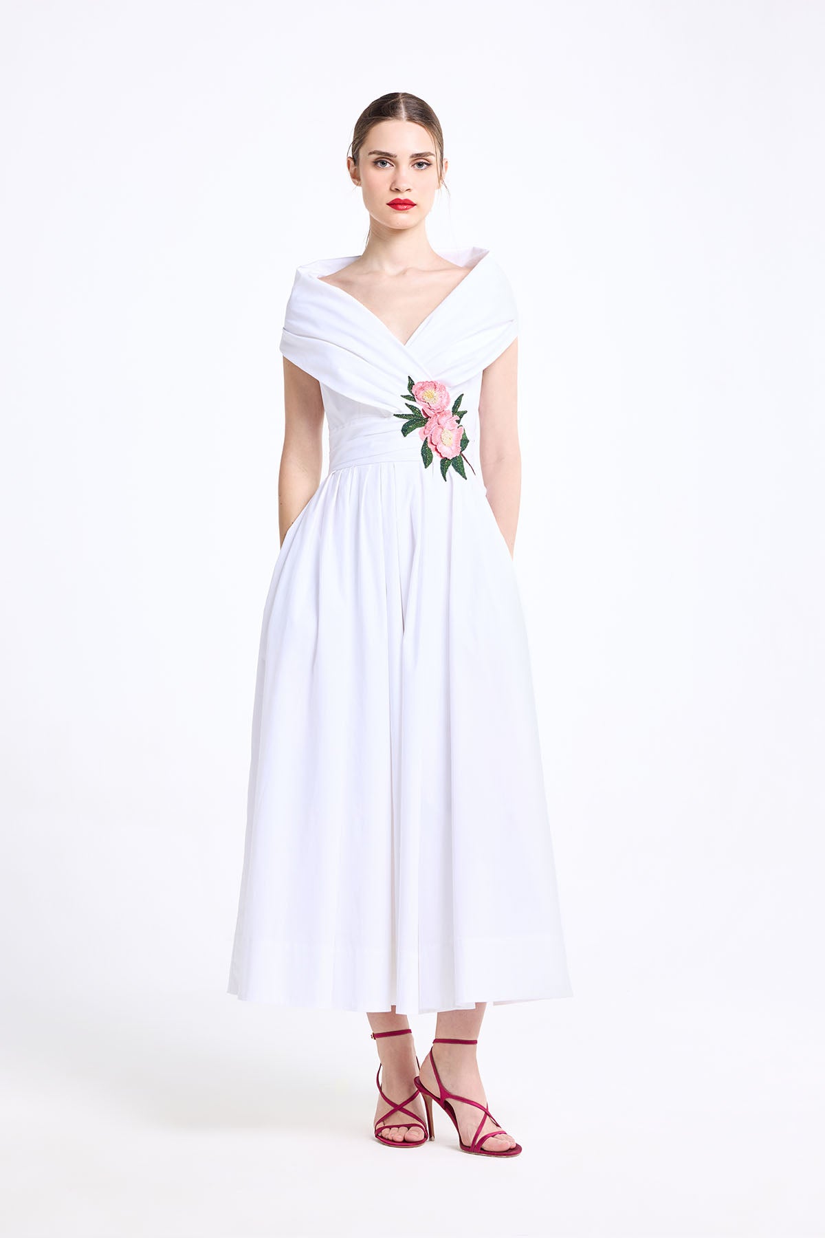 DRAPED SHAWL COLLAR MIDI WITH FIXED WAISTBAND AND THREAD EMBROIDERY ON WAIST