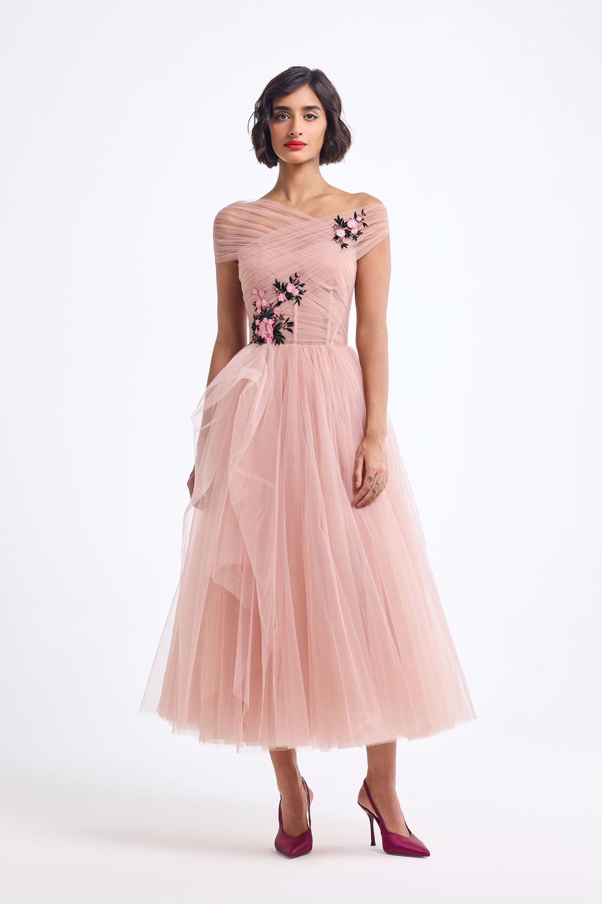 OFF SHOULDER CORESTTED DRAPED MIDI WITH LIFTED HEM AND BOTANICAL THREAD EMBROIDERY