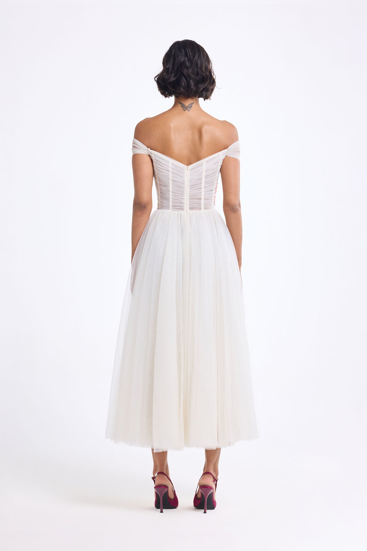 OFF SHOULDER DRAPED MIDI WIH BOTANICAL THREAD EMBROIDERY