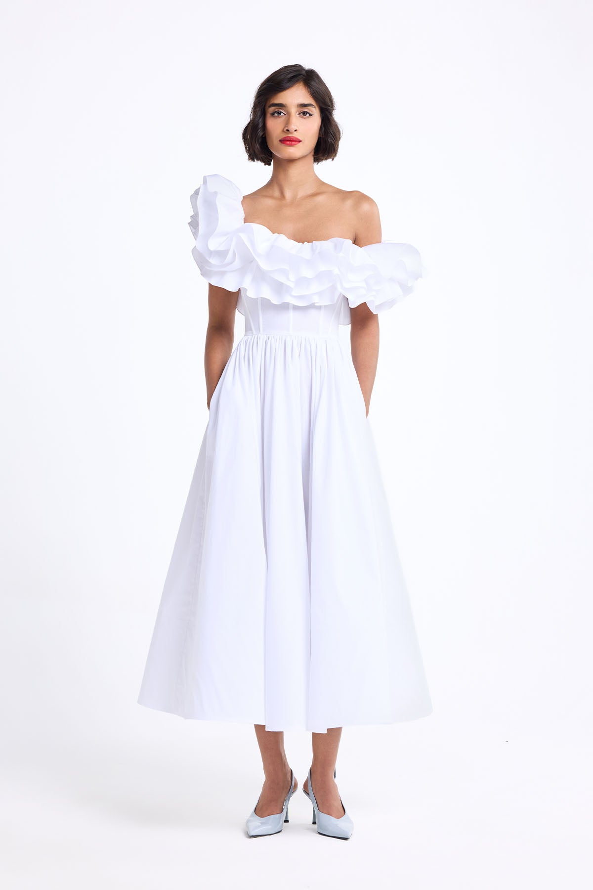 WHITE COTTON MIDI DRESS FEATURING OVERSIZED GATHERED RUFFLES THAT SIT ASYMMETRICALLY FROM OVER THE SHOULDER TO OFF SHOULDER.