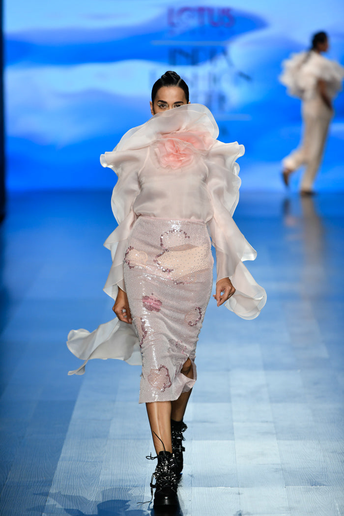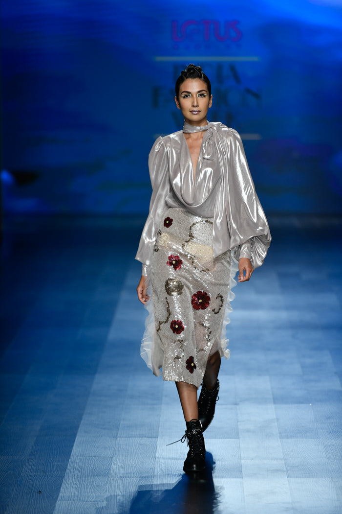 Blue sequin sheeted pencil skirt with hollyhock flowers