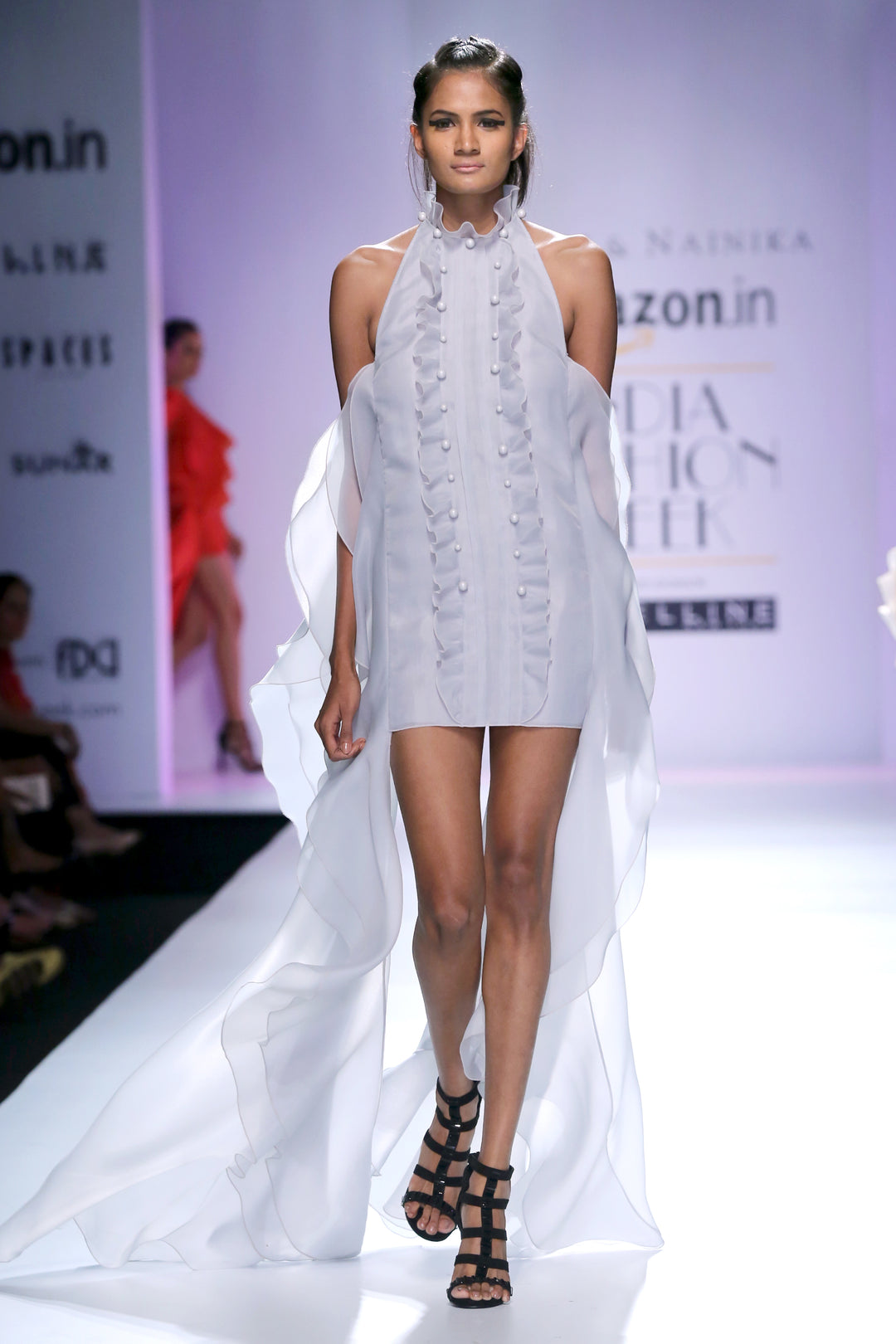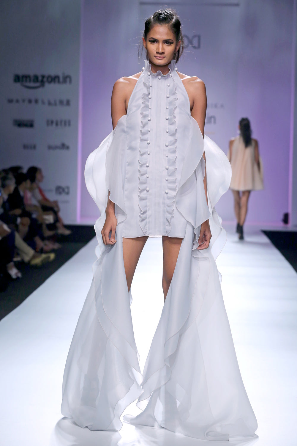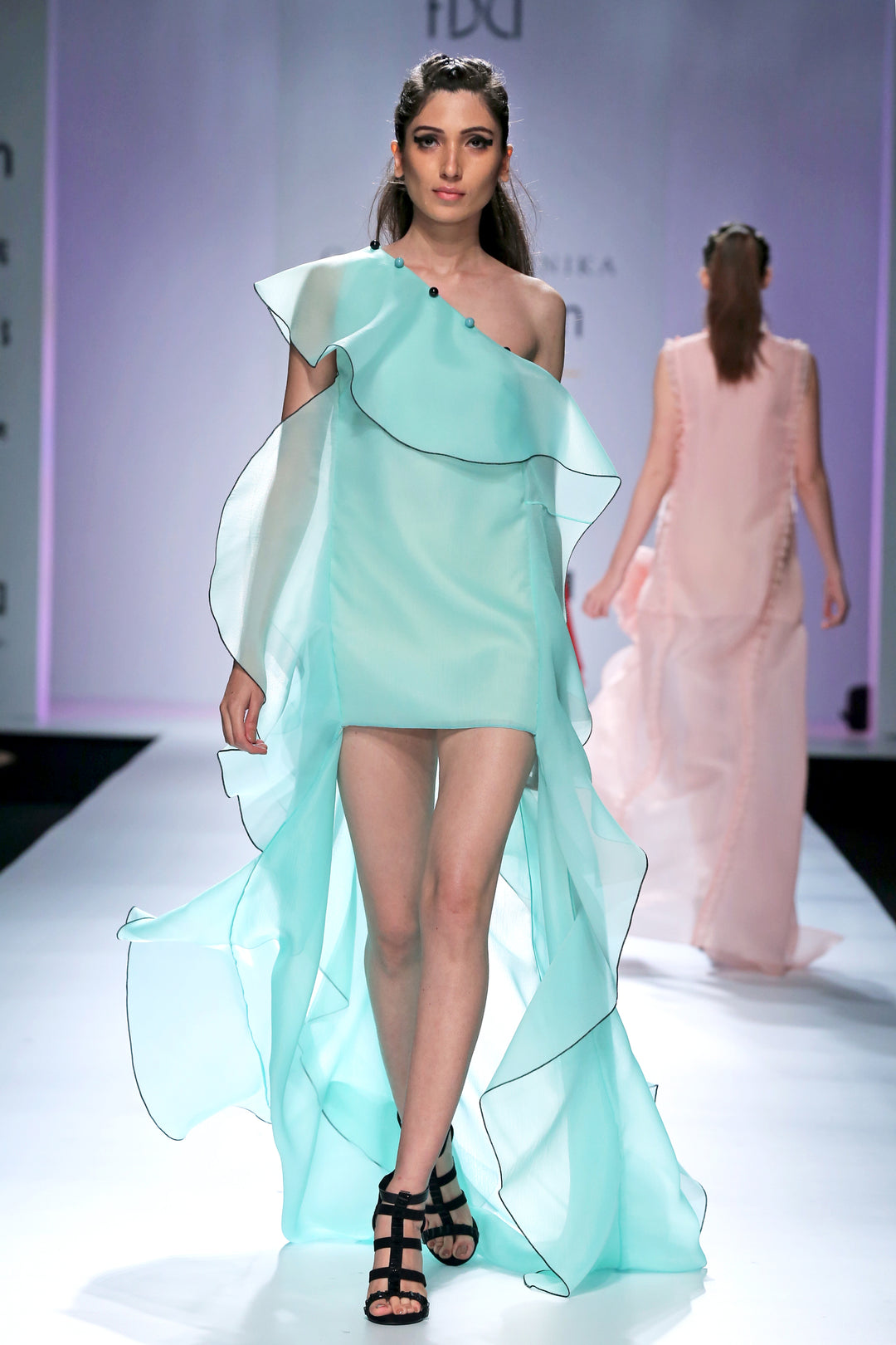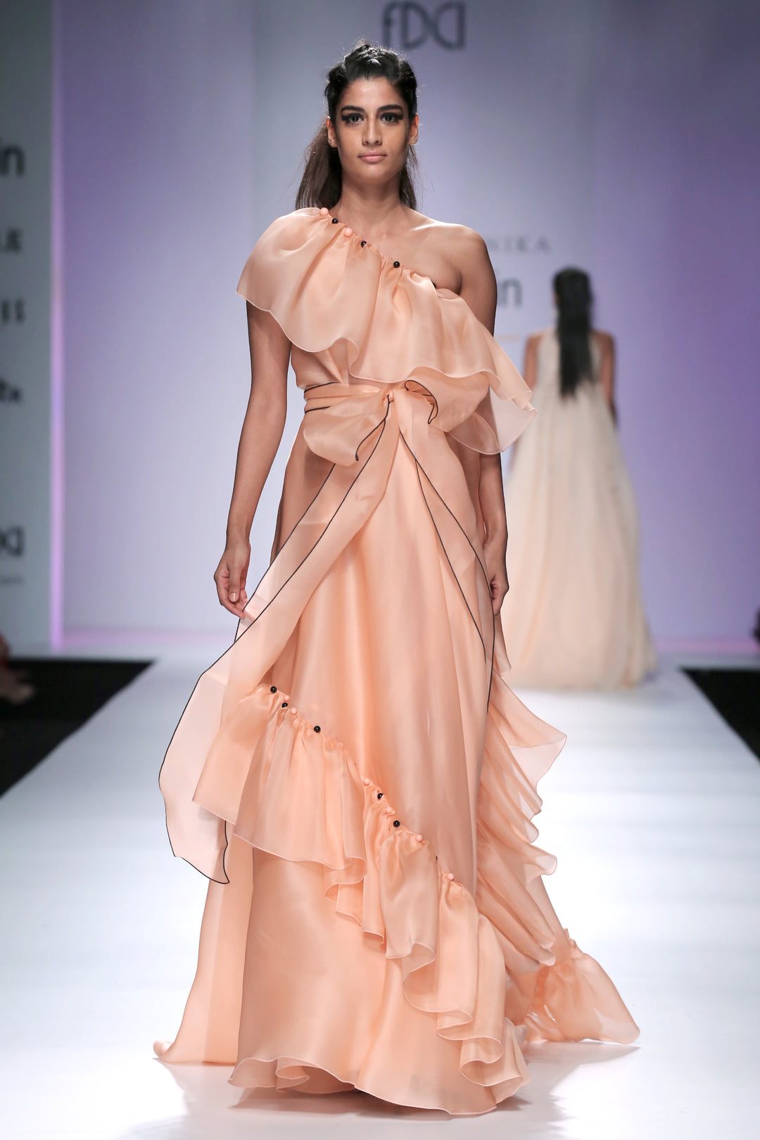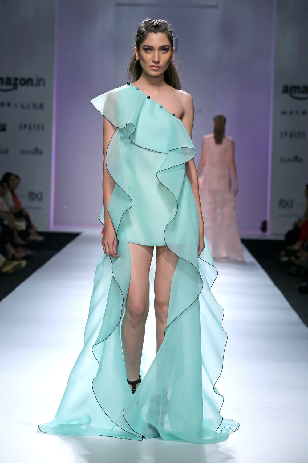 One shoulder shift dress with cascading side ruffles and trailing hem
