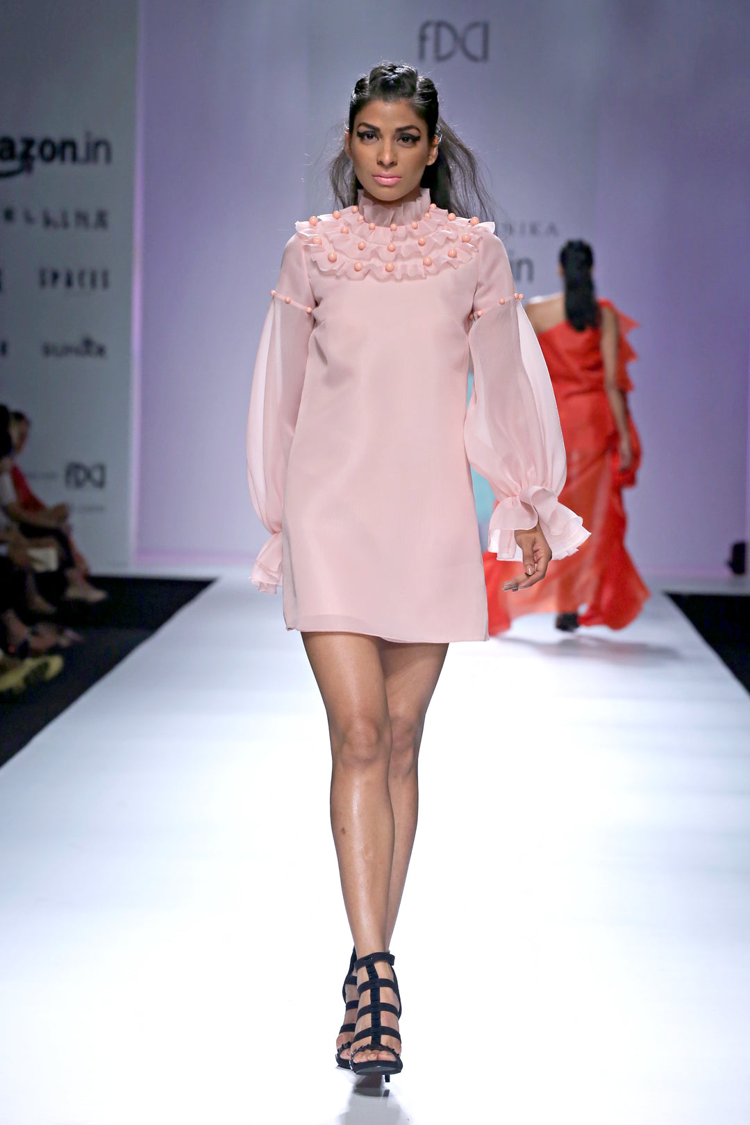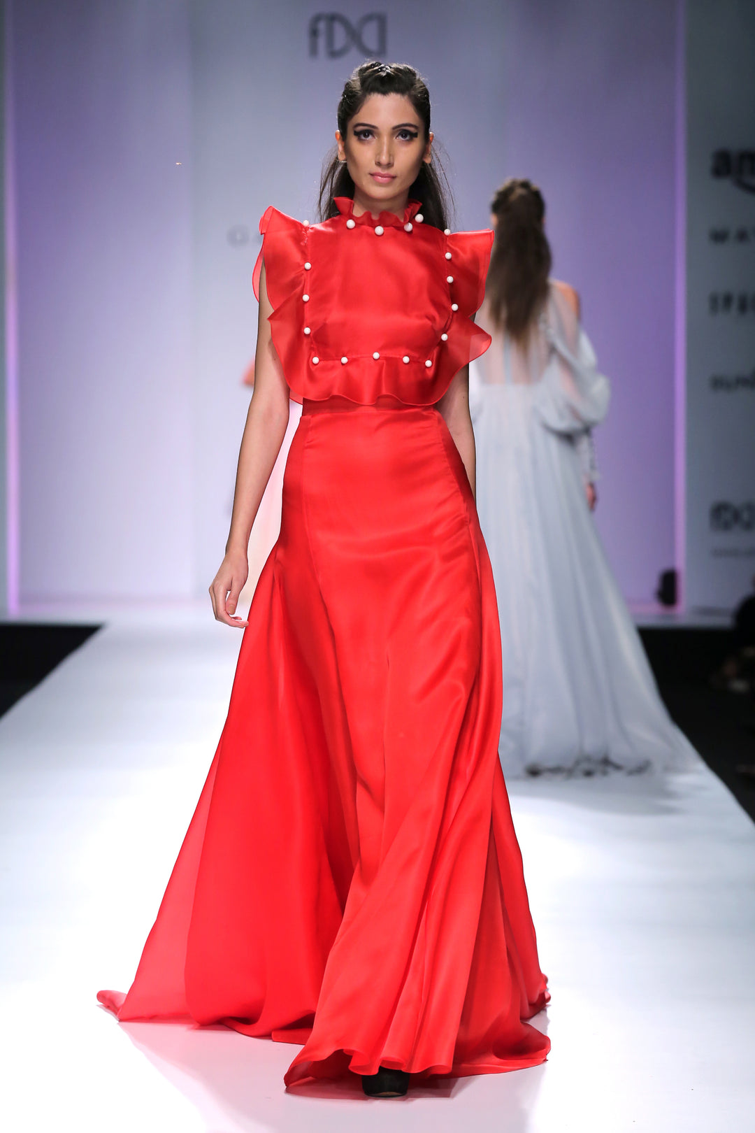 High-low shift dress with red pearl textured round bib and ruffled sides