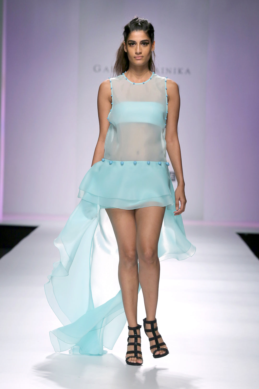 Drop-waisted loose dress with high-low hemline and sheer body with ruffled sides
