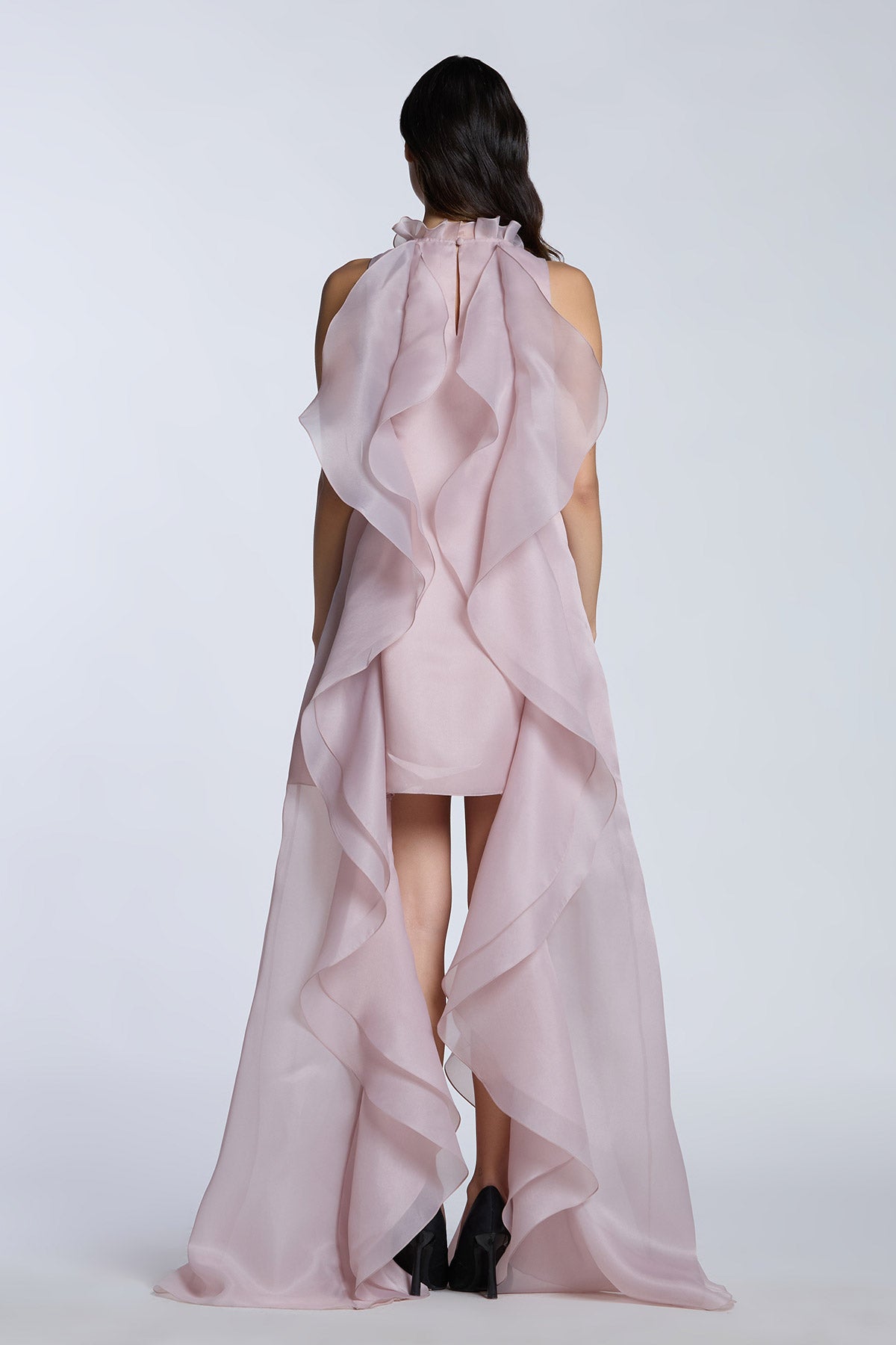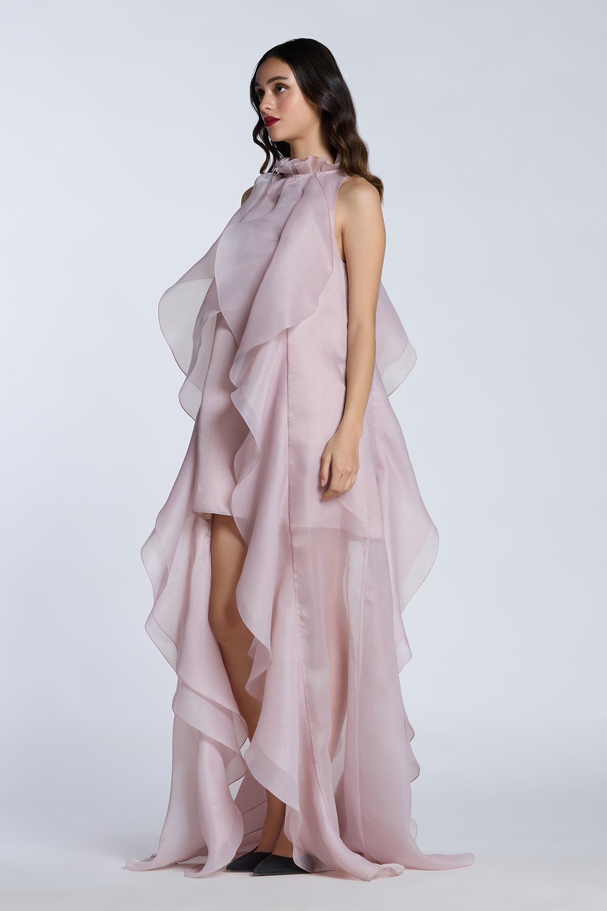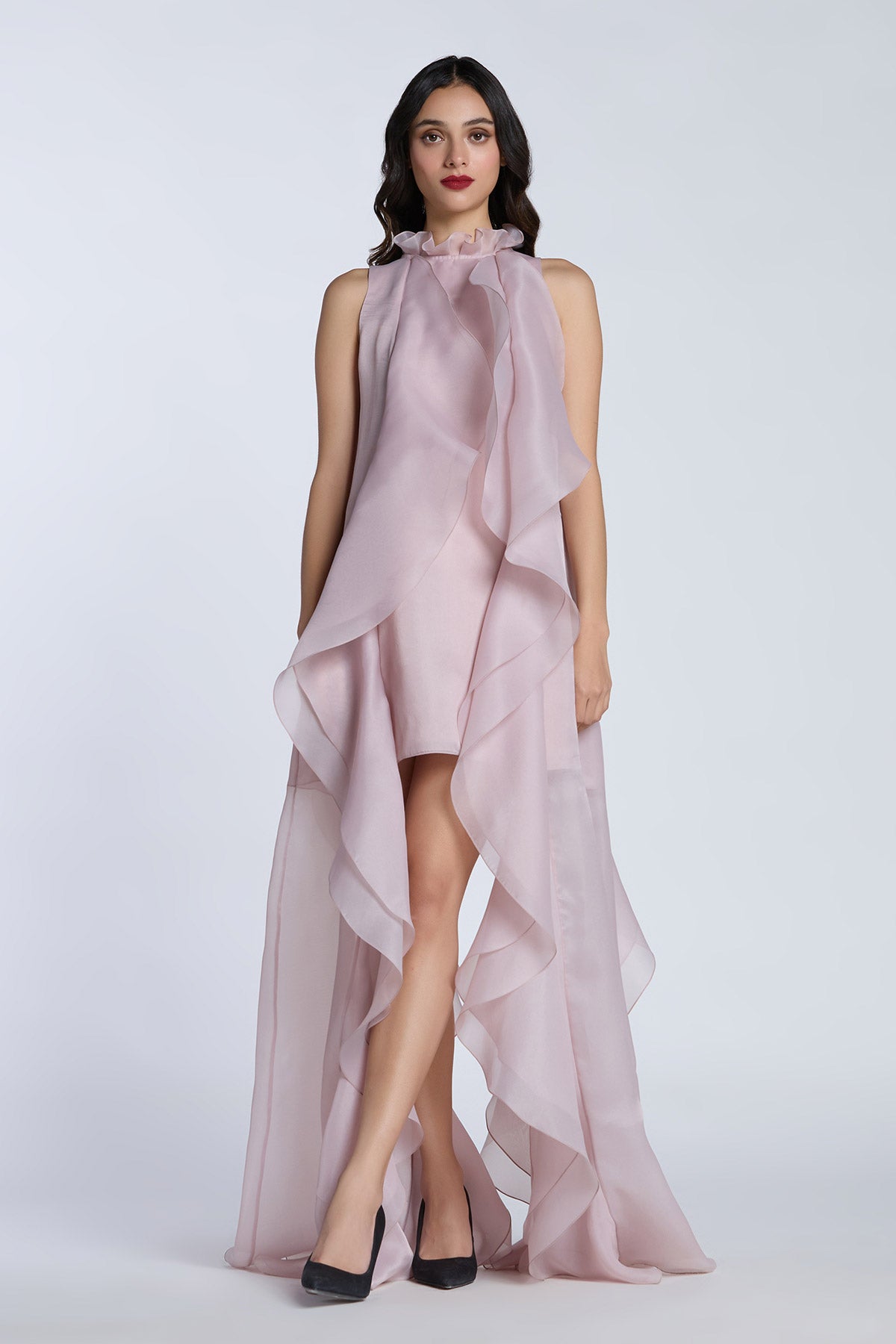 HIGH LOW SHIFT DRESS WITH CASCADING RUFFLES