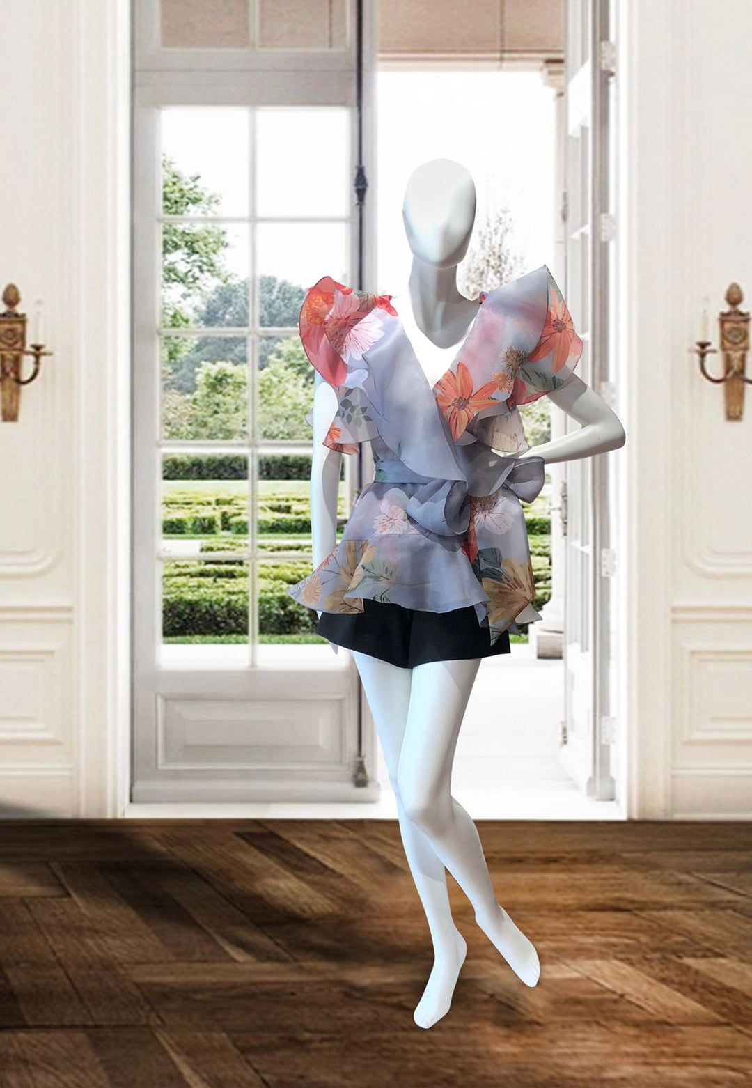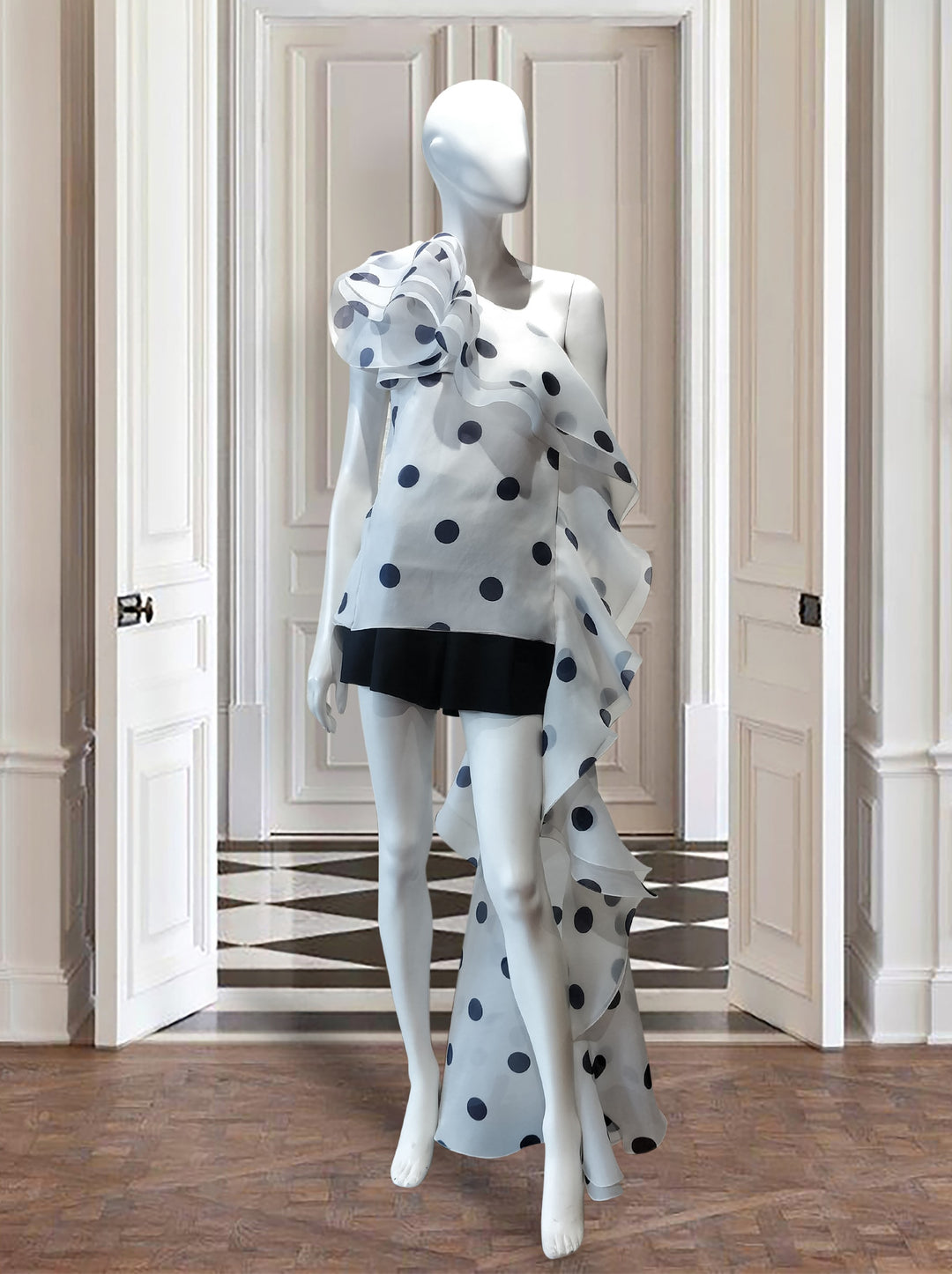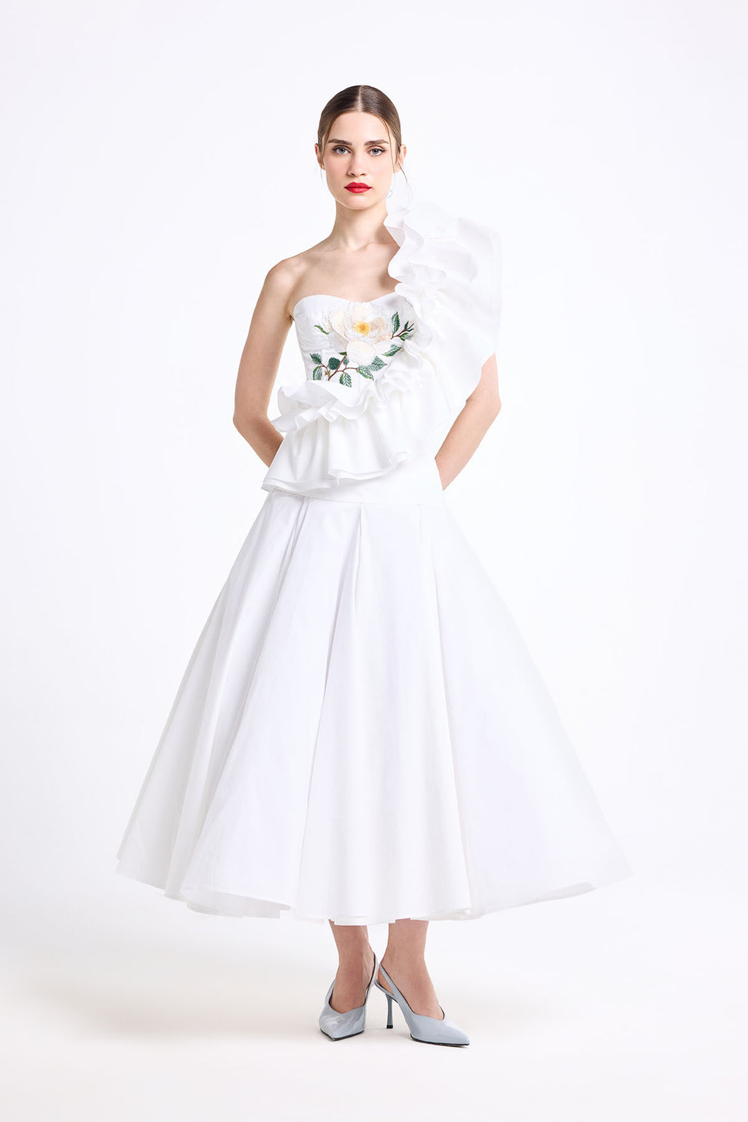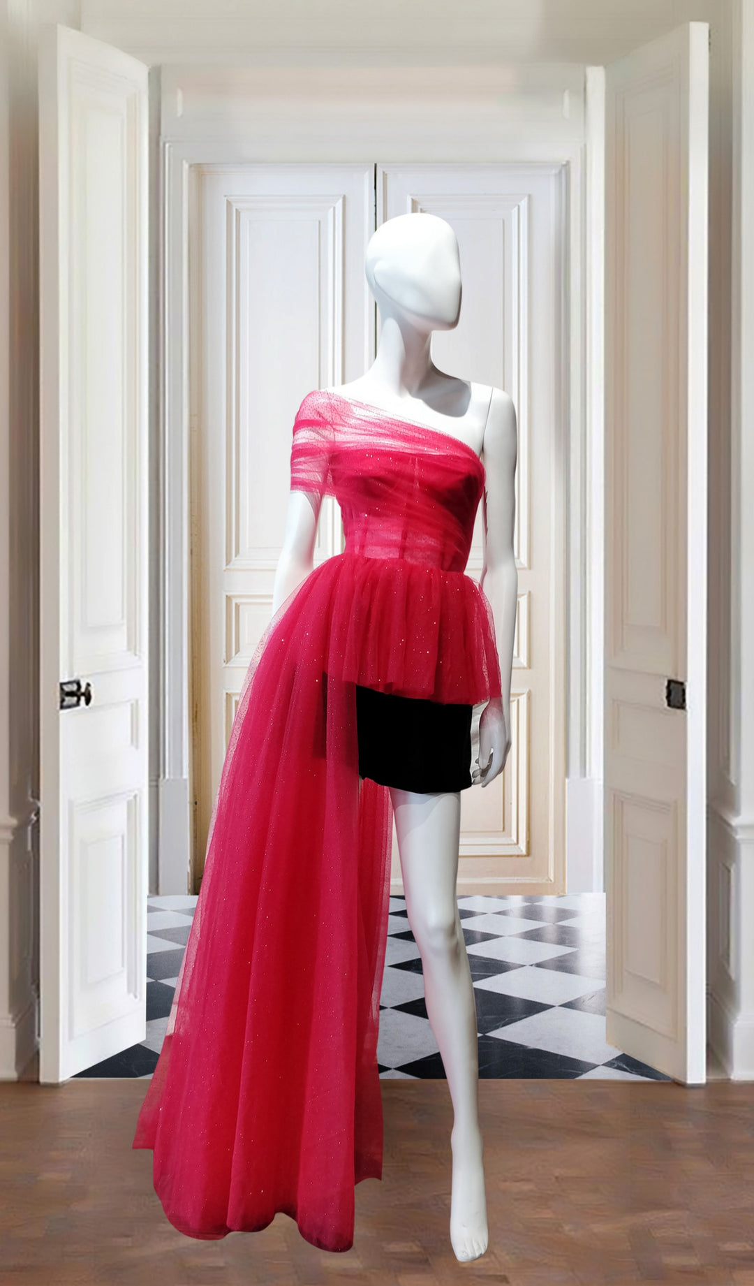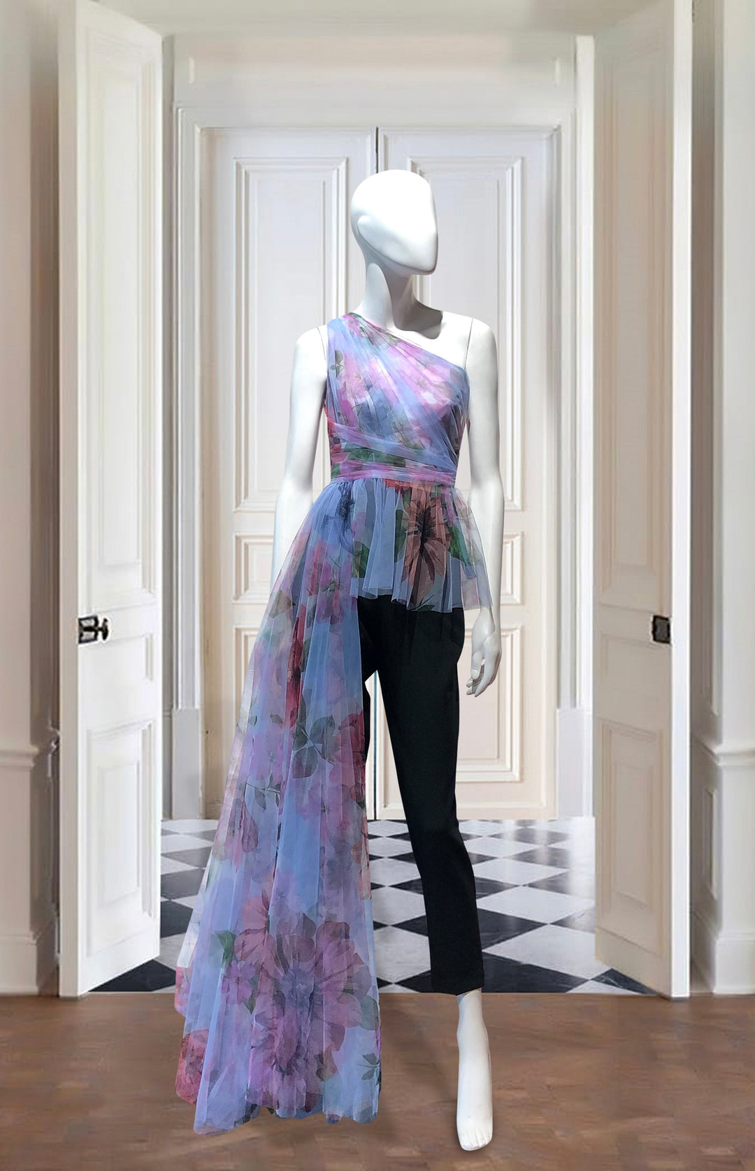 One shoulder fitted peplum top with two diagonal frills and side trail
