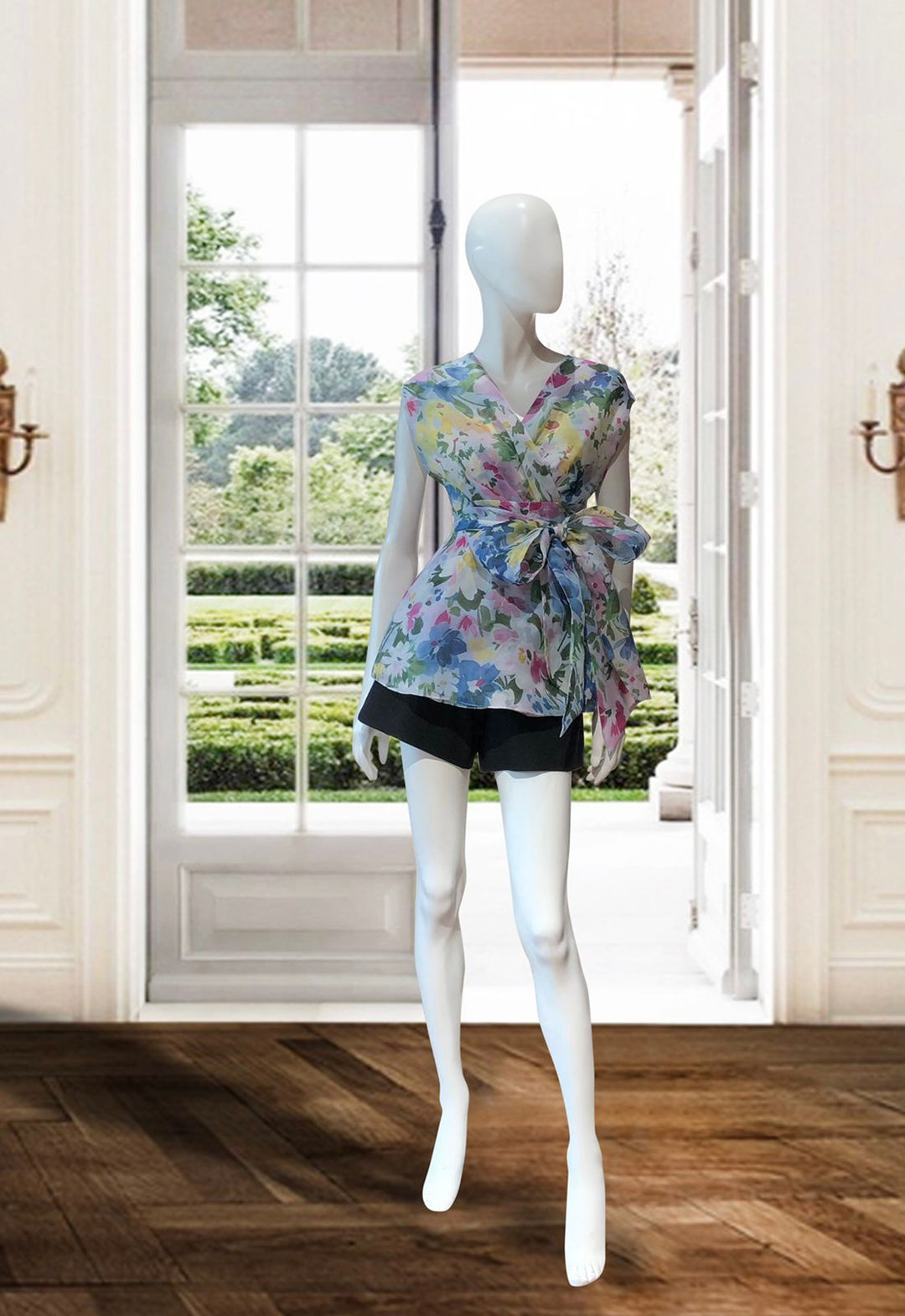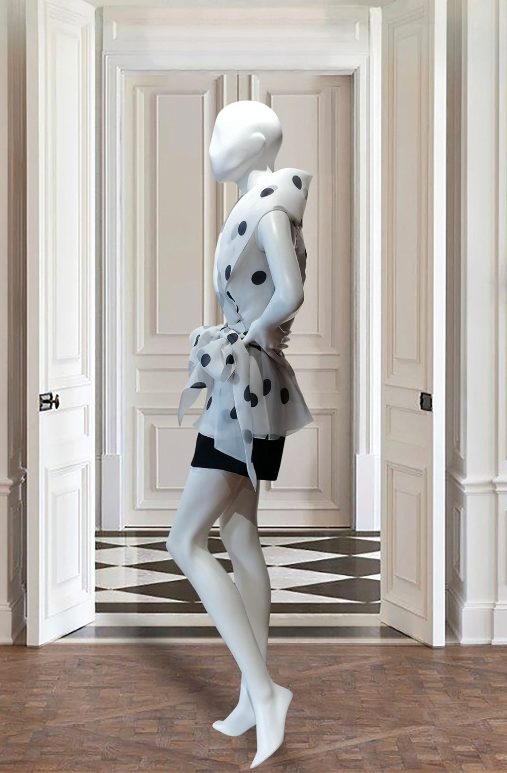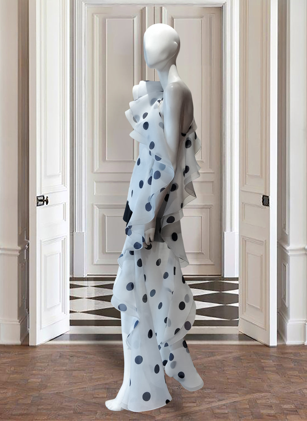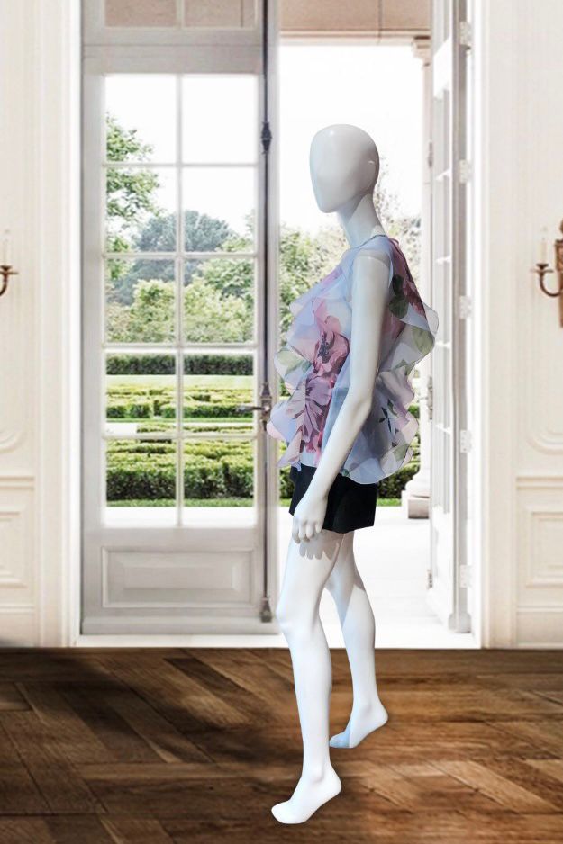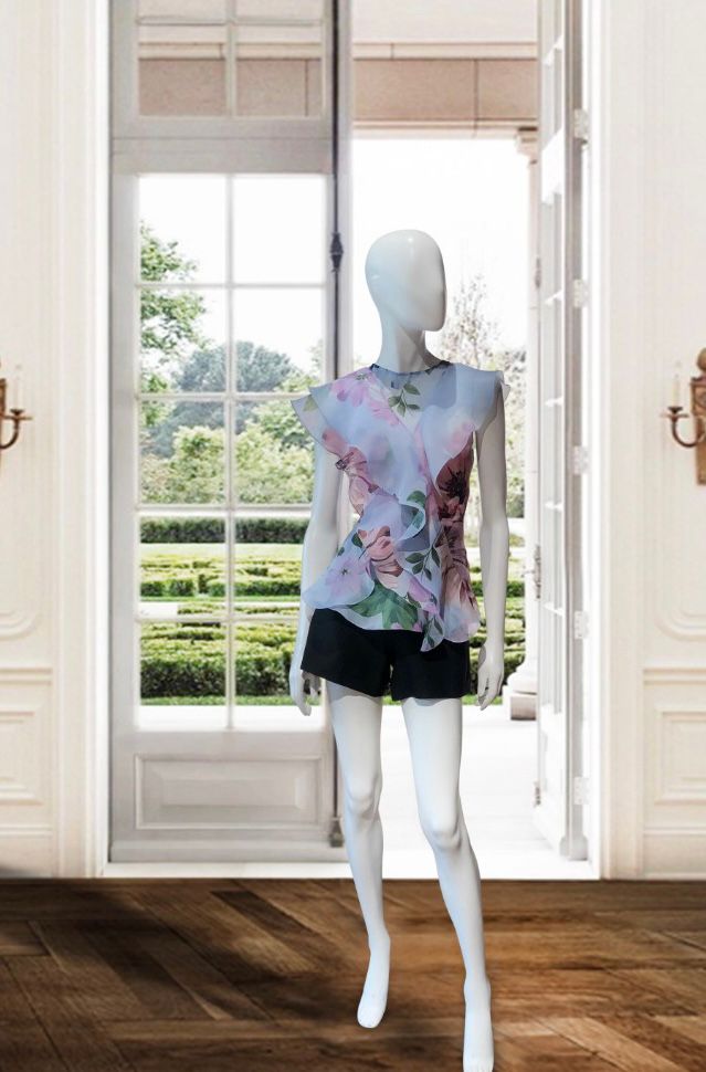 One shoulder fitted peplum top with two diagonal frills and side trail