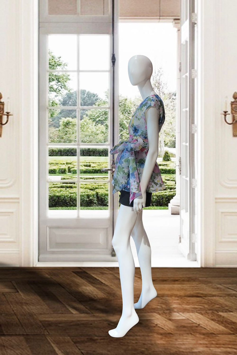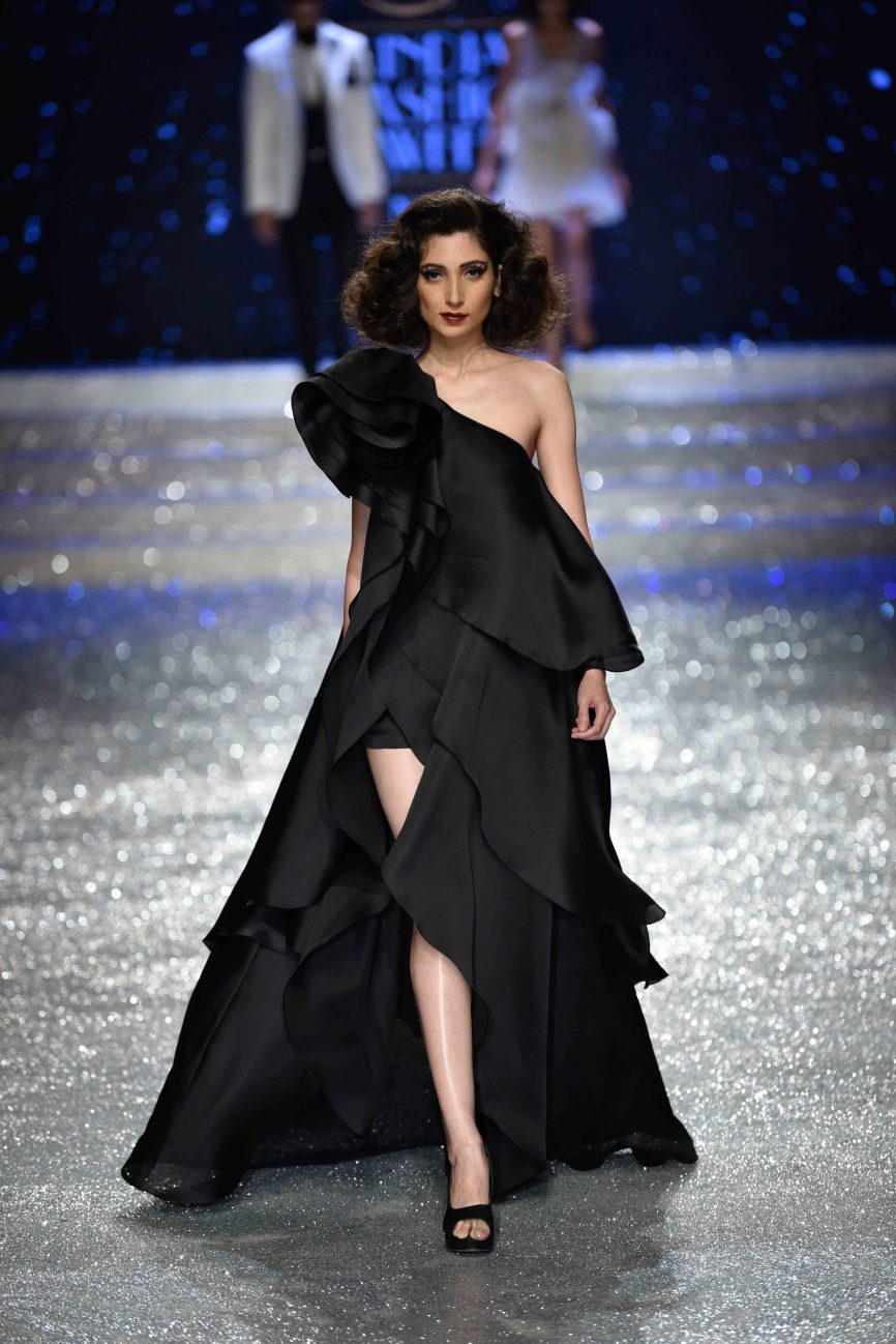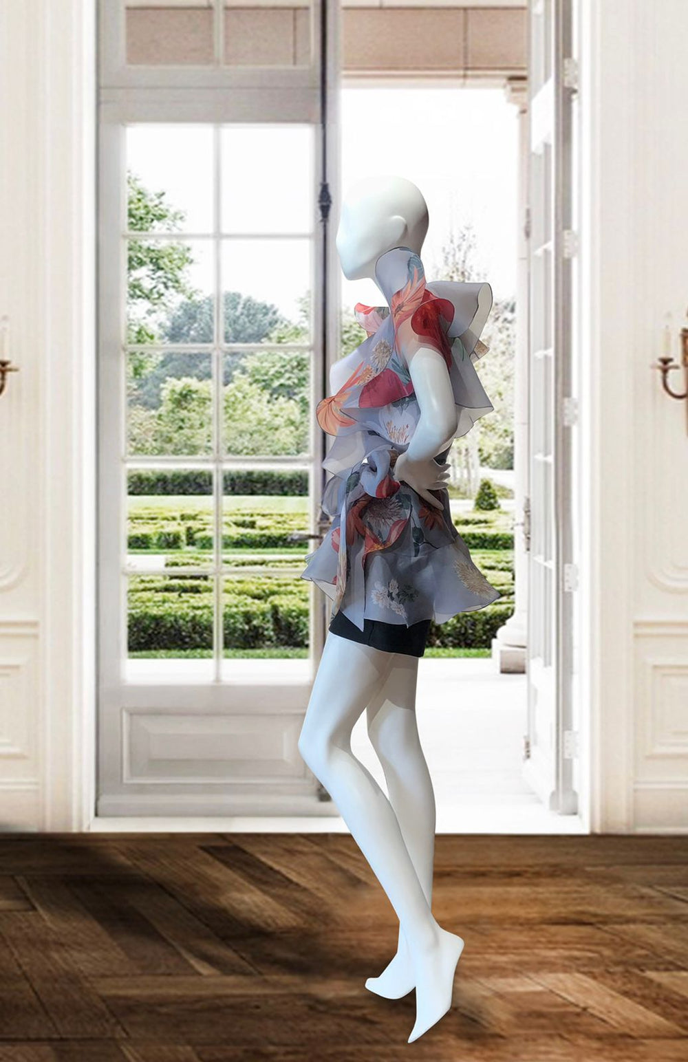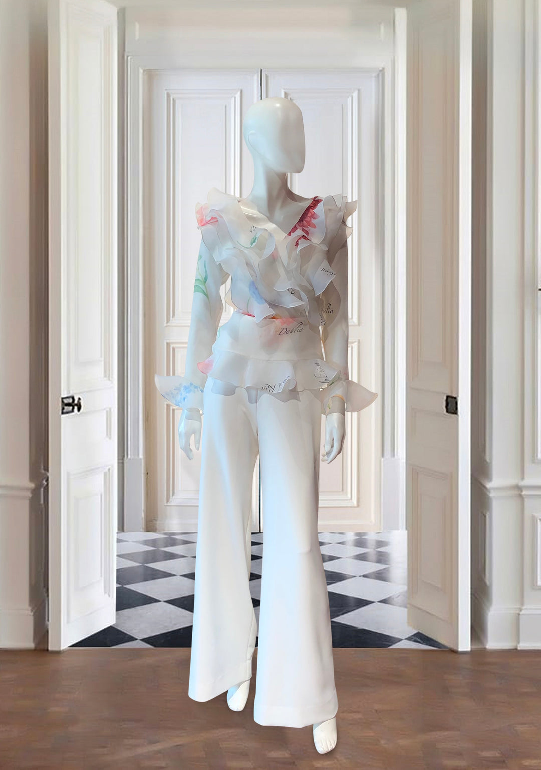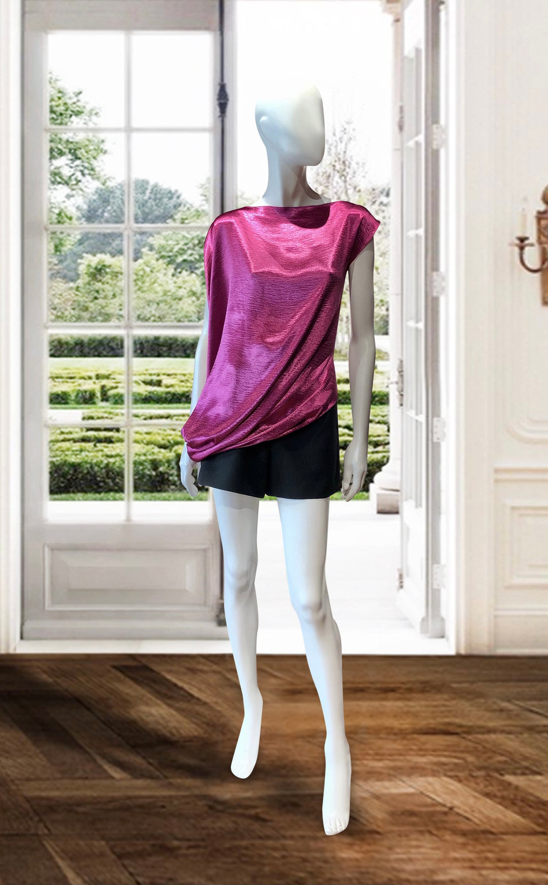 One shoulder fitted peplum top with two diagonal frills and side trail