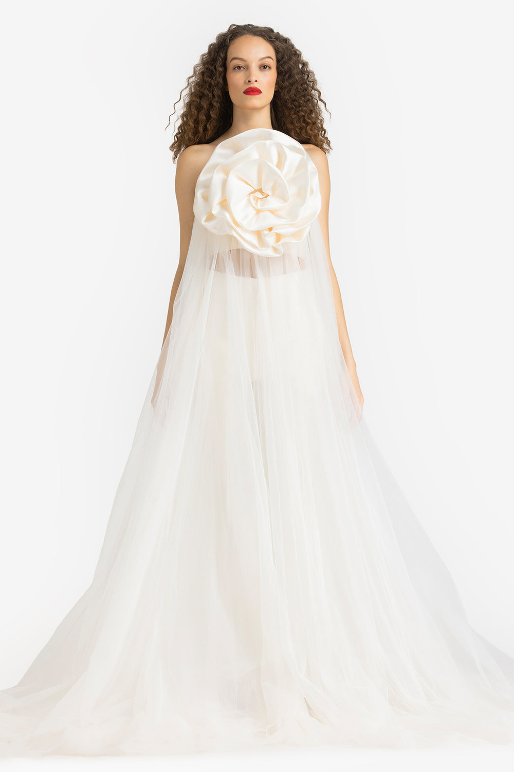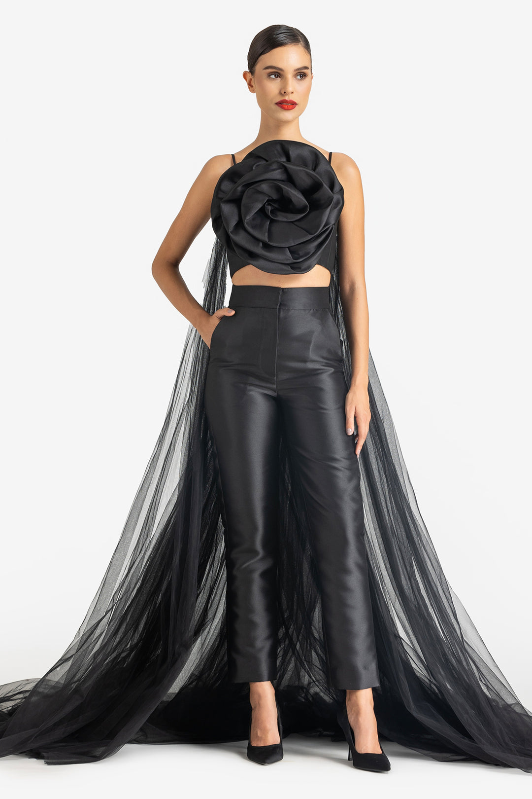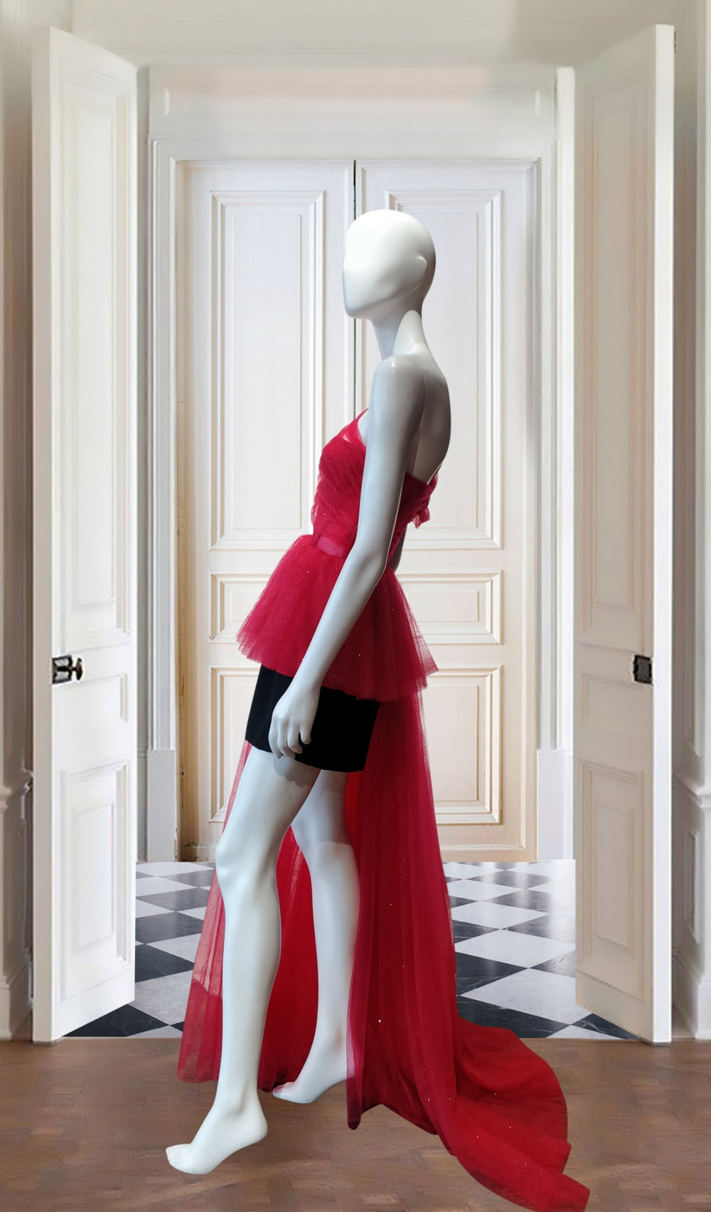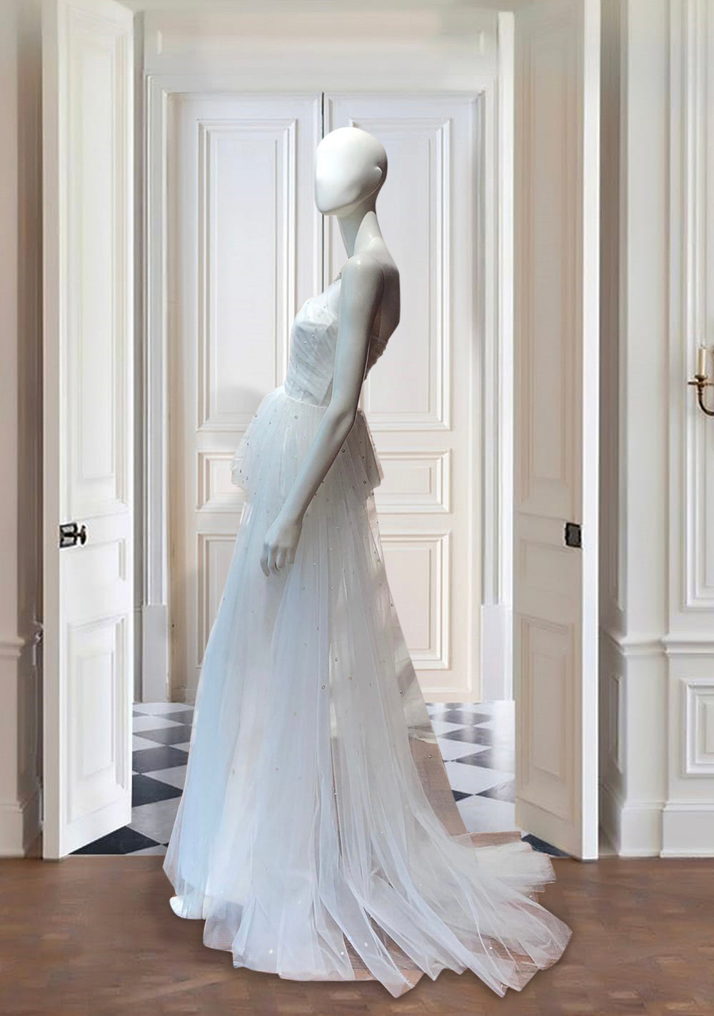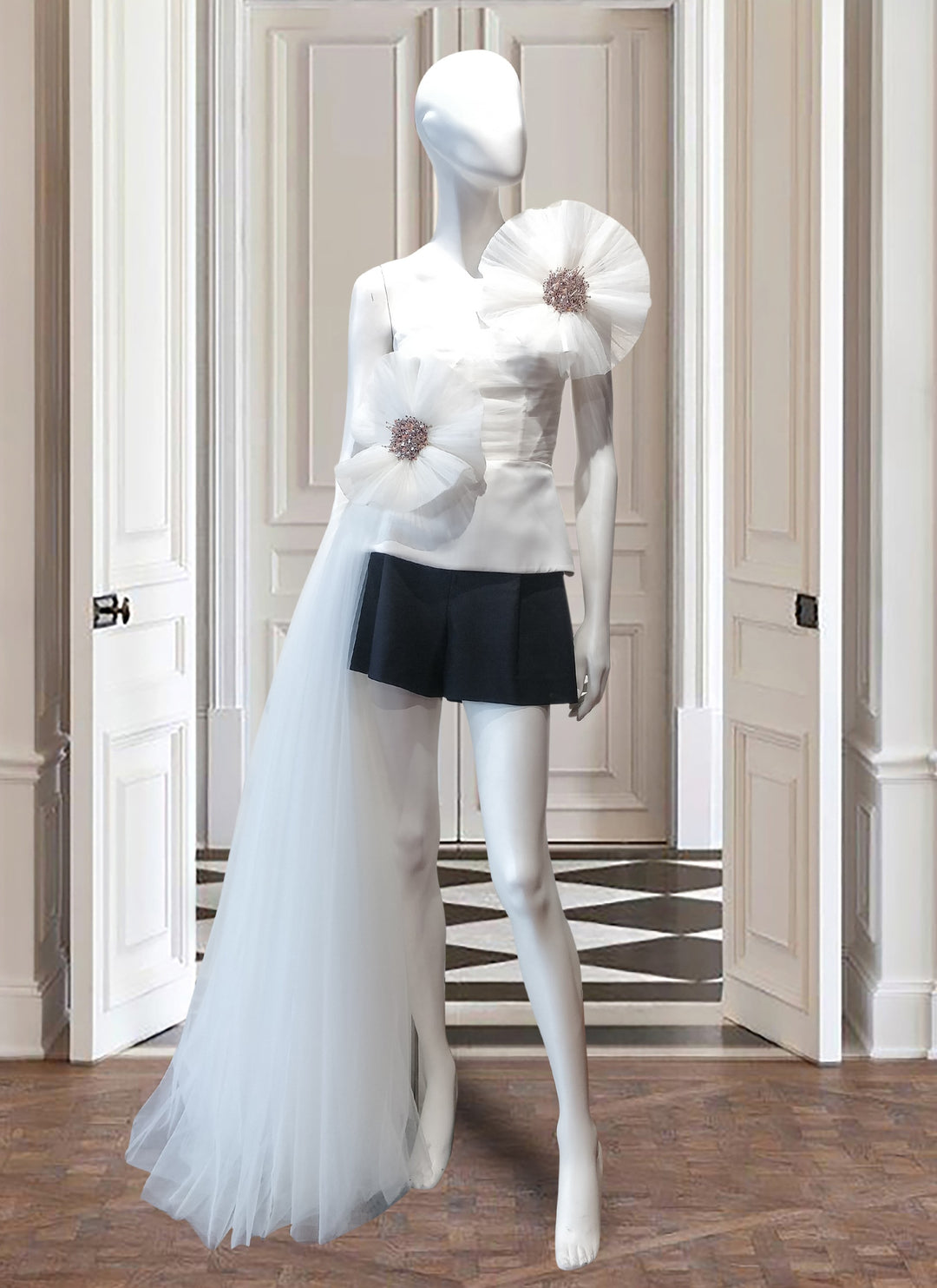 Sparkly tulle corsetted top with peplum, side trail and sculpted flowers