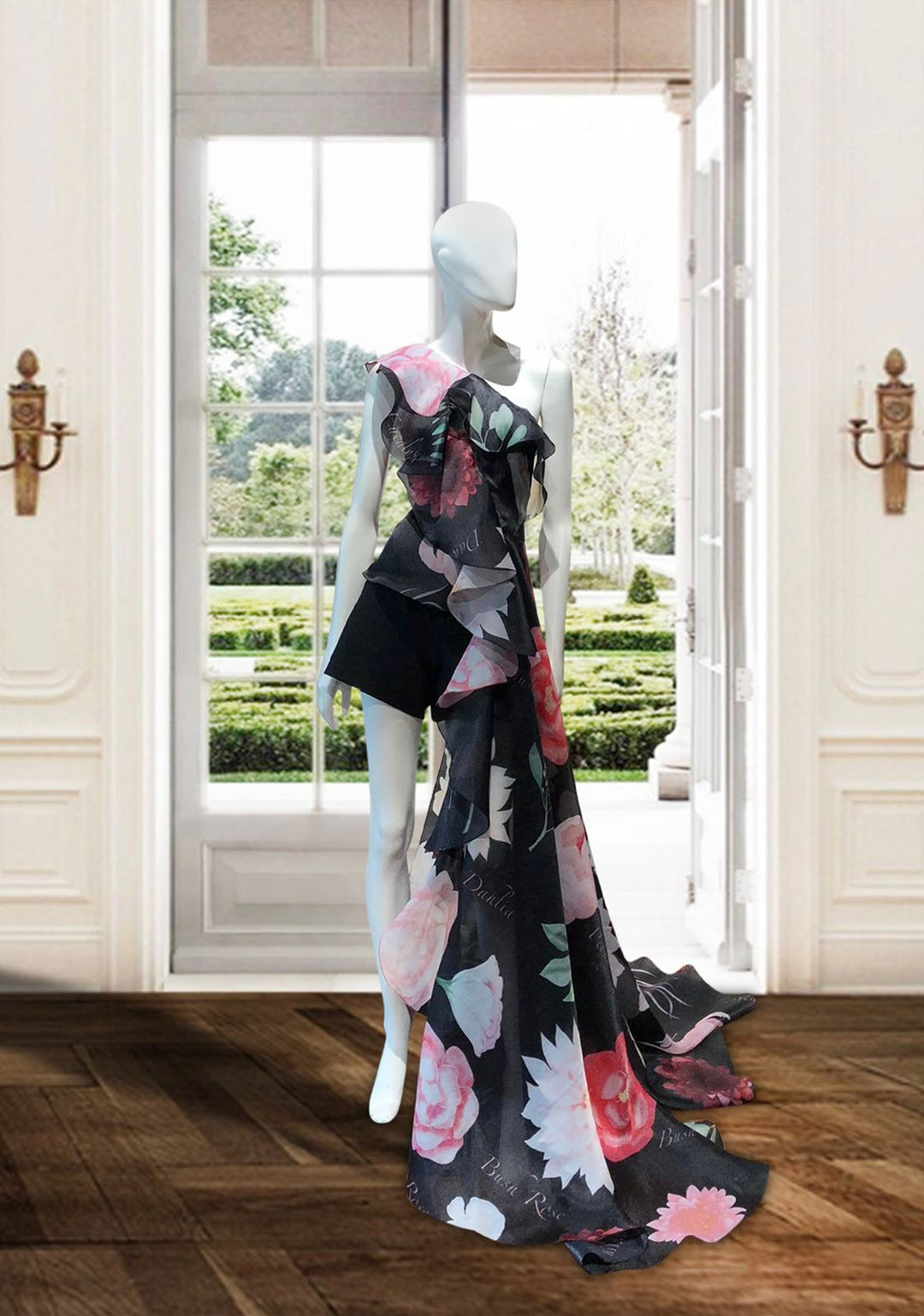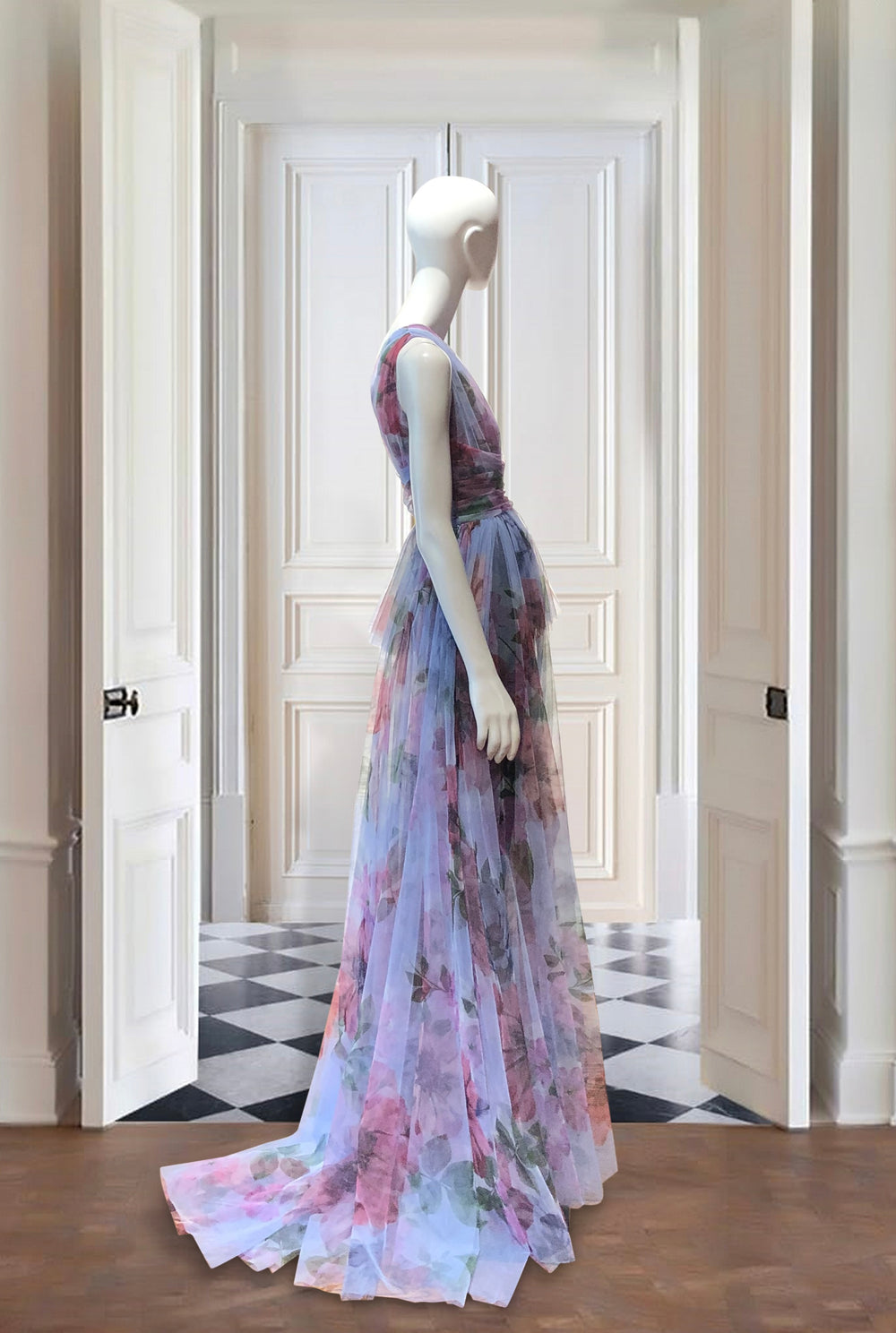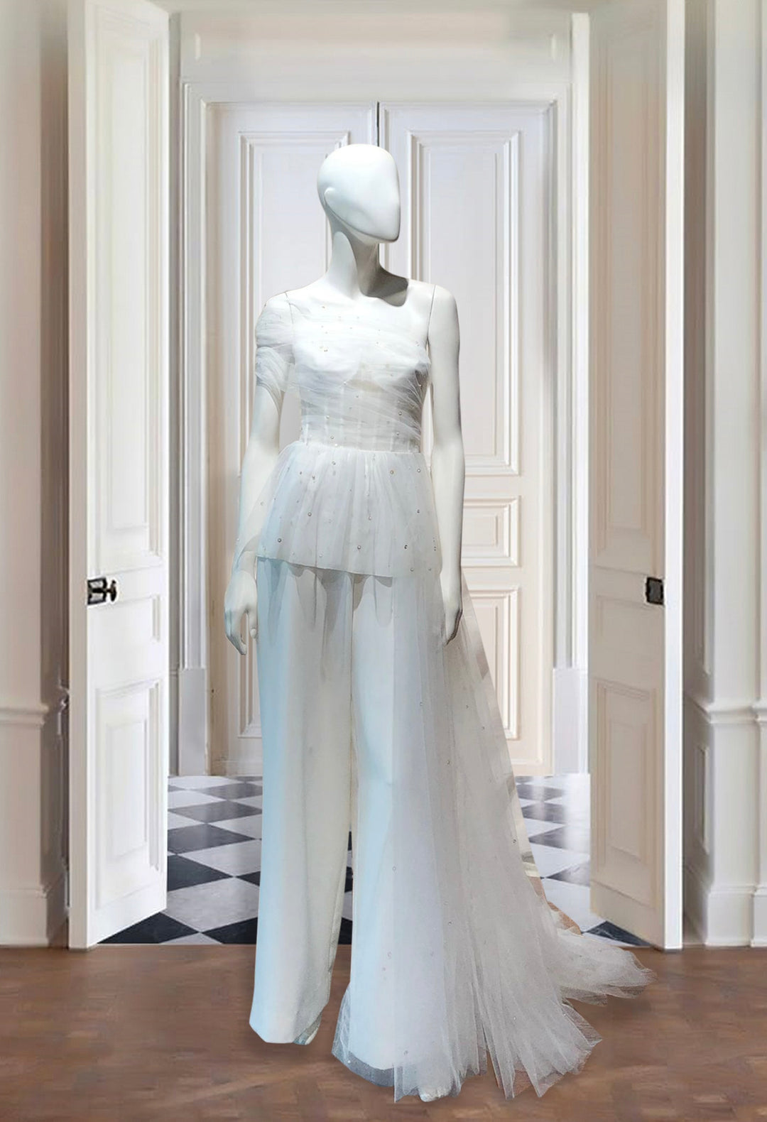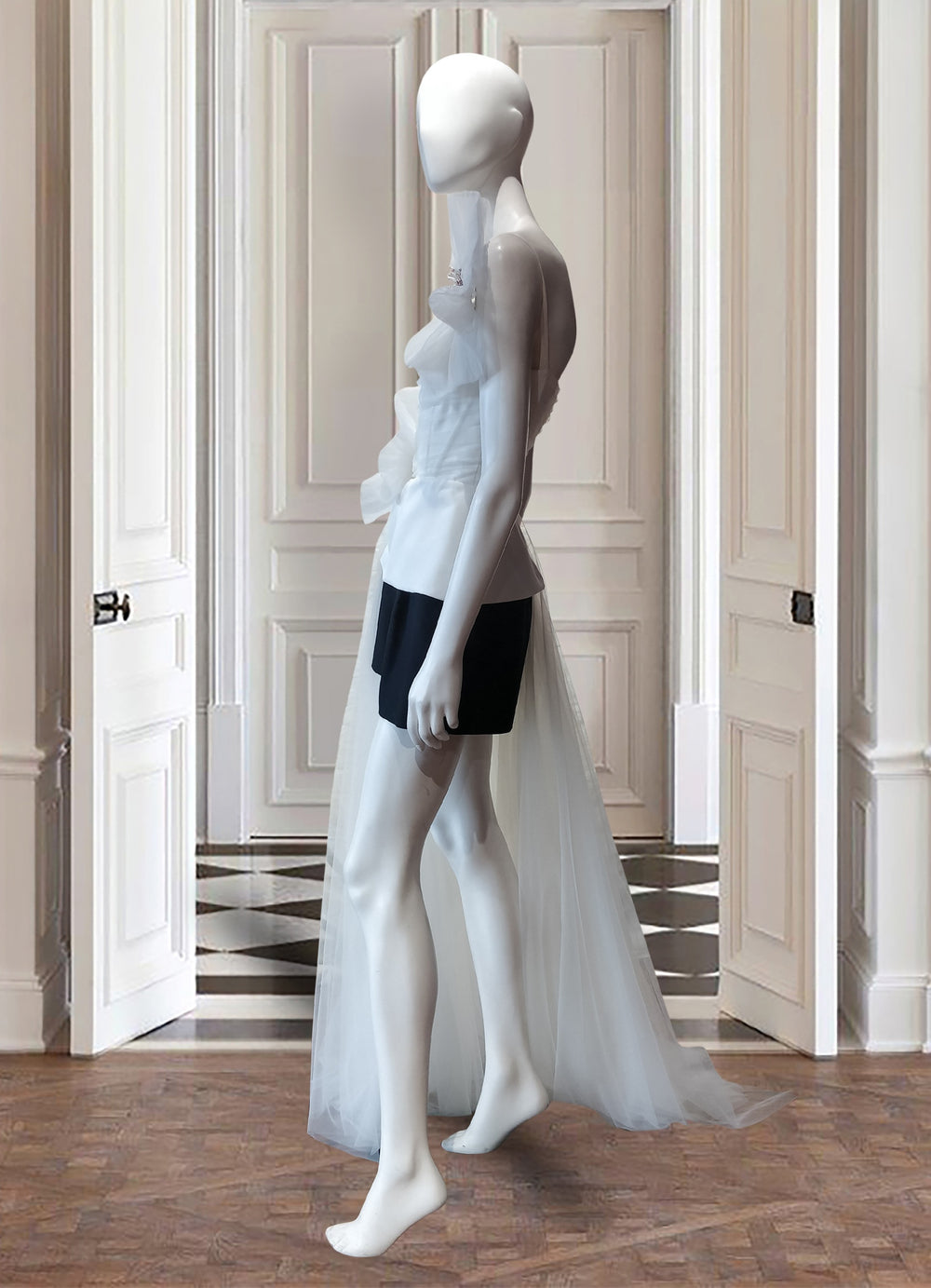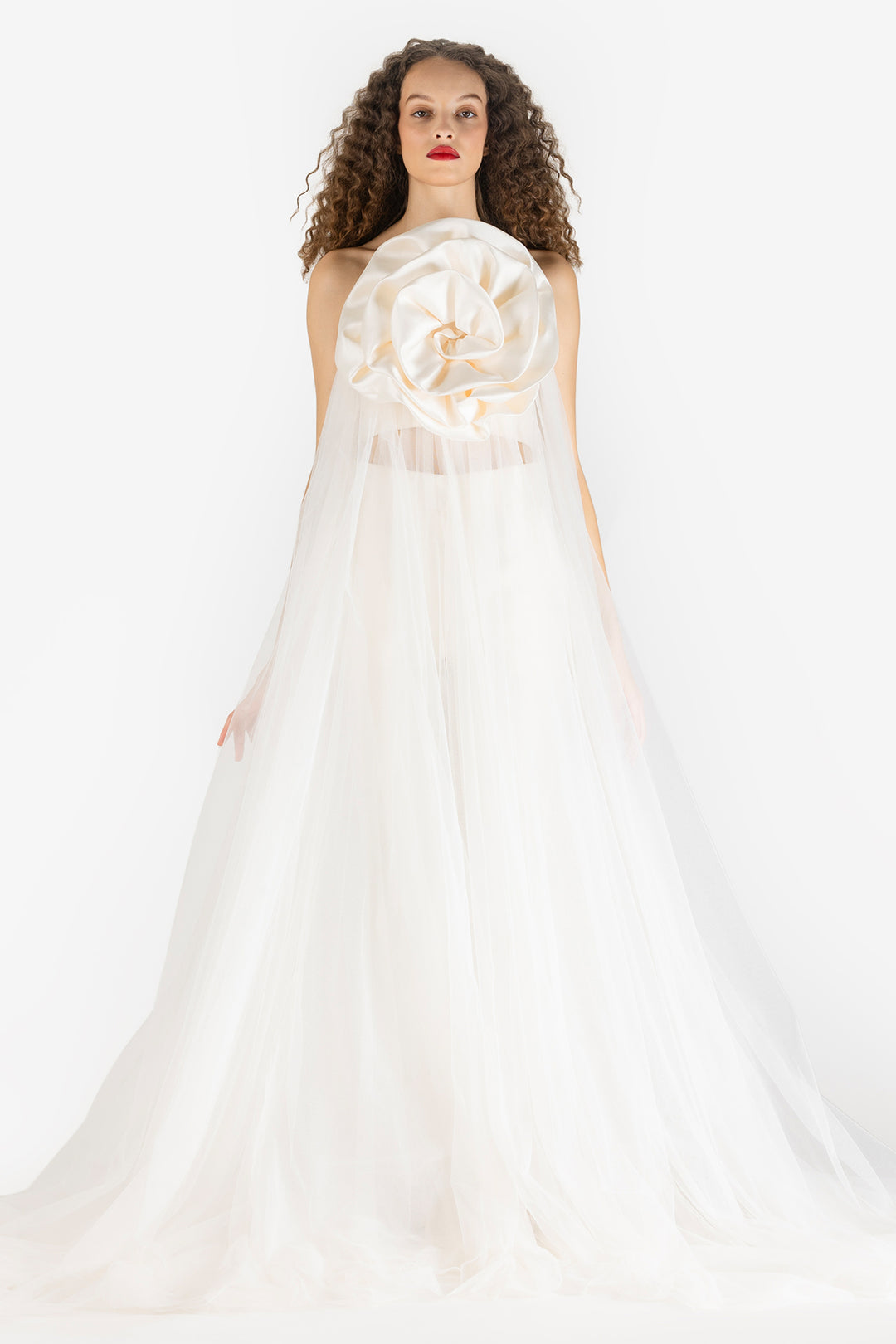 Sparkly tulle corsetted top with peplum, side trail and sculpted flowers