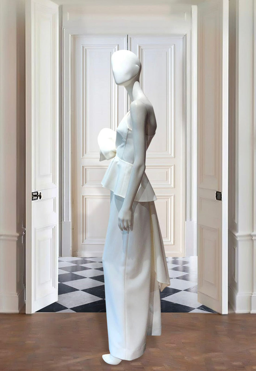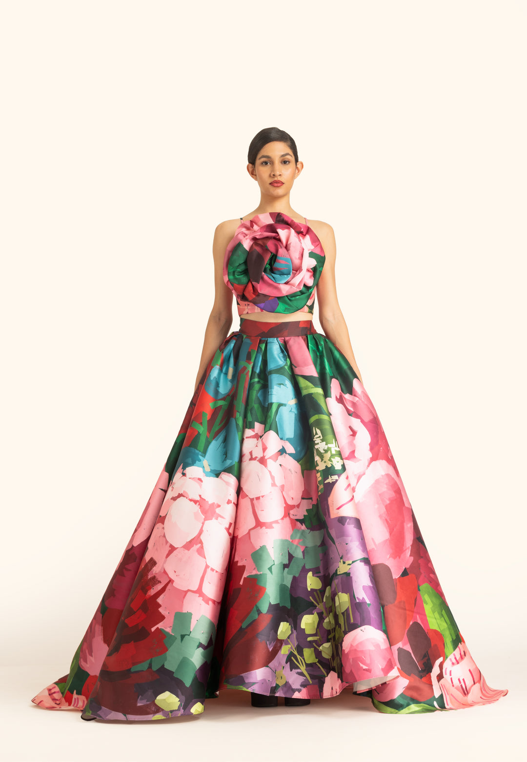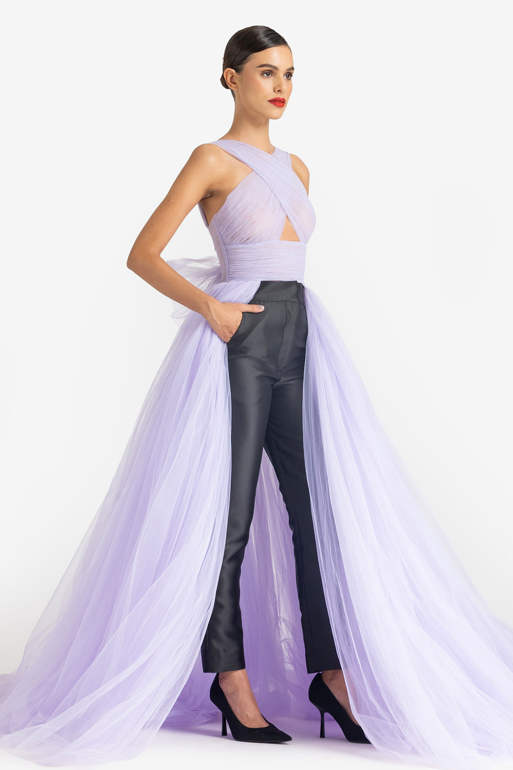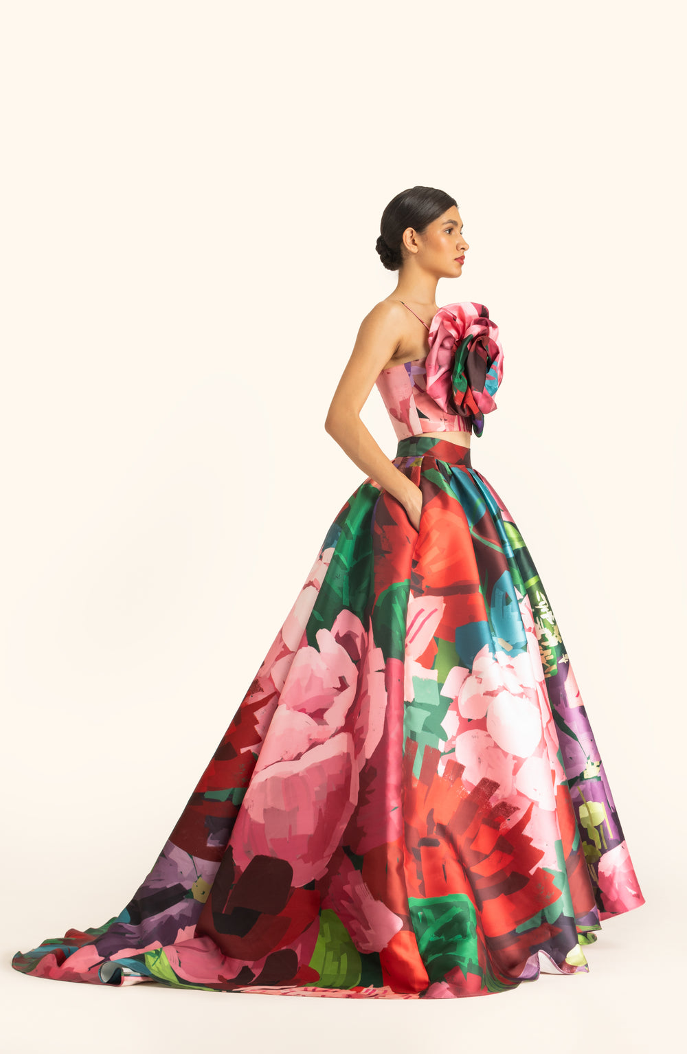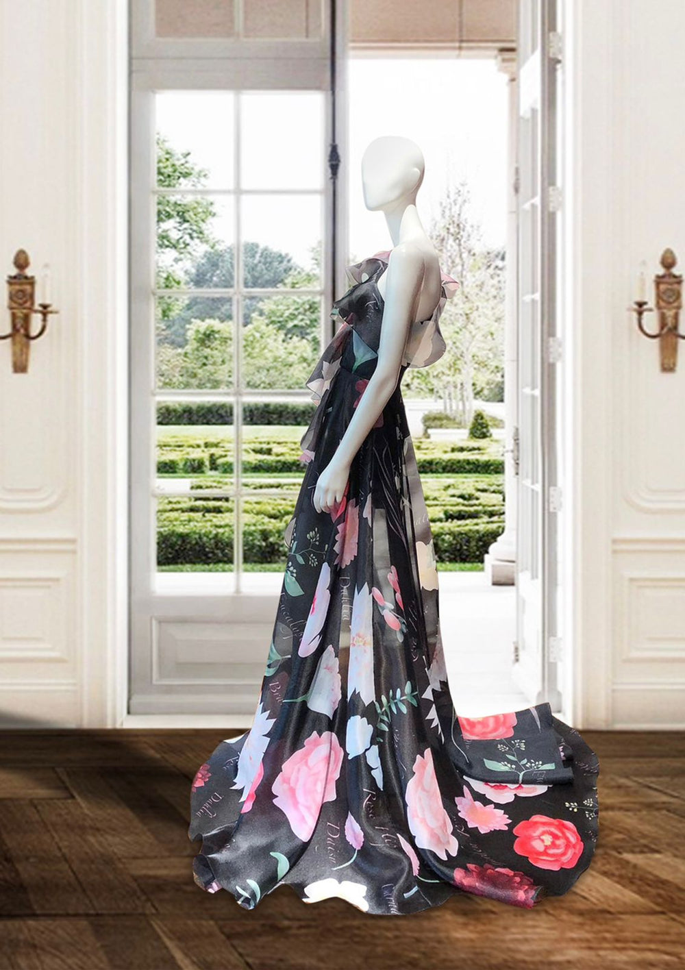 Sparkly tulle corsetted top with peplum, side trail and sculpted flowers