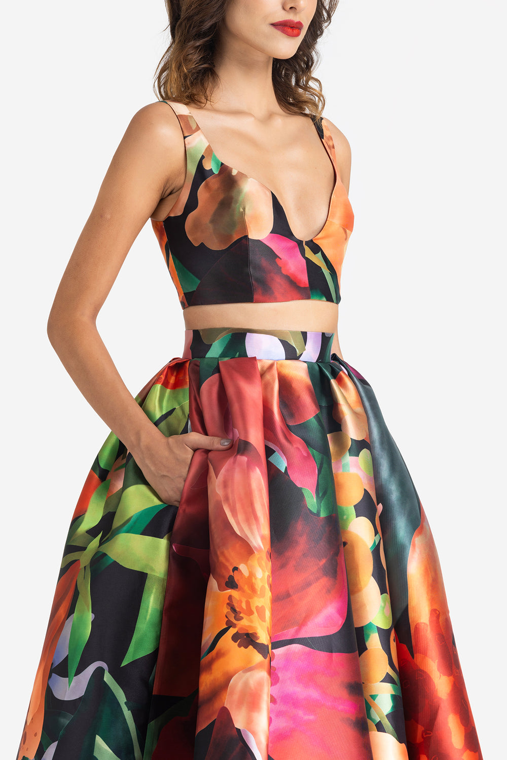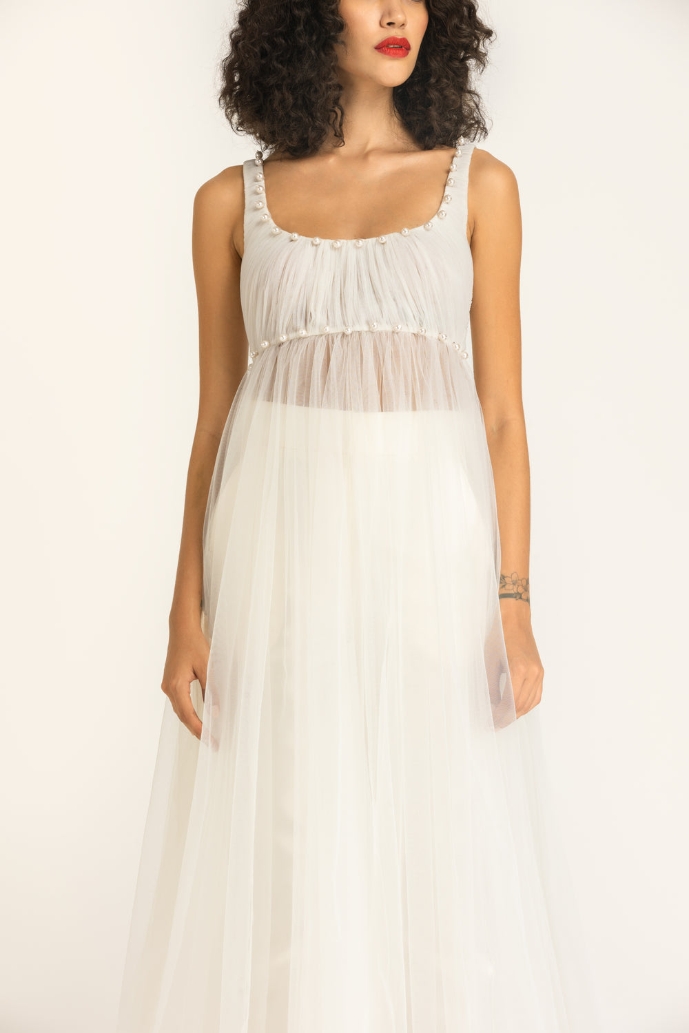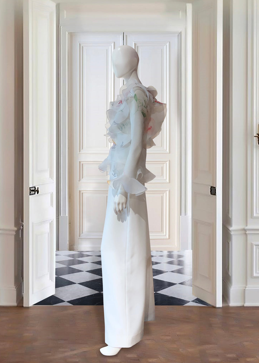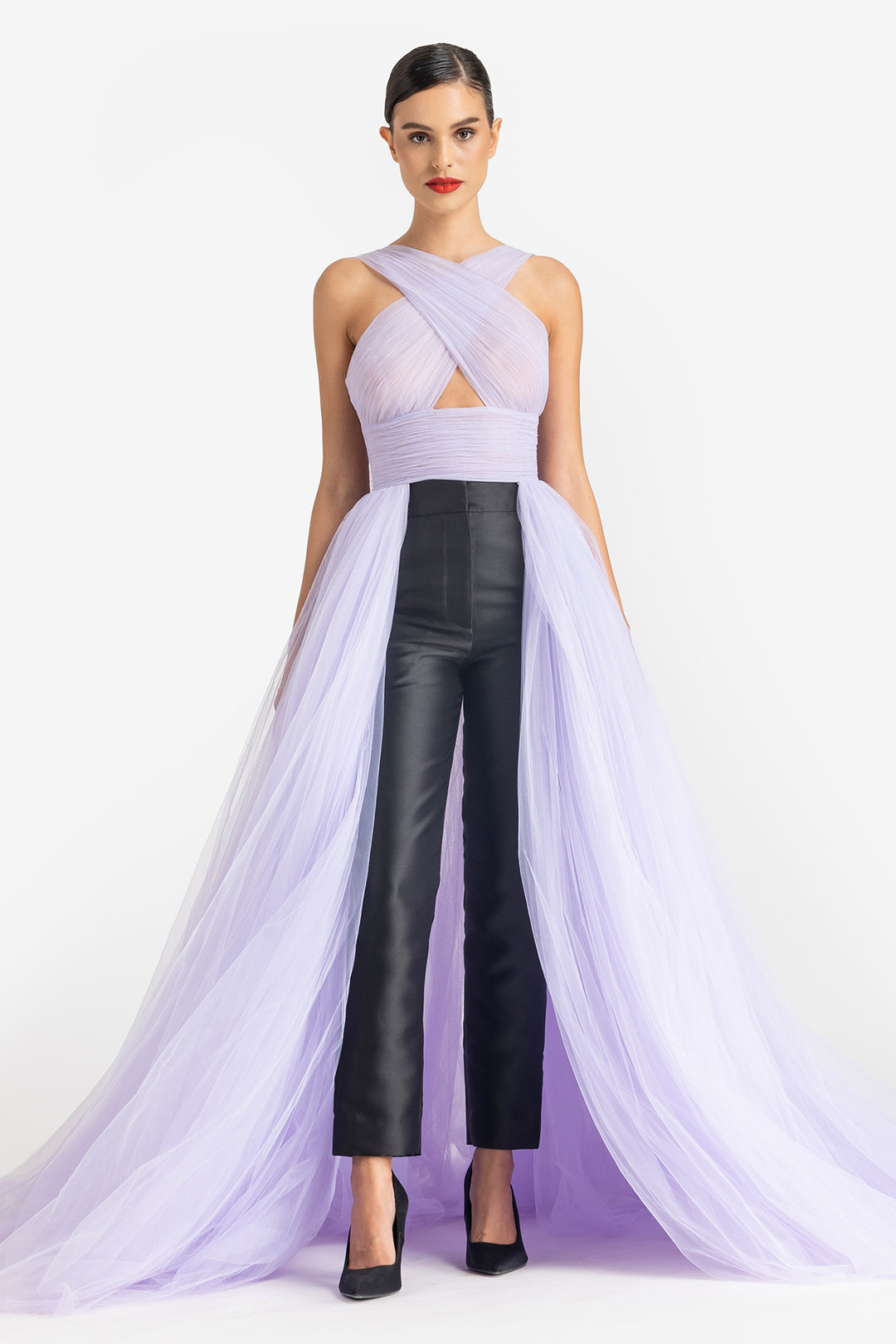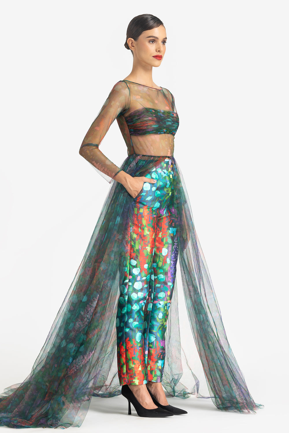 Sparkly tulle corsetted top with peplum, side trail and sculpted flowers