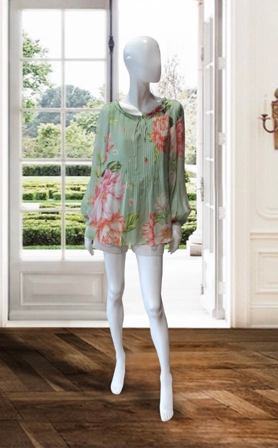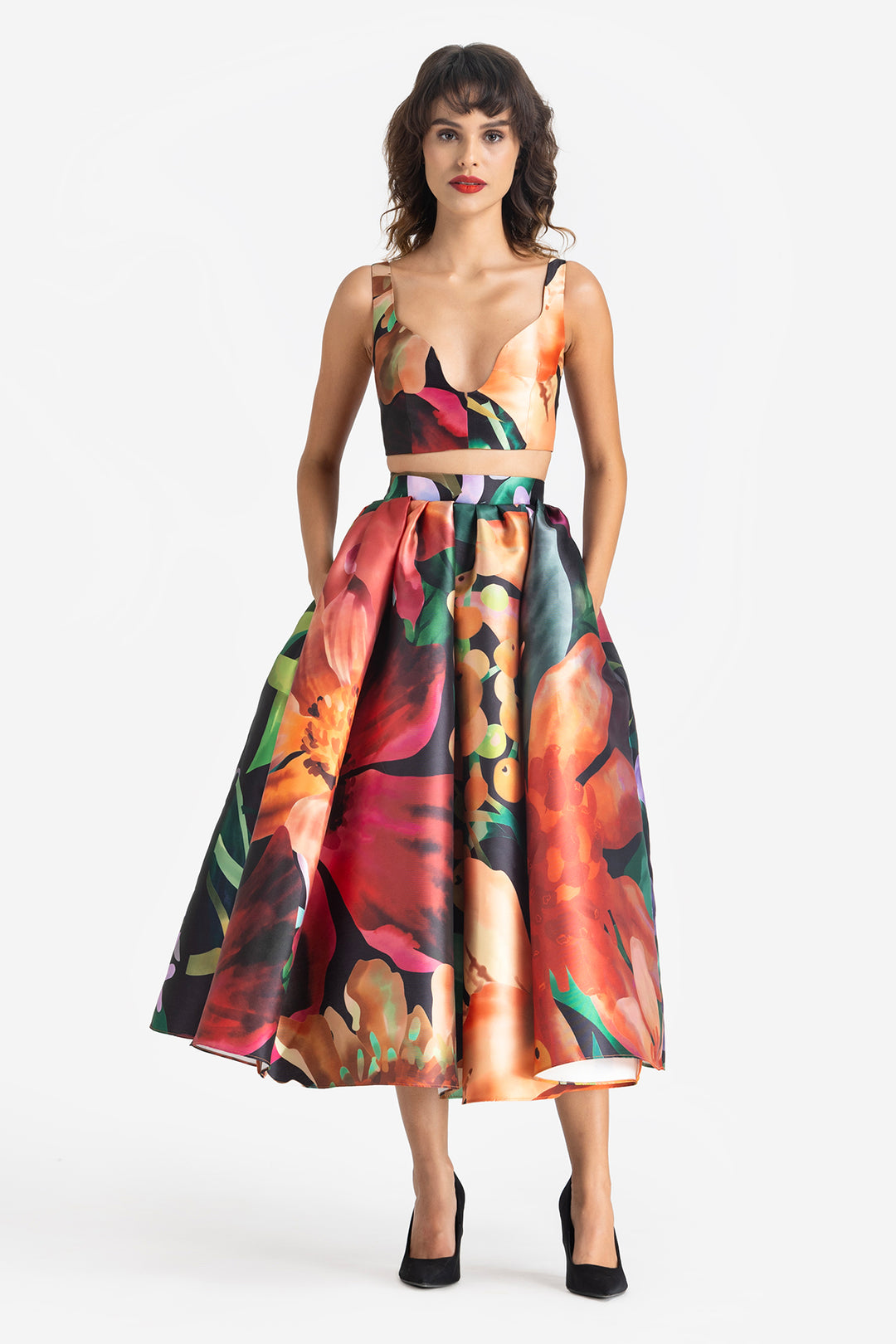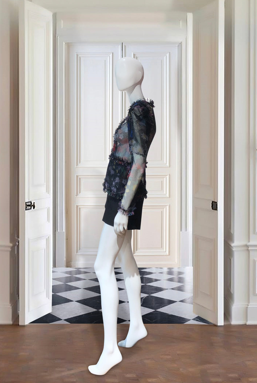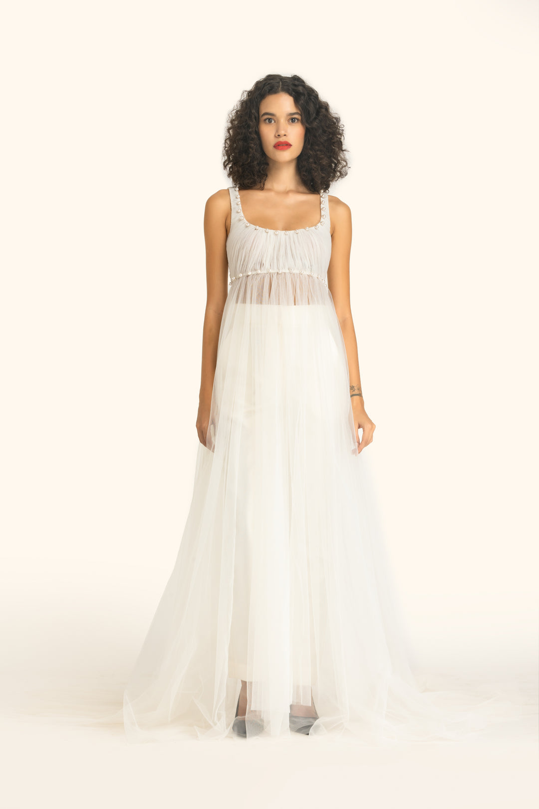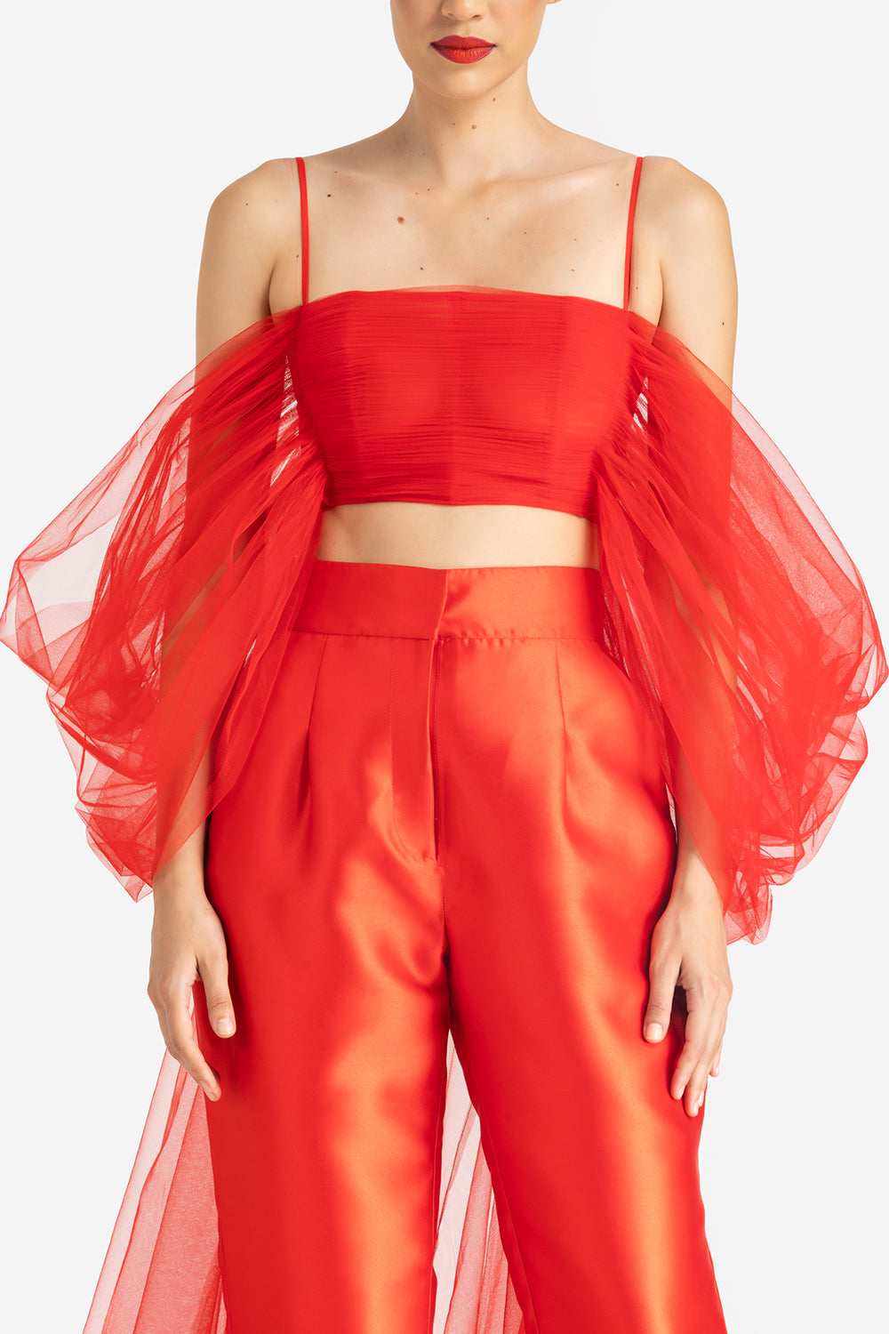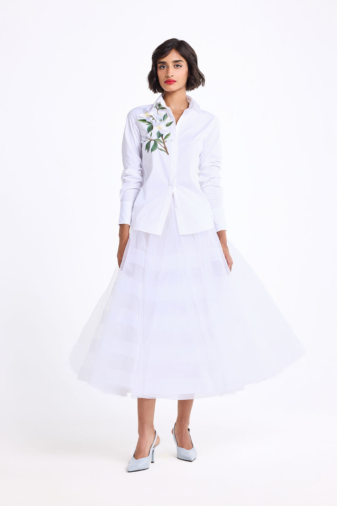 Sparkly tulle corsetted top with peplum, side trail and sculpted flowers