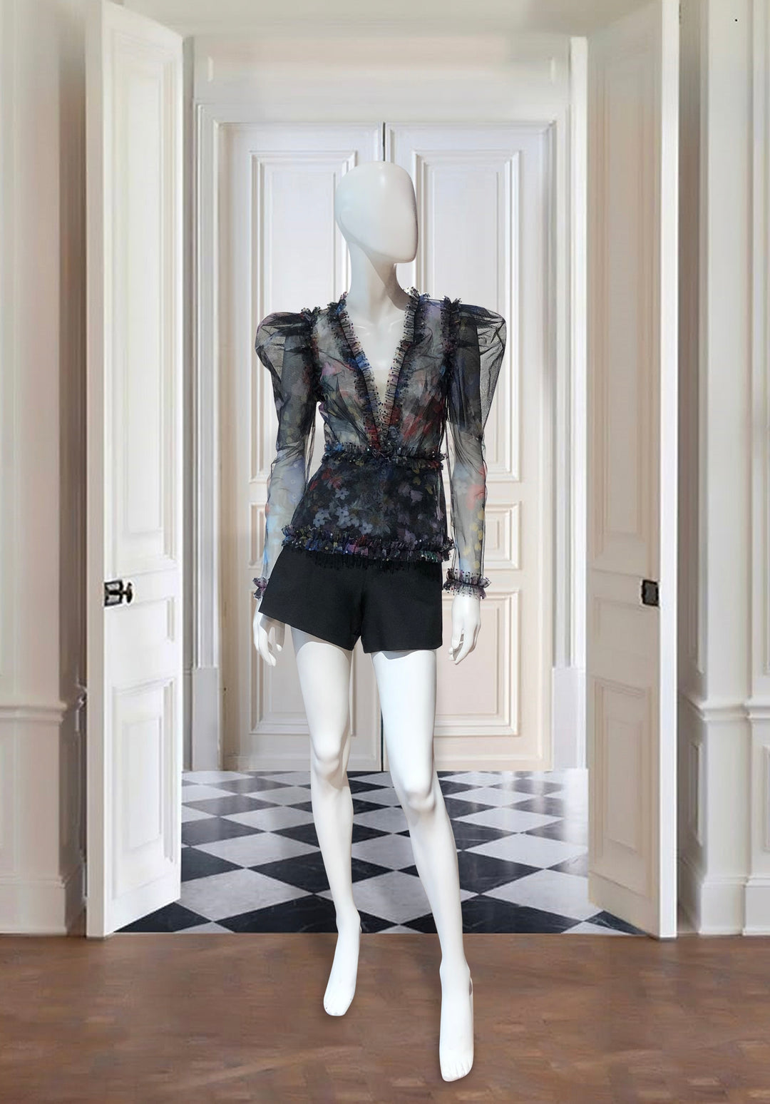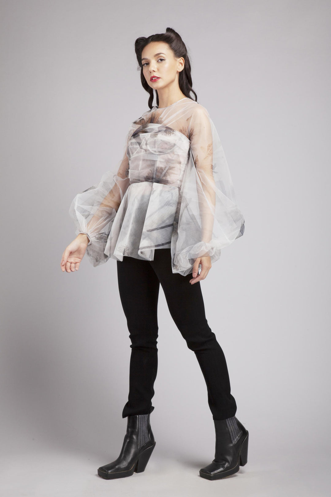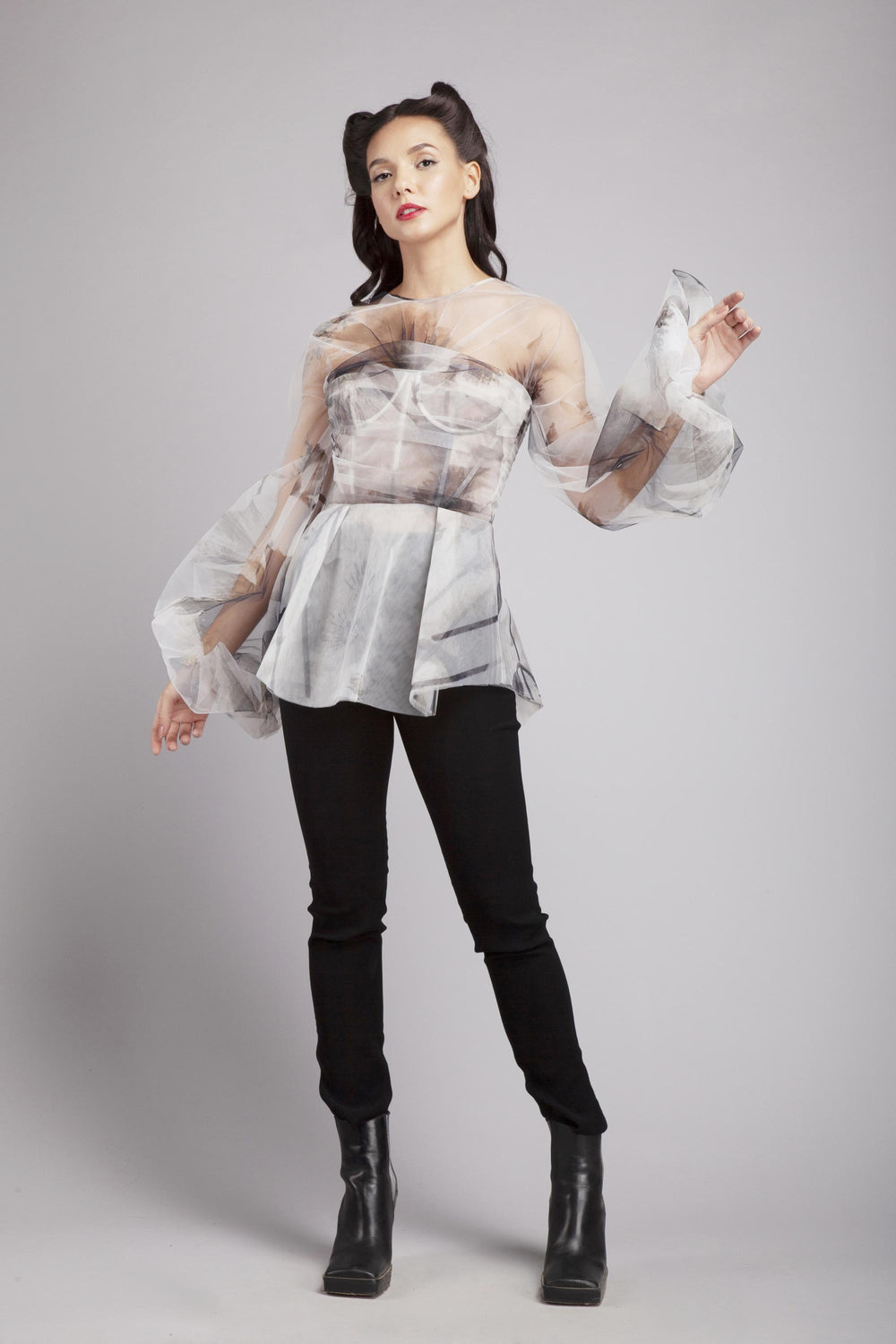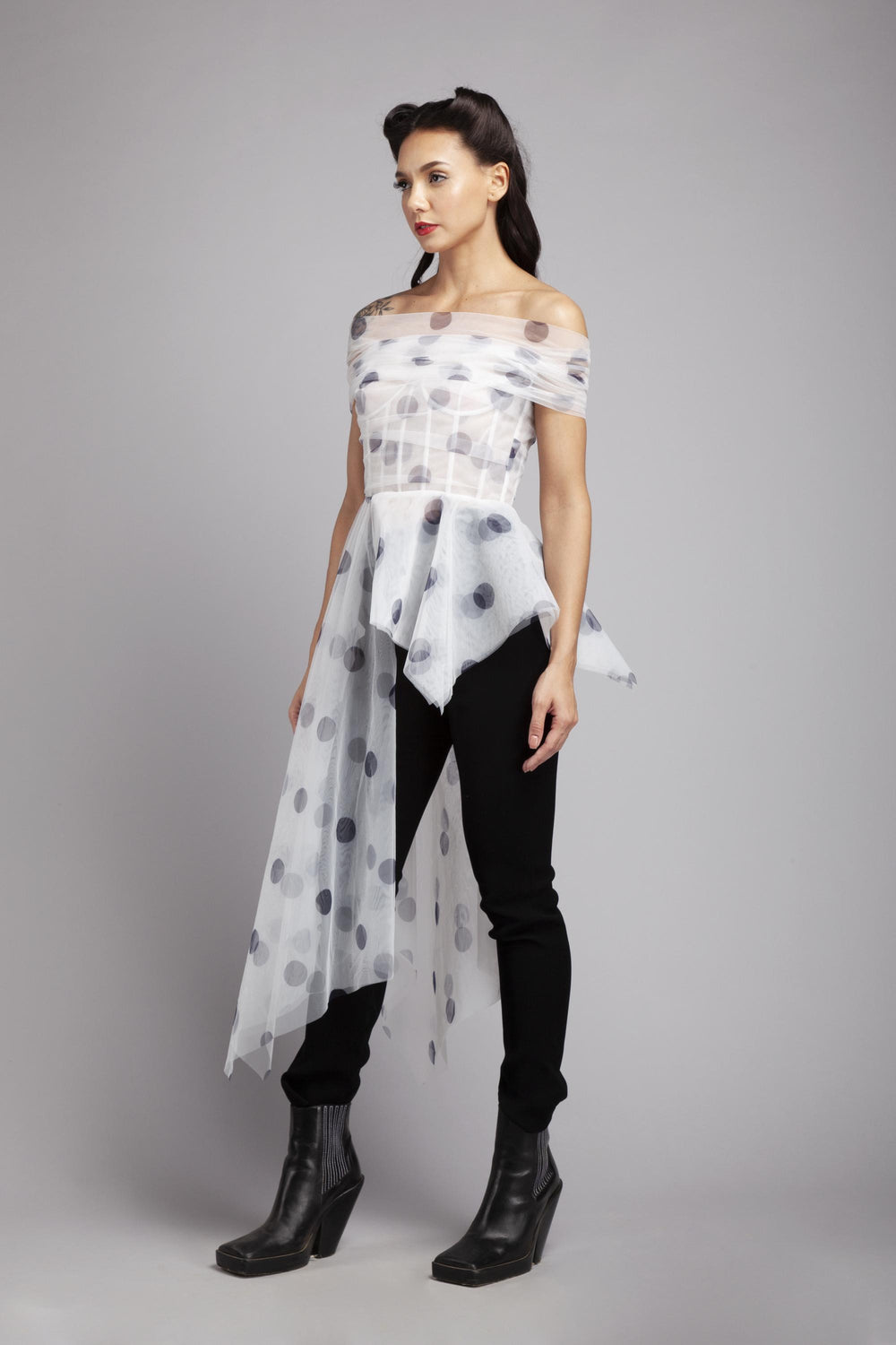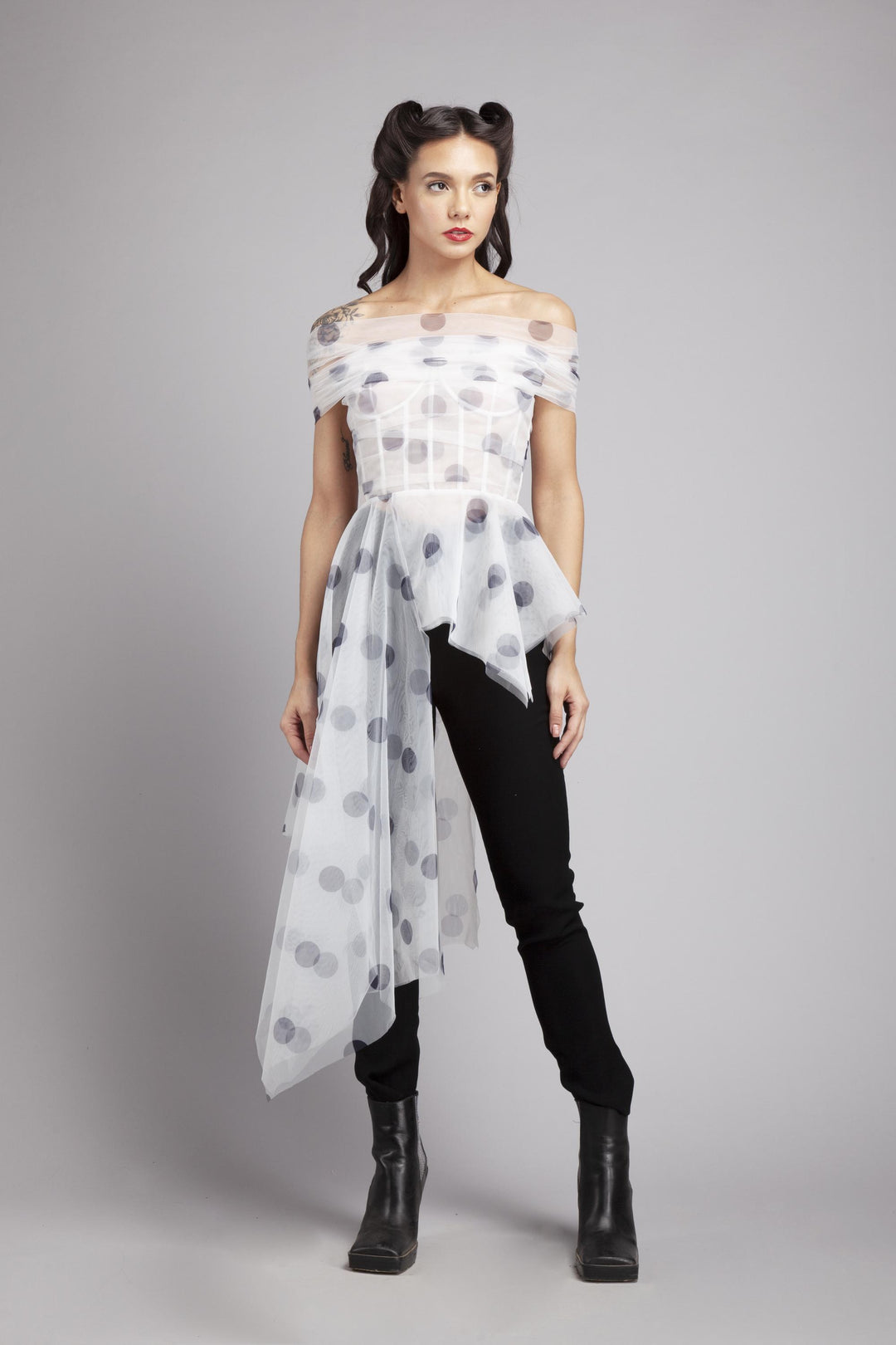 Corsetted high low peplum top with shoulder drape and klimt embroidery