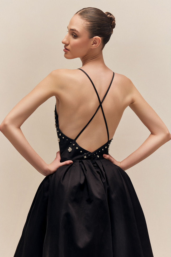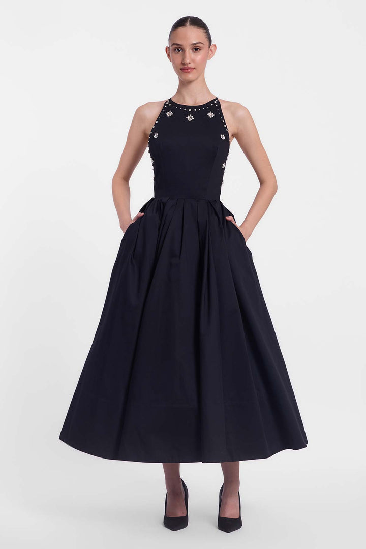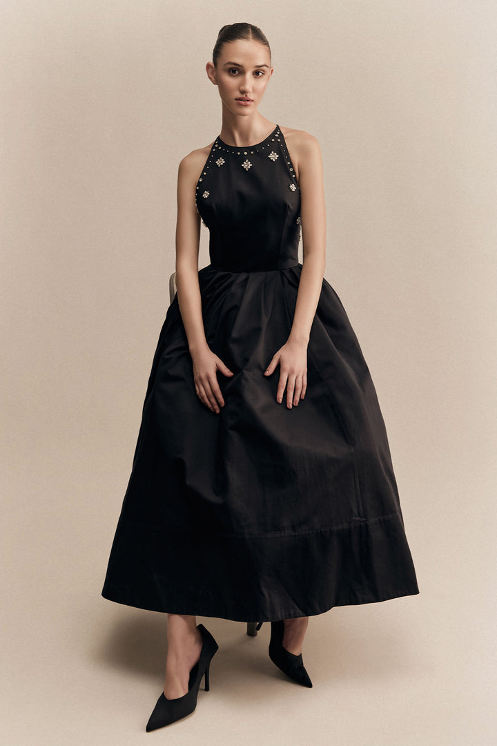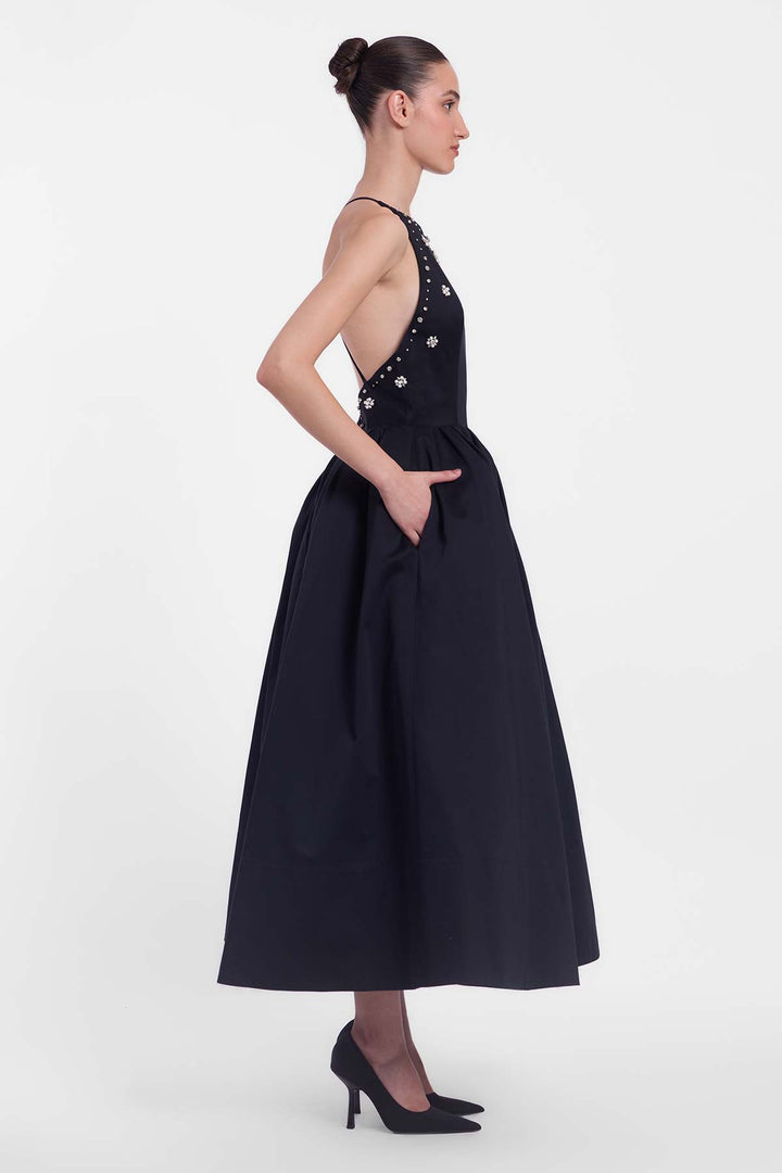 Backless Halter Neck Midi with Pearl and Crystal Embroidery.