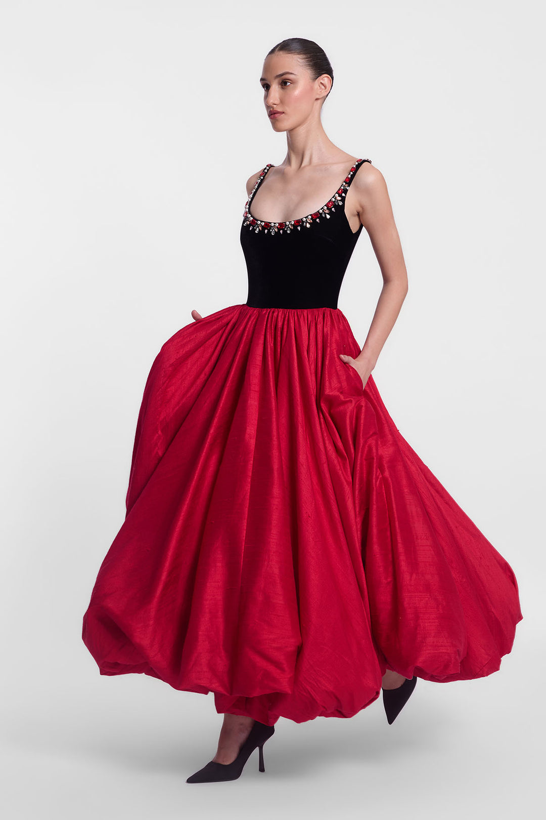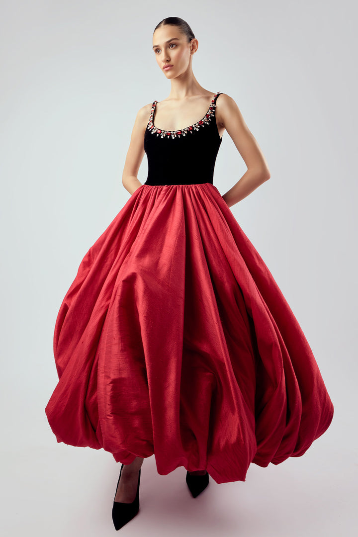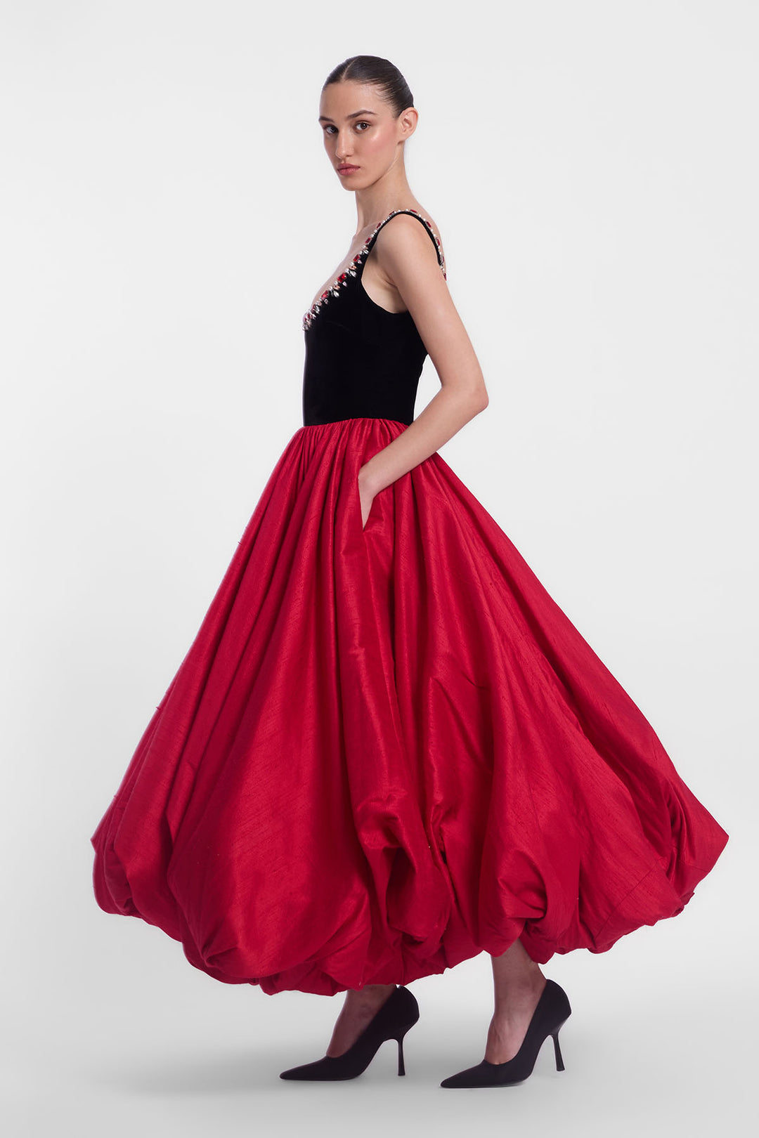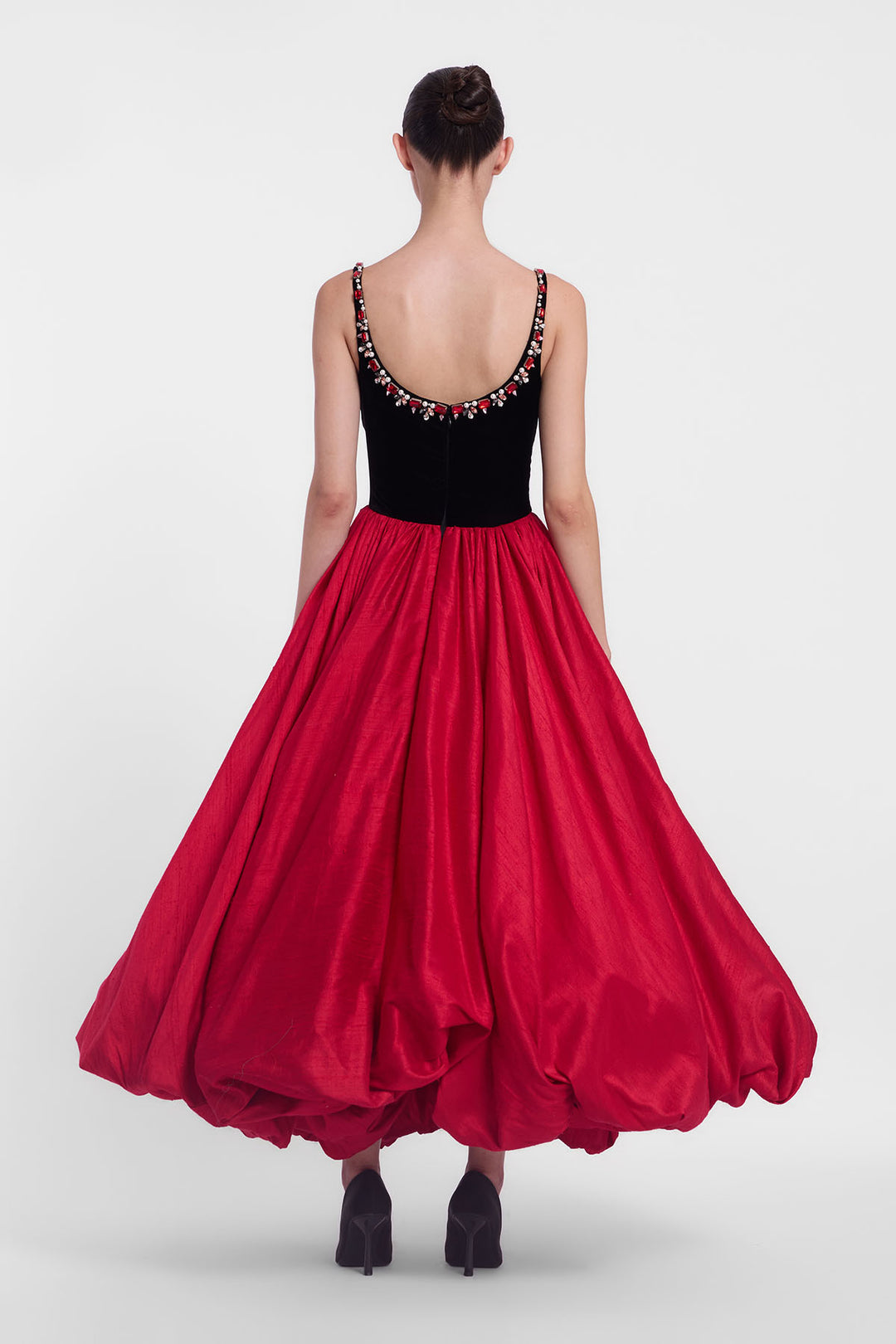 Velvet and Raw Silk Midi with Balloon Hem Accentuated with Crystal Embroidery
