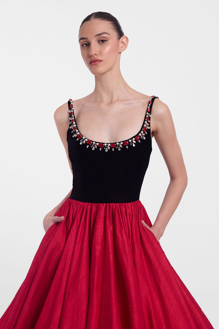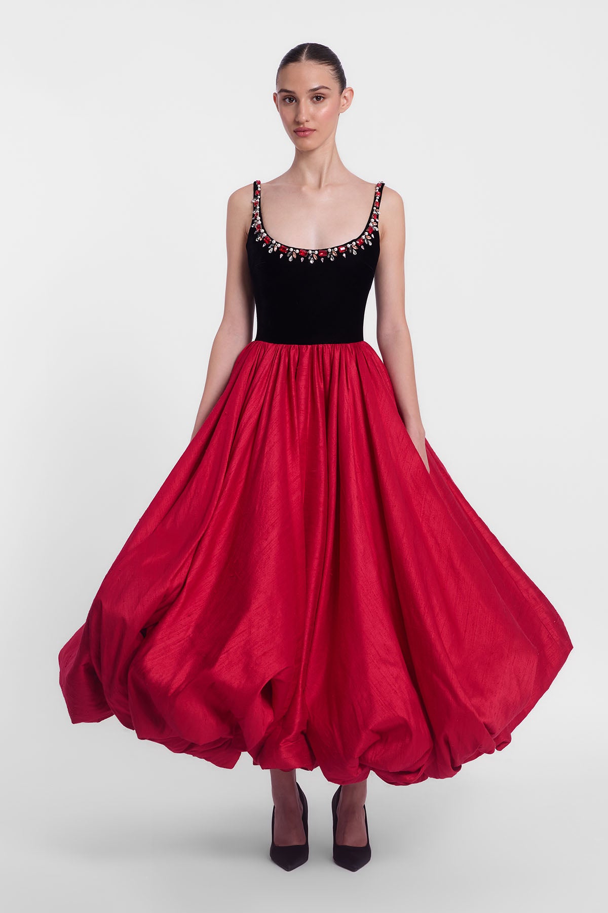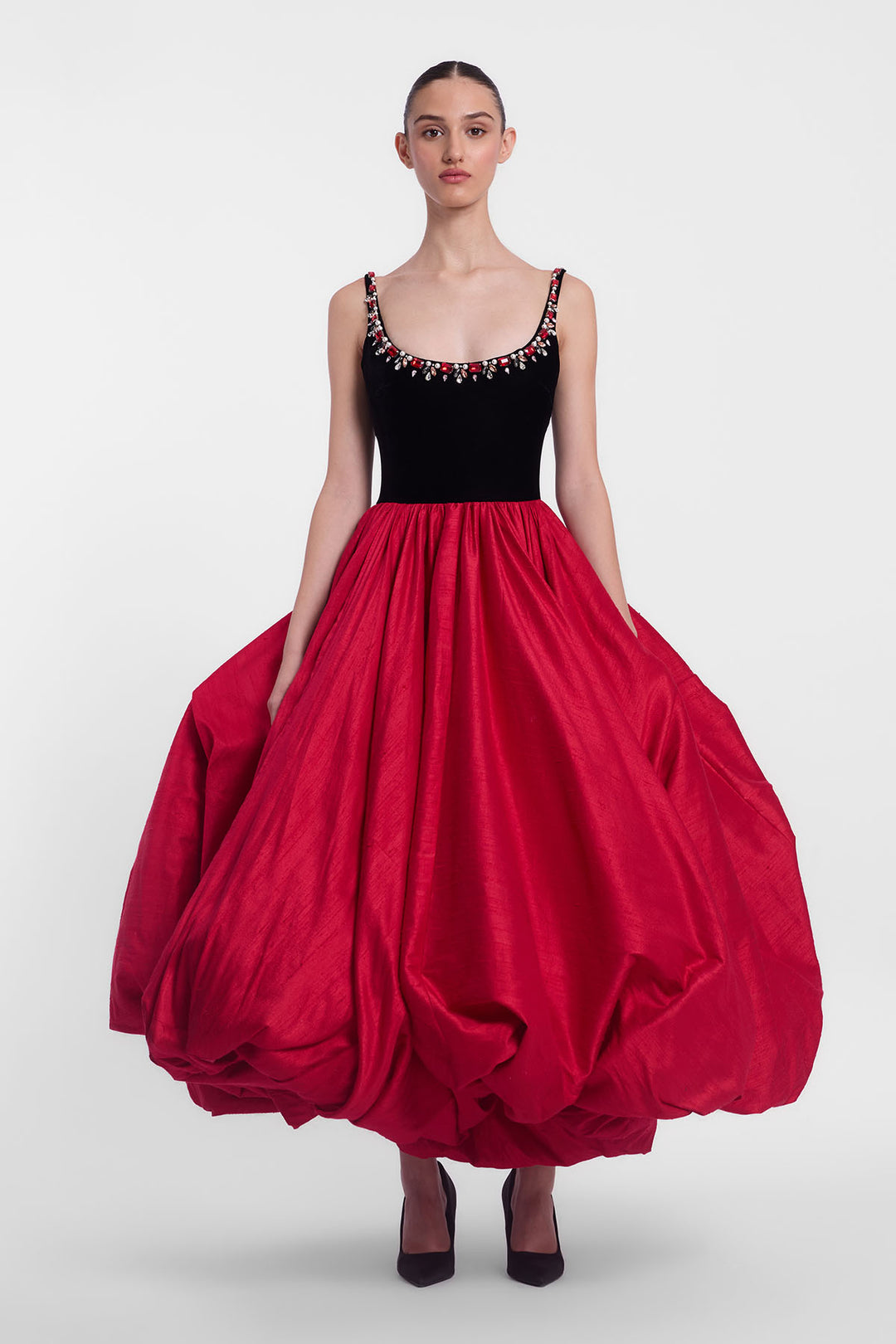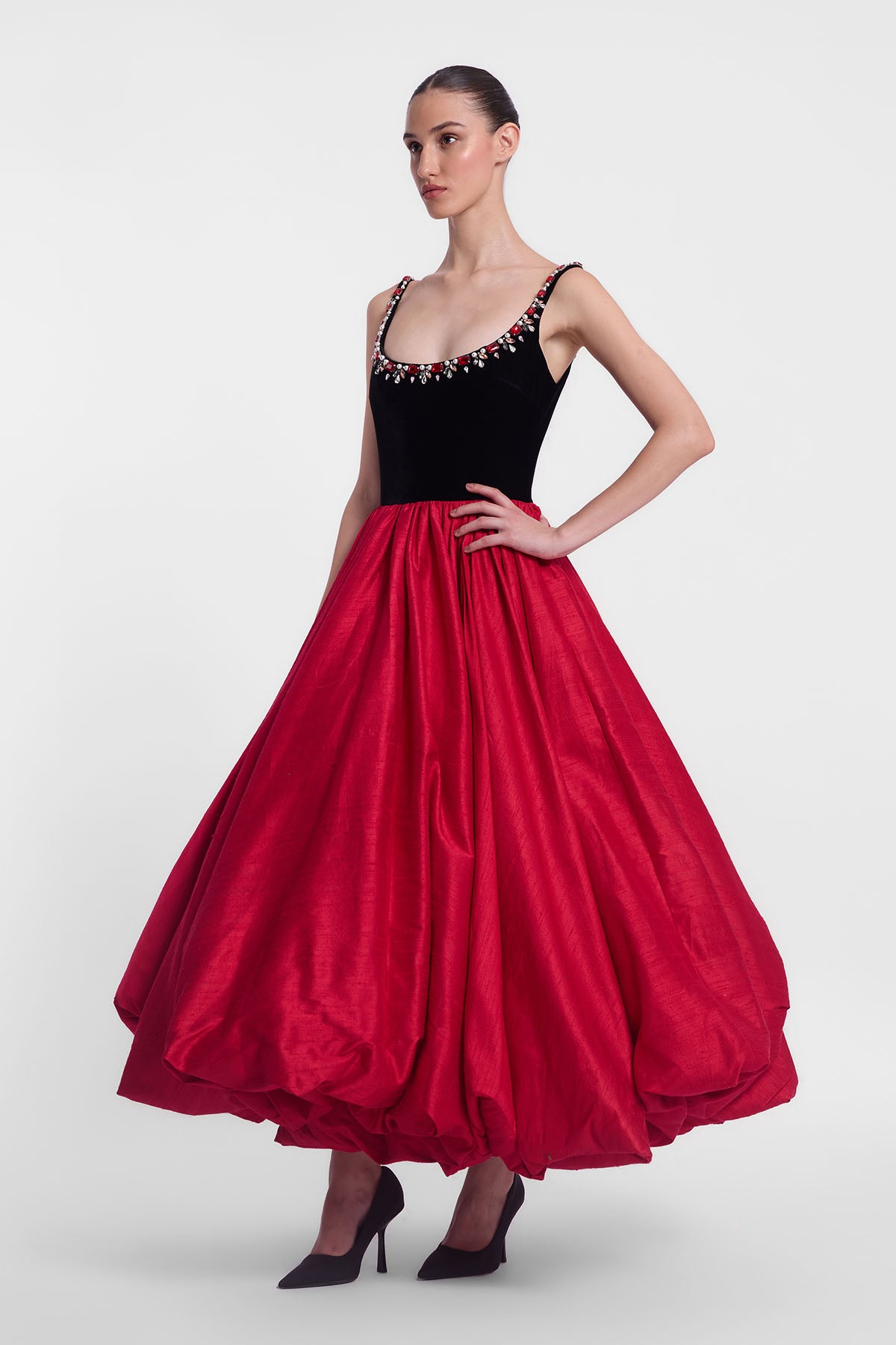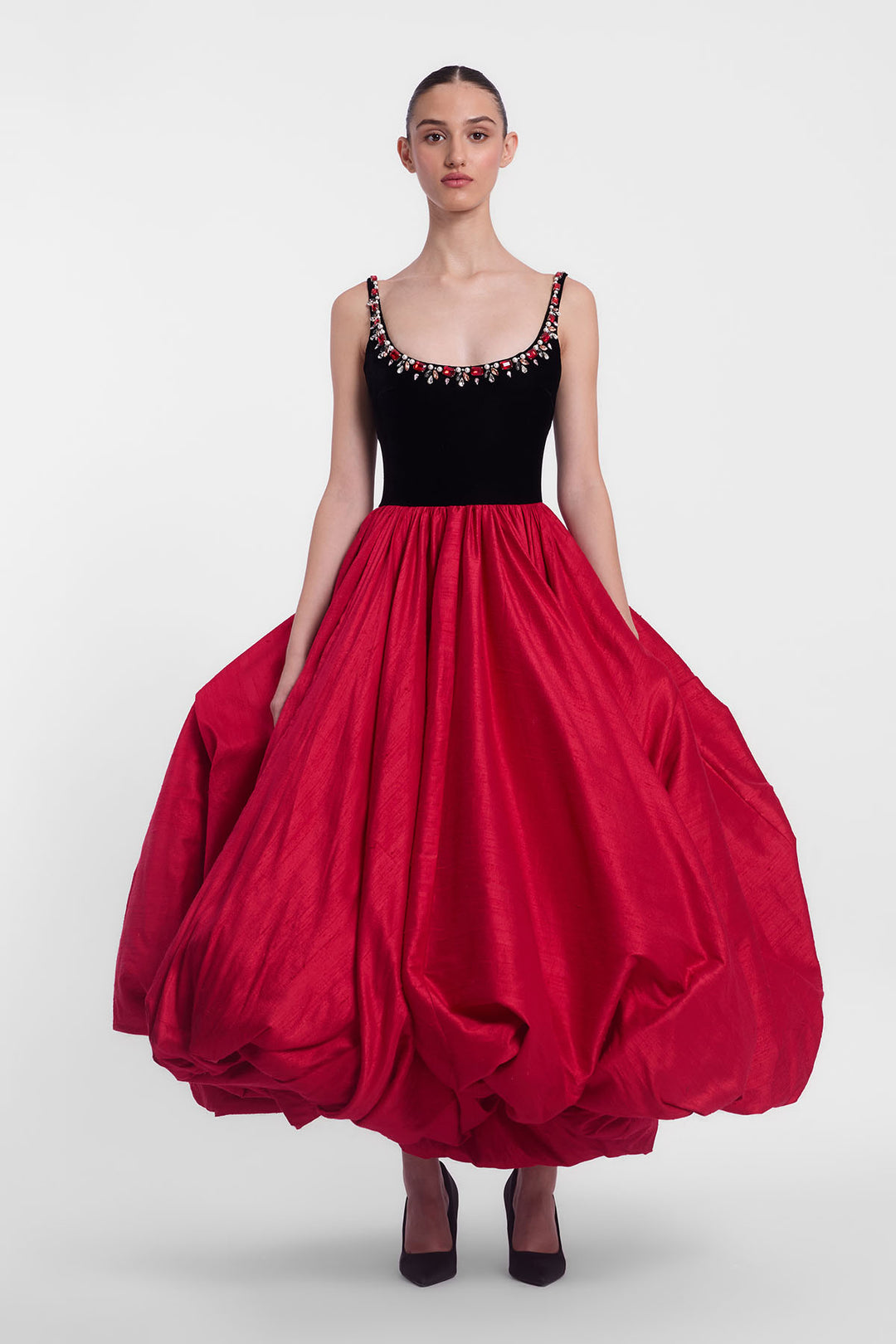 Velvet and Raw Silk Midi with Balloon Hem Accentuated with Crystal Embroidery