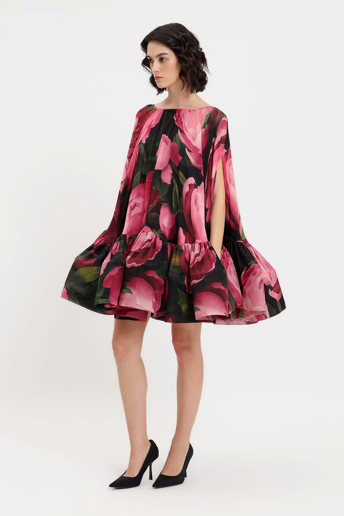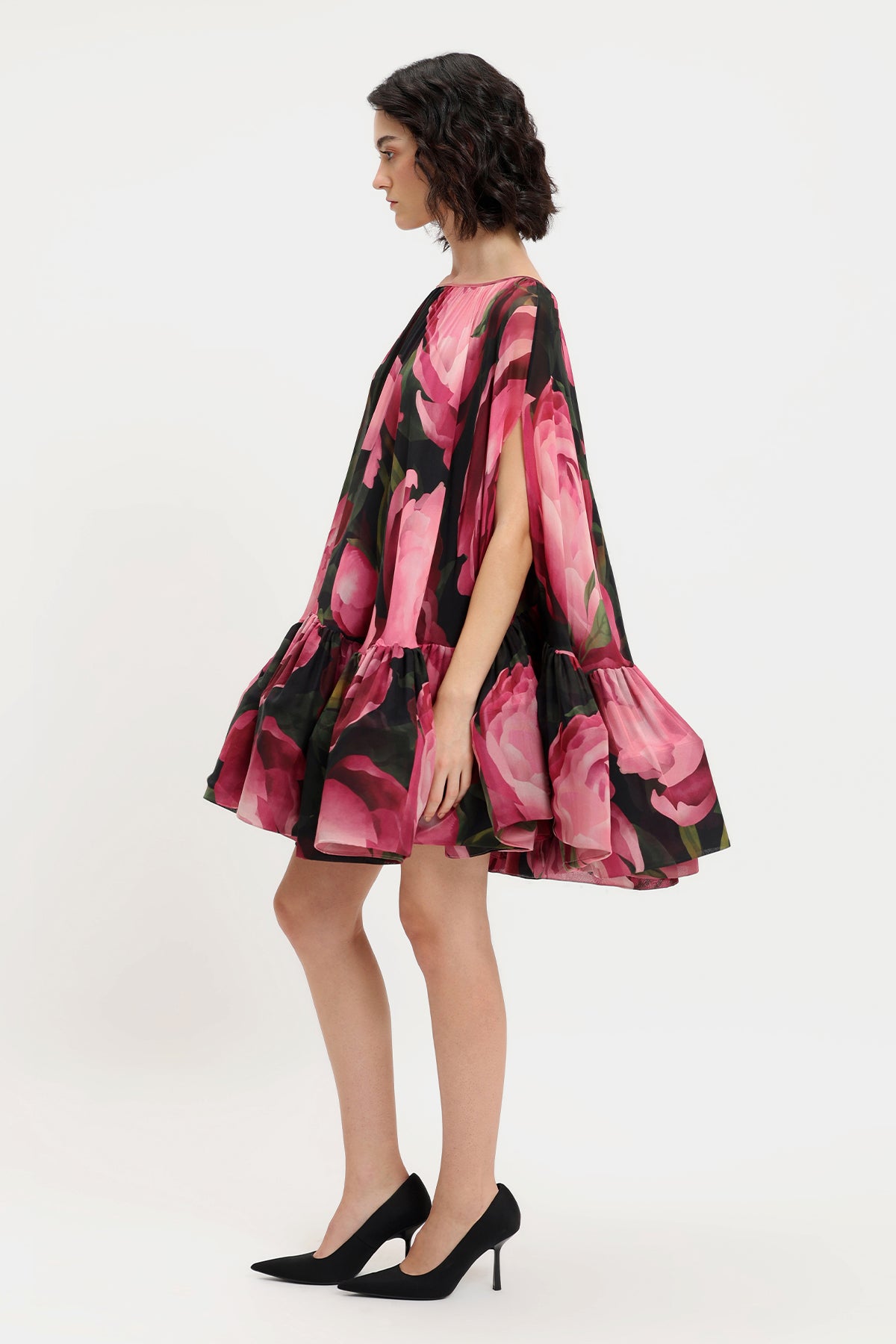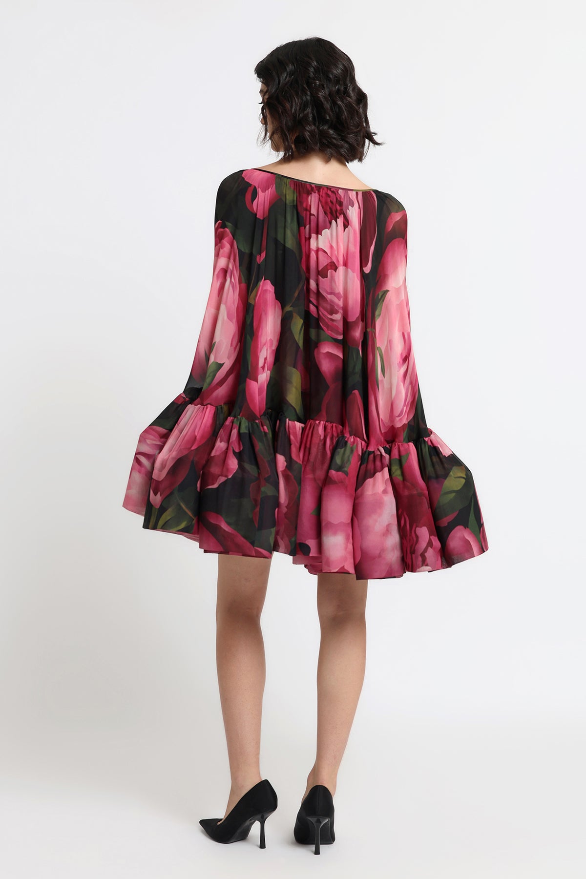 Boat Neck Trapeze Dress with Ruffled Horsehair Border in Pure Chiffon