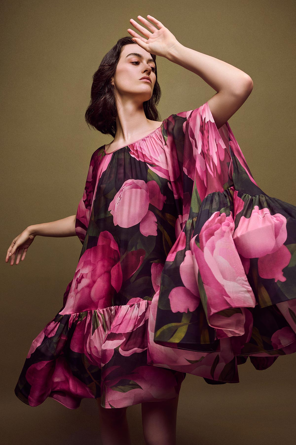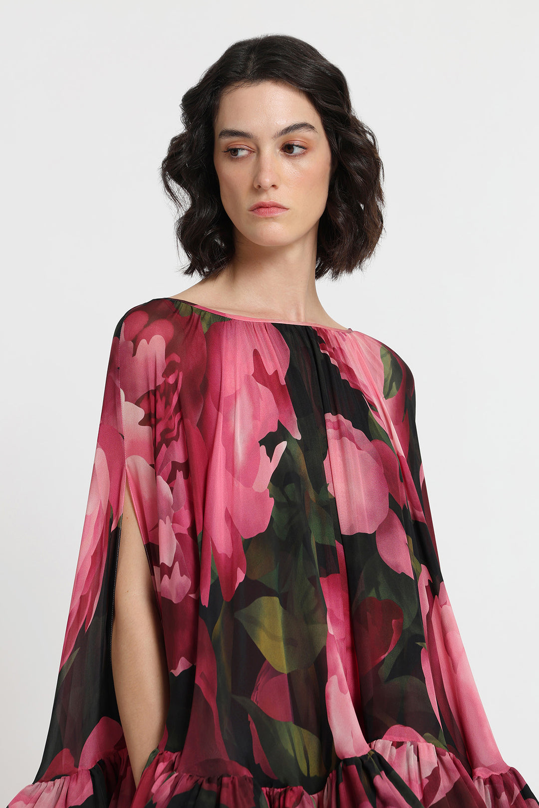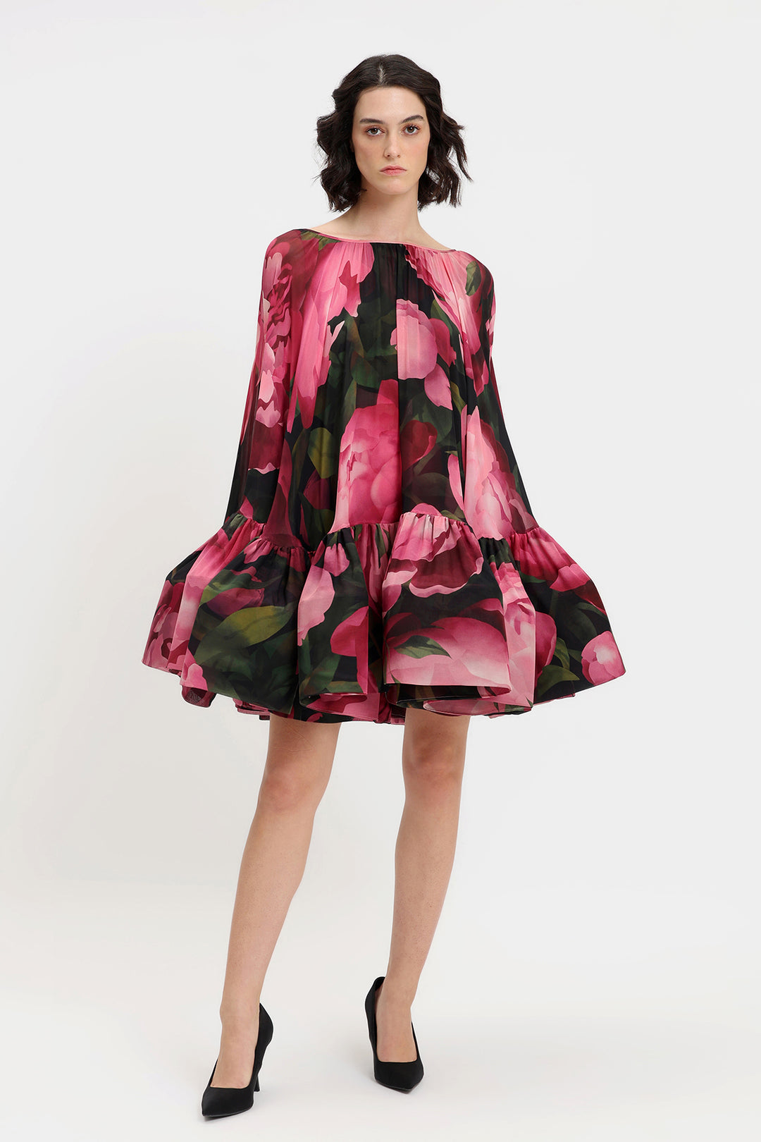 Boat Neck Trapeze Dress with Ruffled Horsehair Border in Pure Chiffon