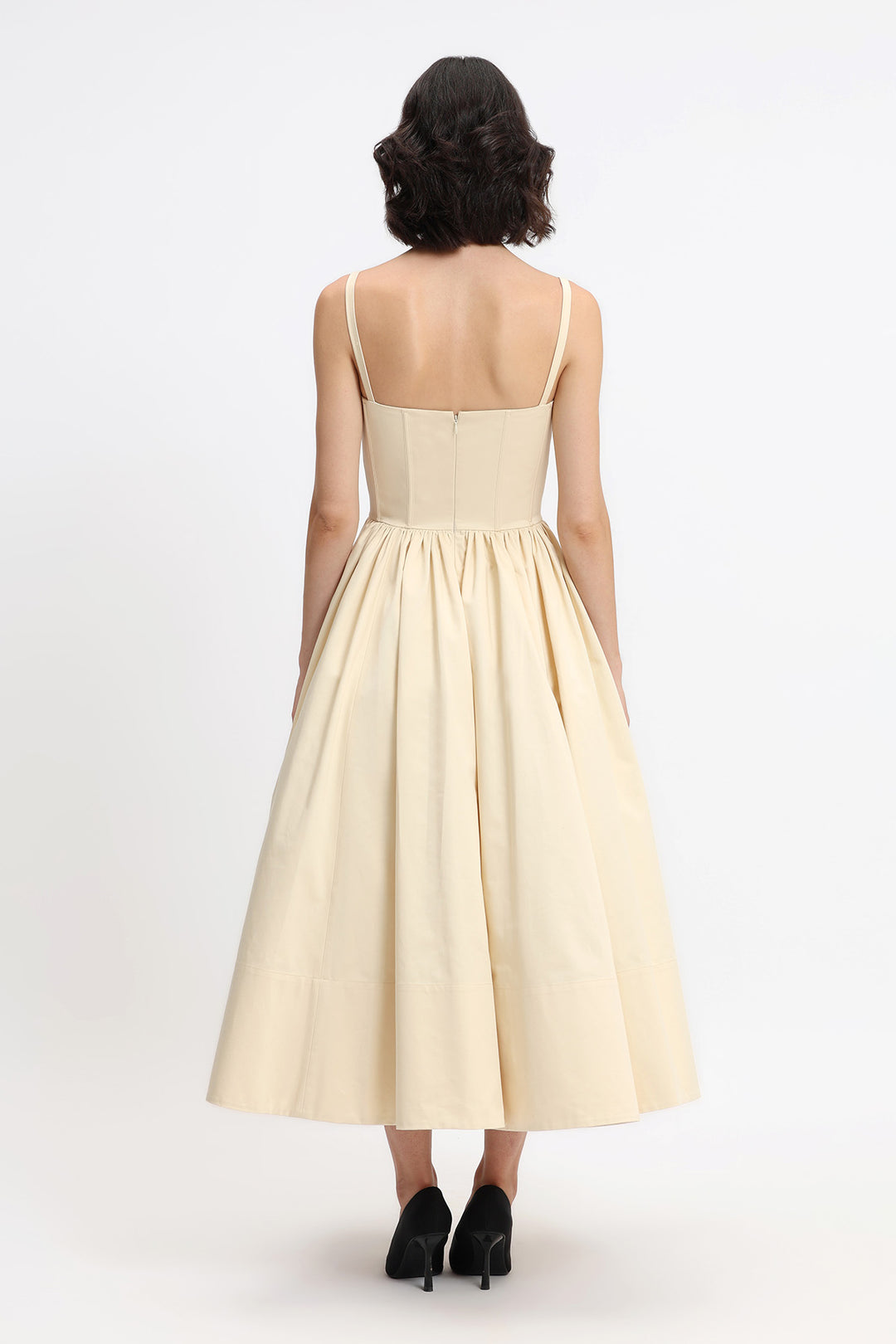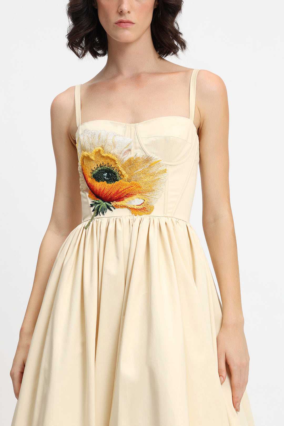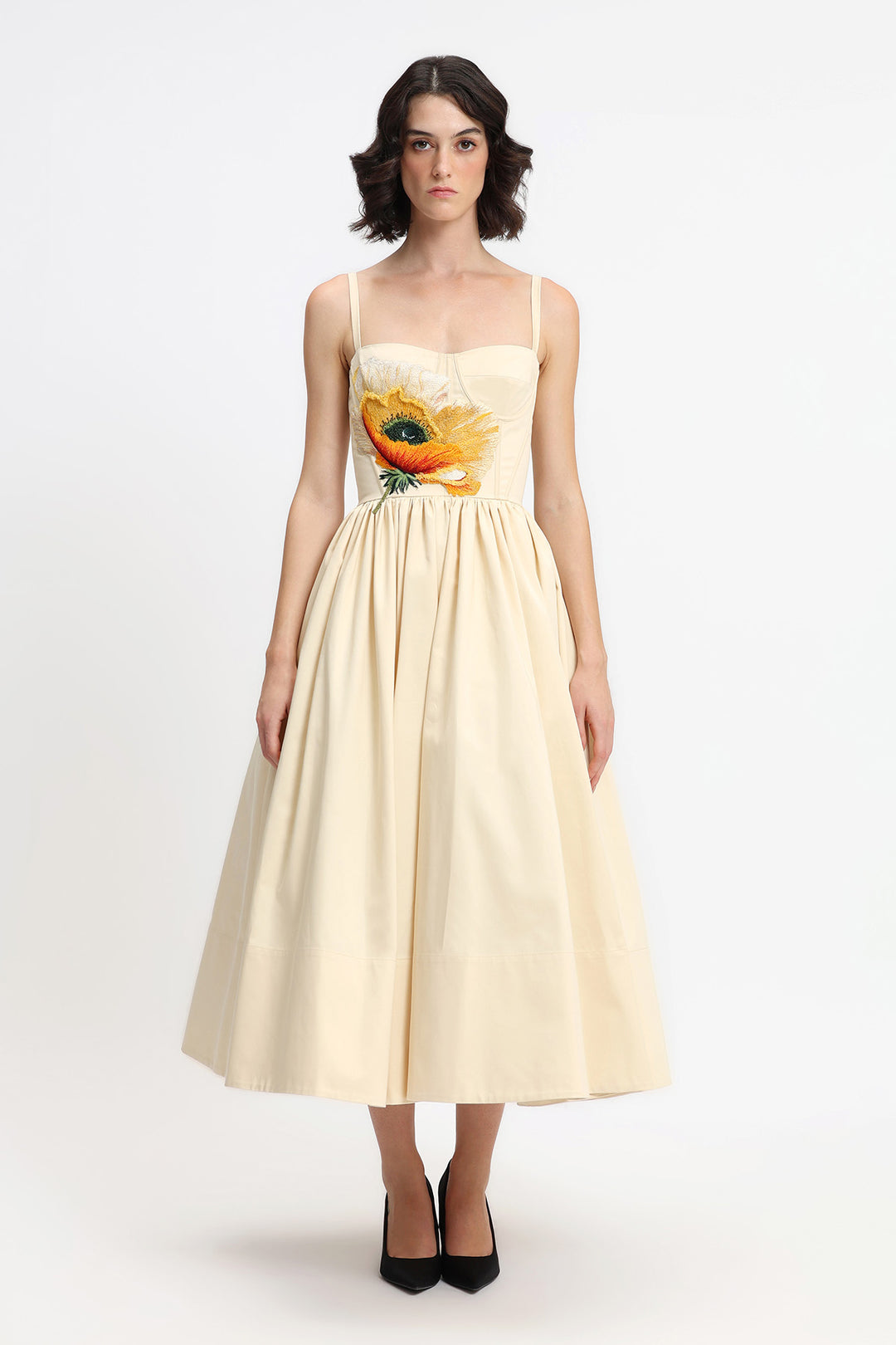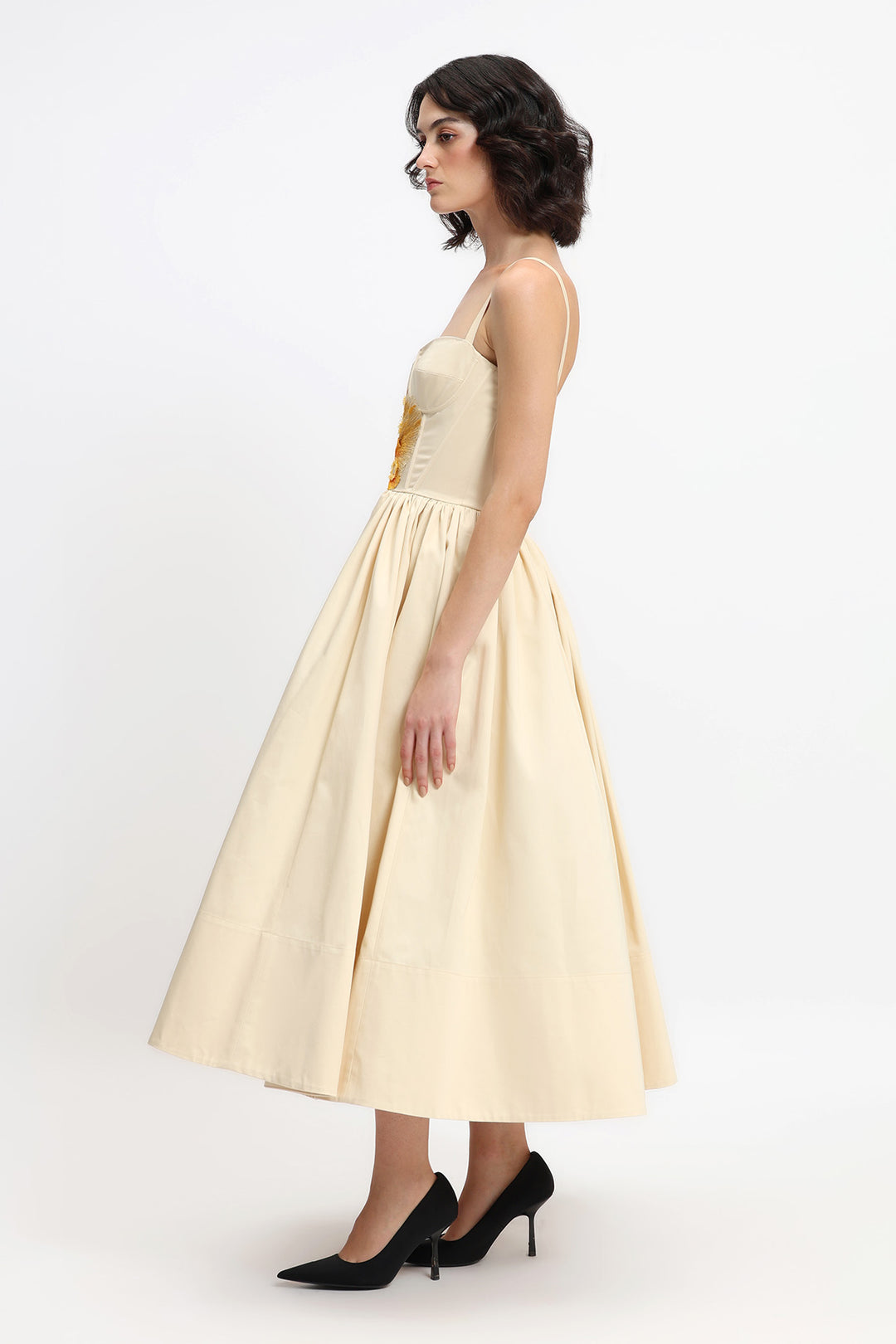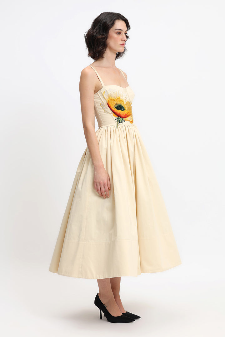 Spaghetti Strap Classic Corseted Midi with Hand Embroidered Flower