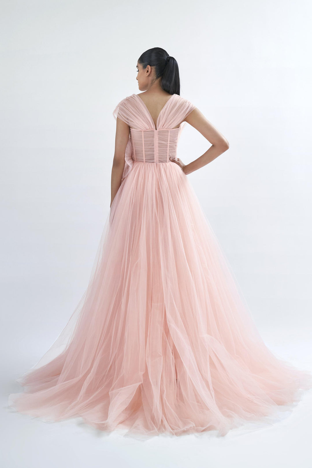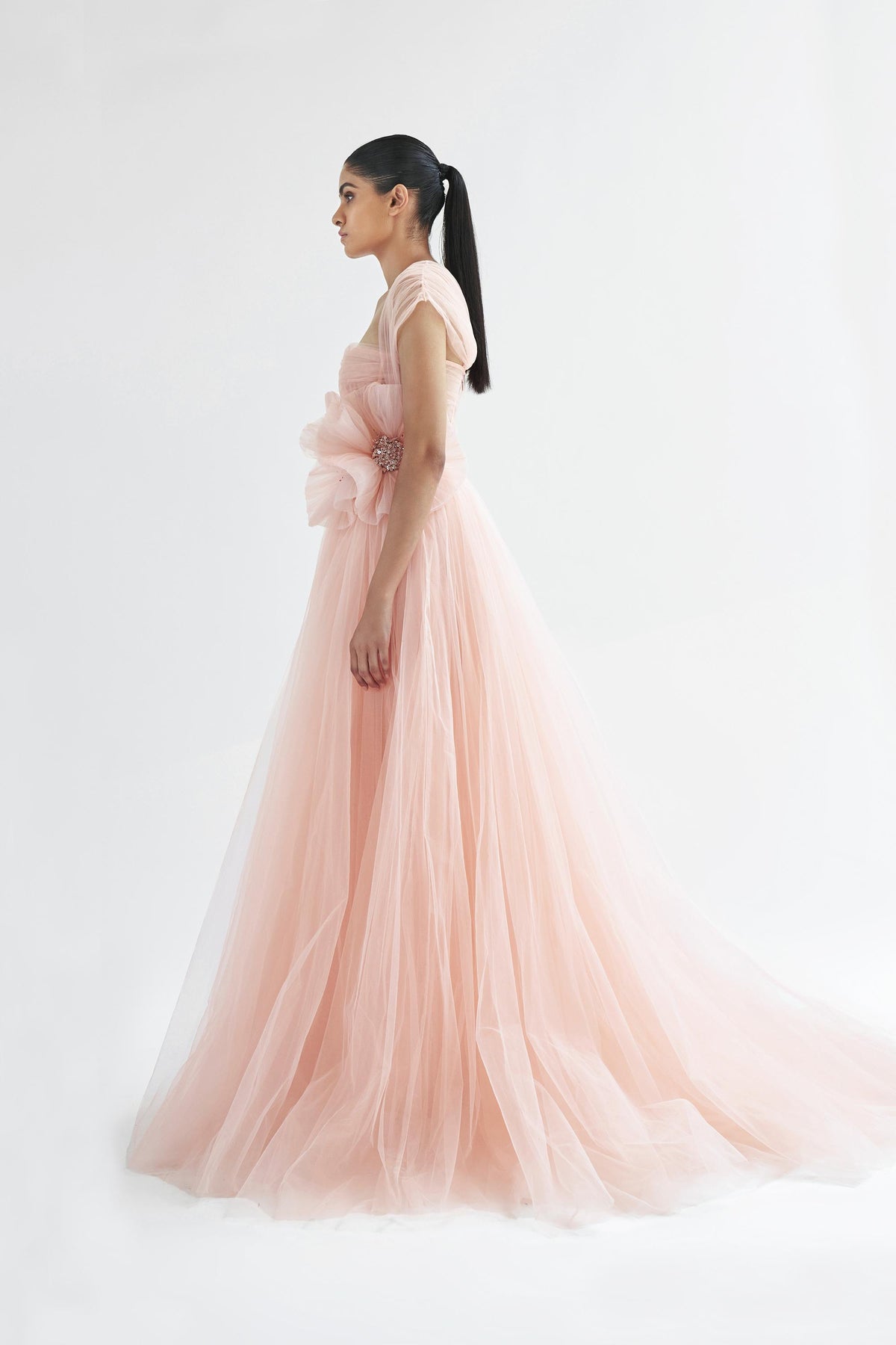 Corsetted tulle gown with gathered straps & sculpted flower