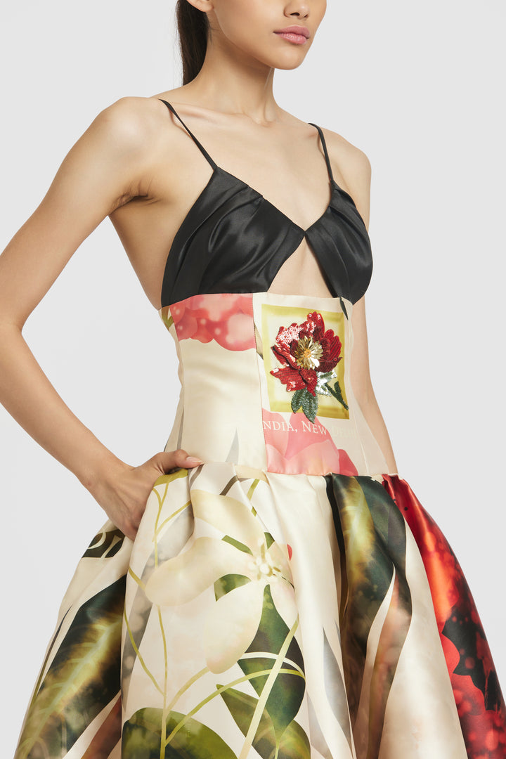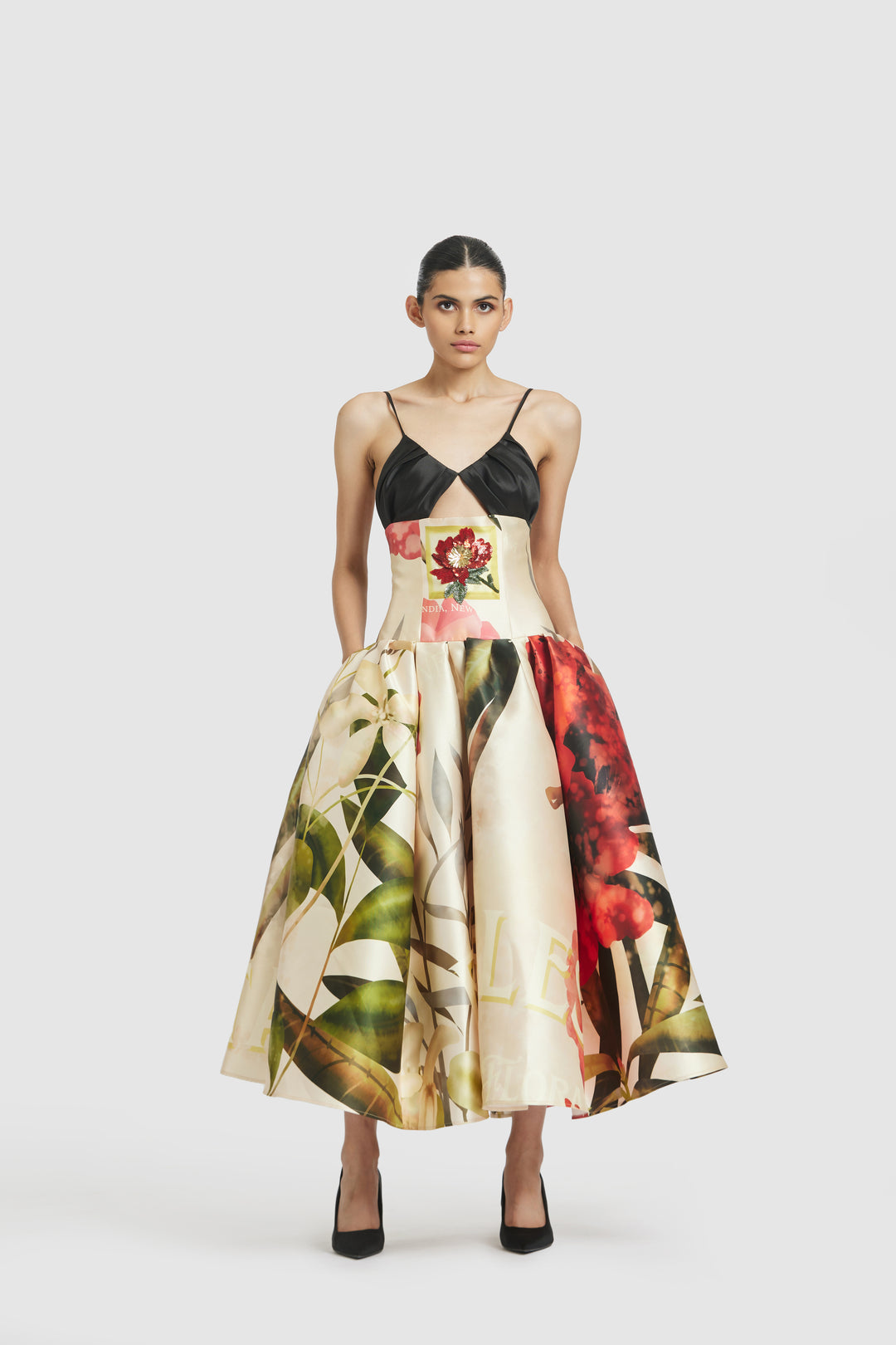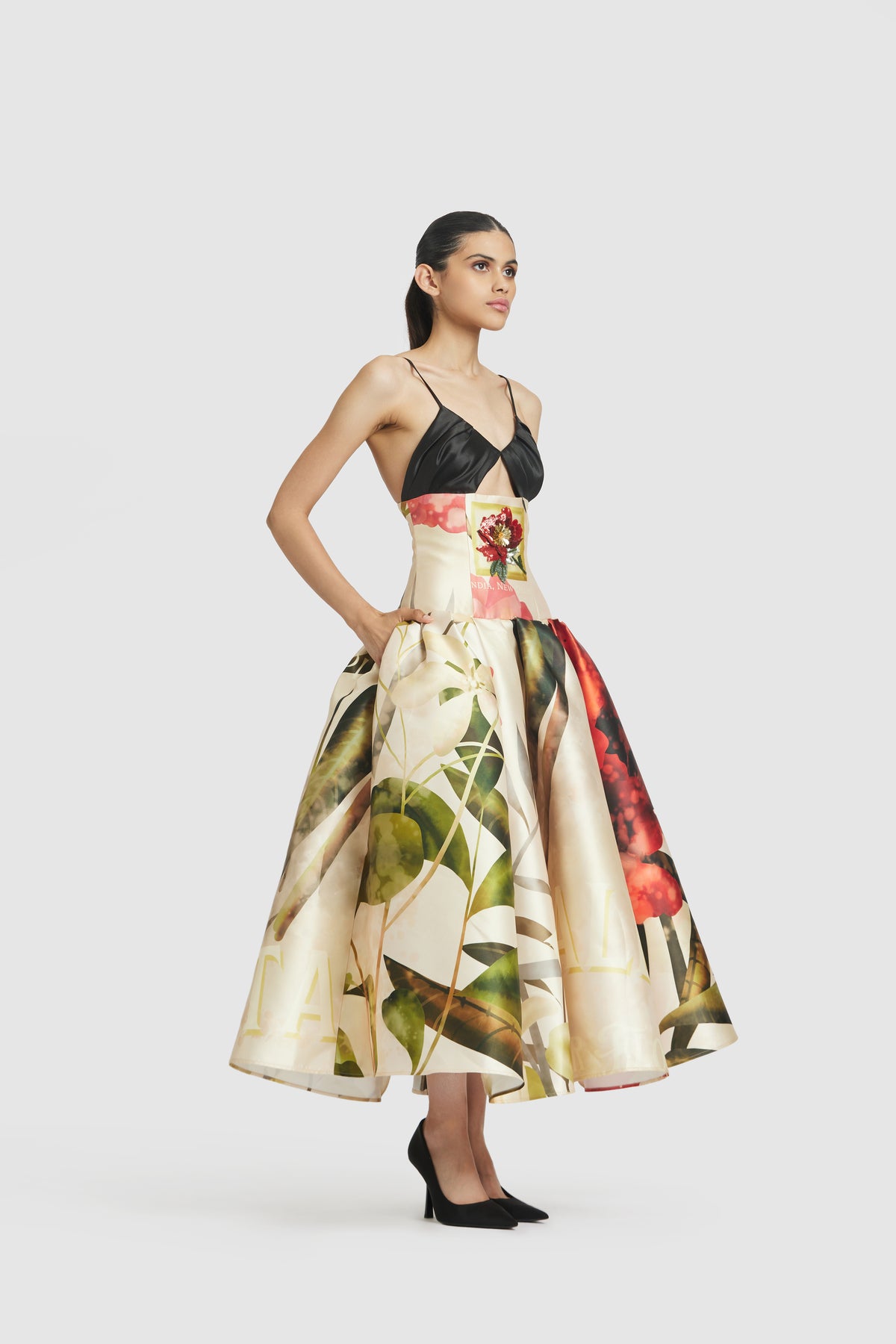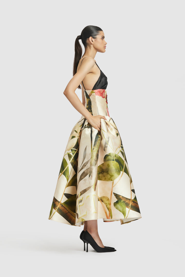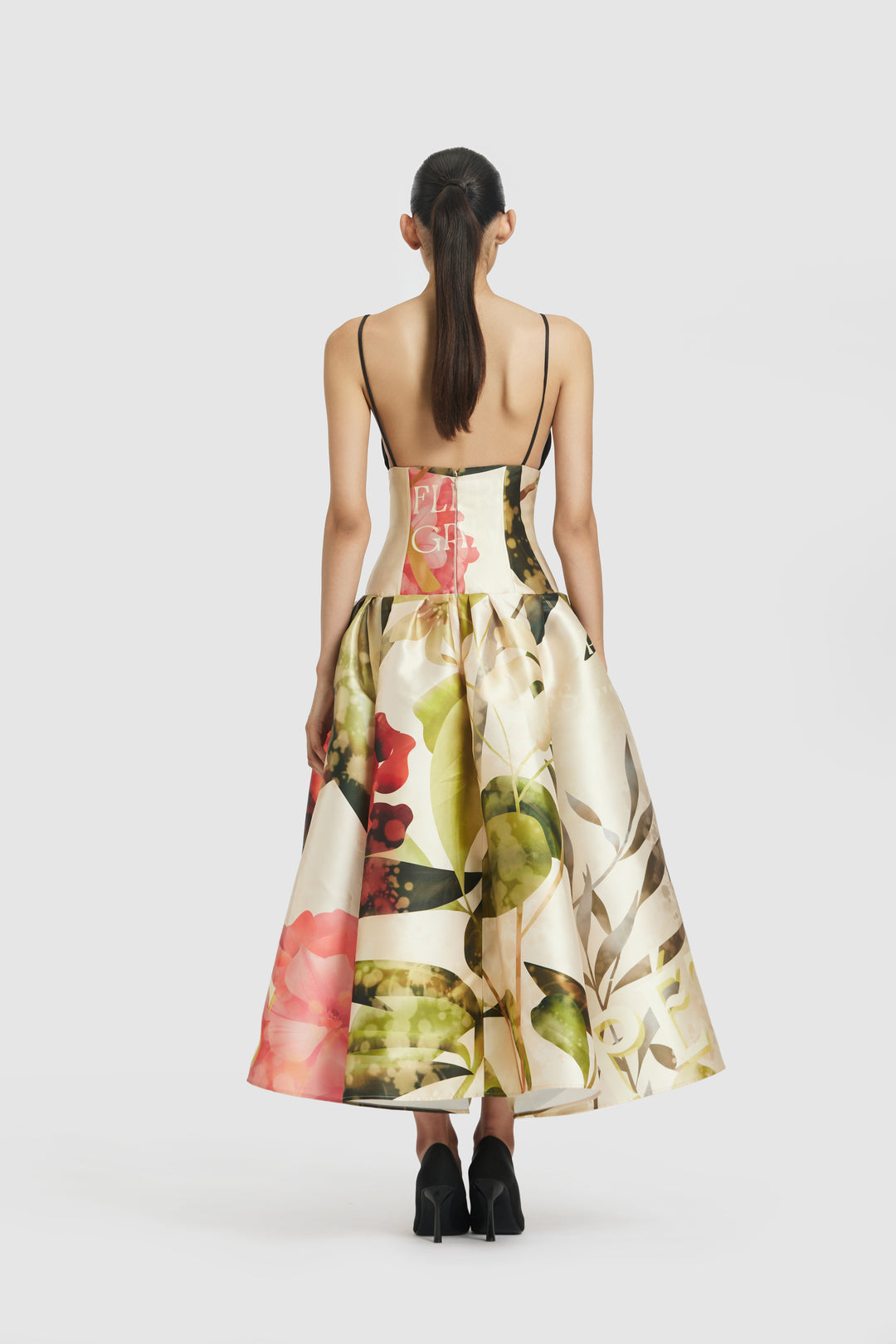 Drop waisted Spaghetti Straps Midi Dress with Botanical Embroidery