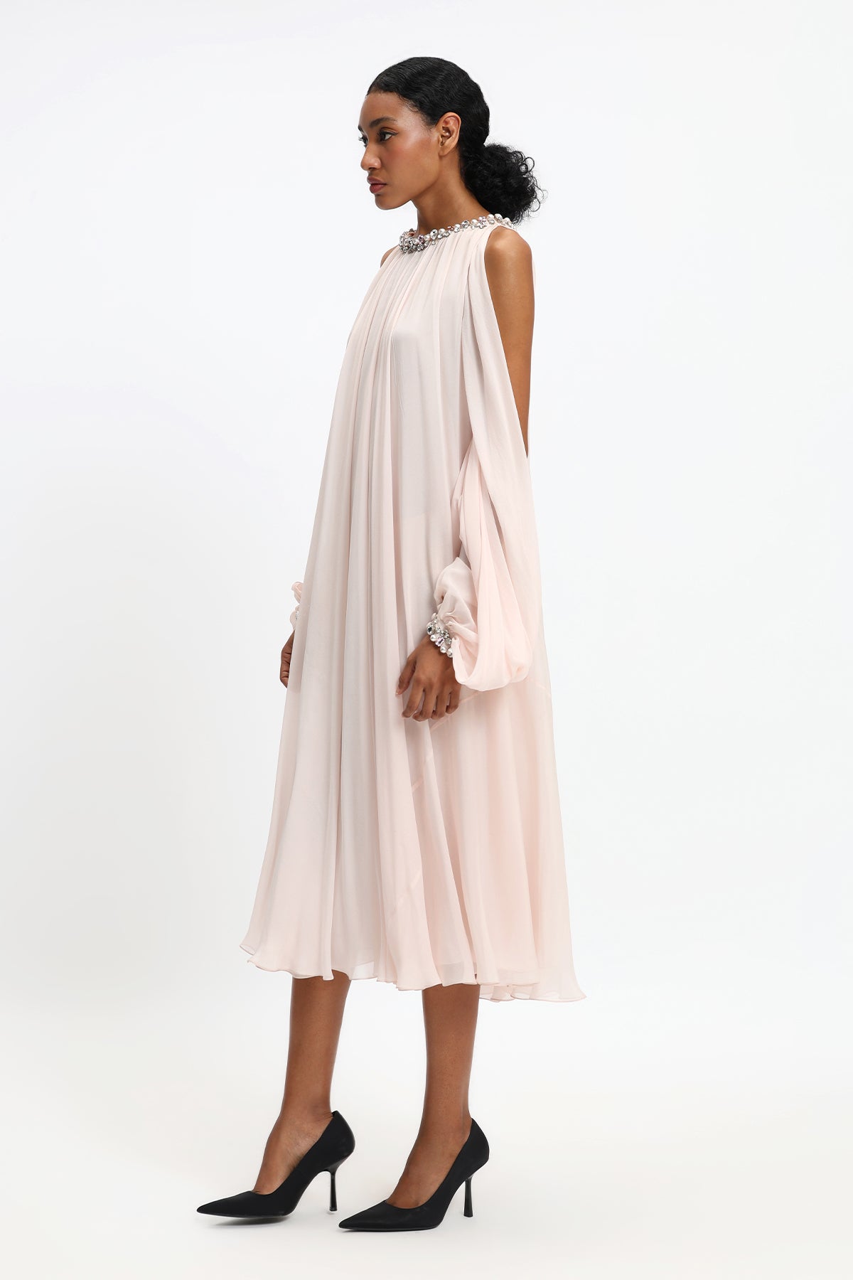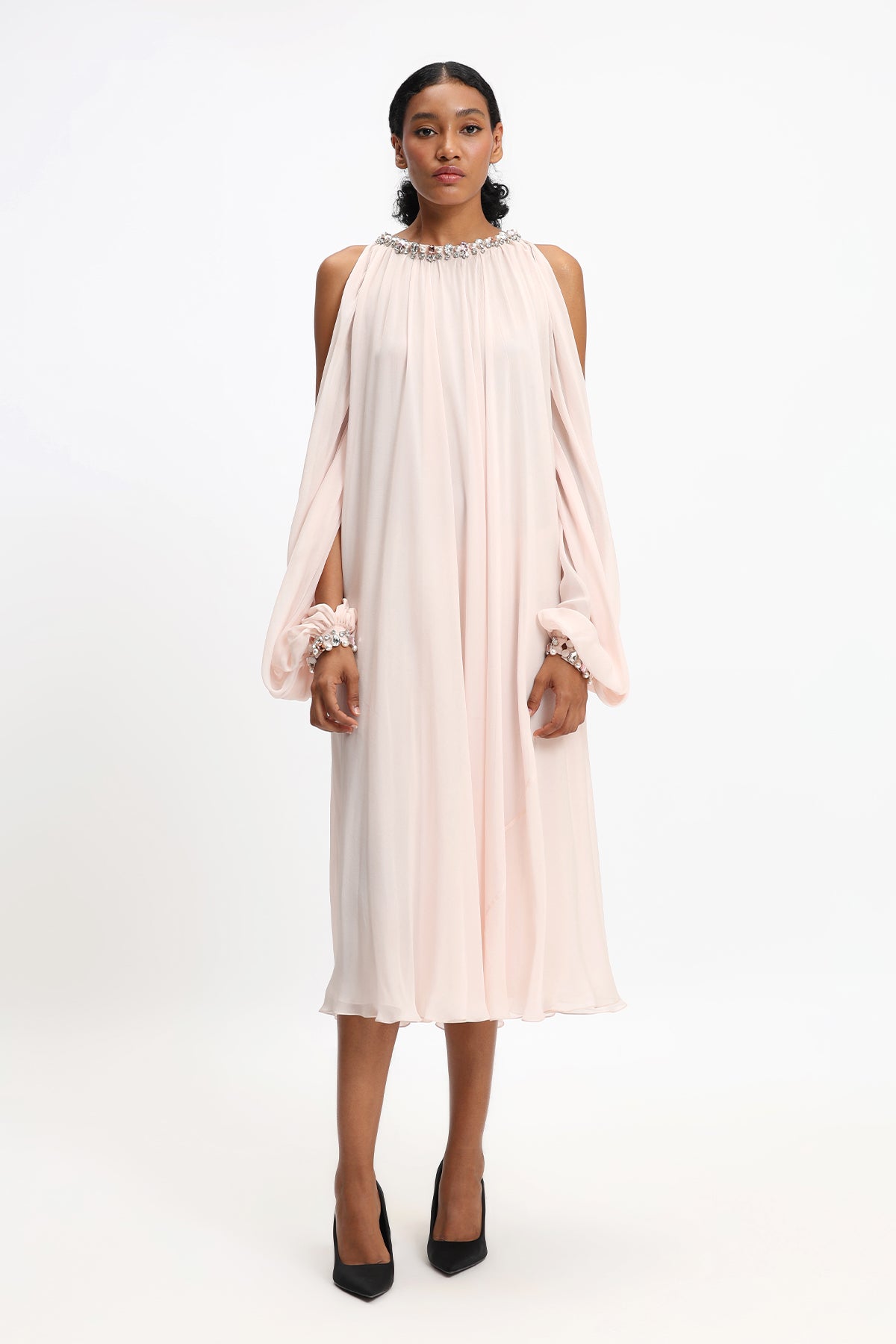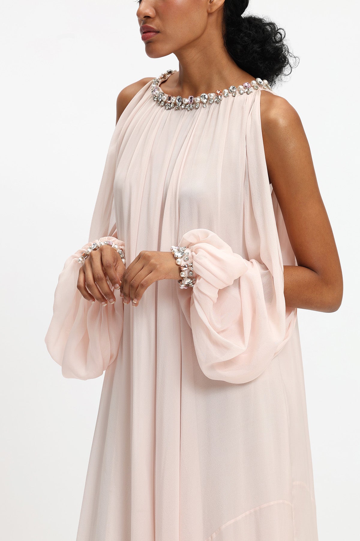 Flowing Chiffon Dress with Slit Sleeves Accentuated with Crystals and Pearls on The Neckline and Cuffs.